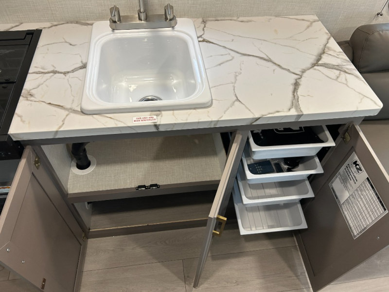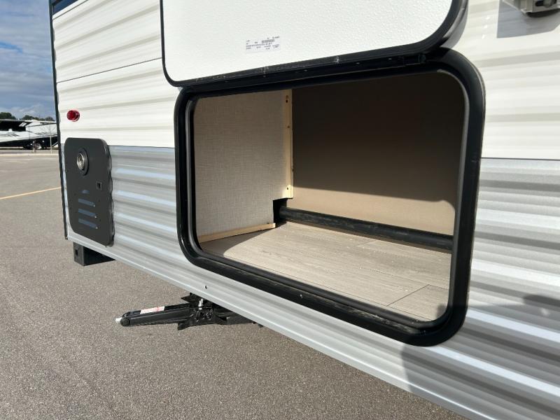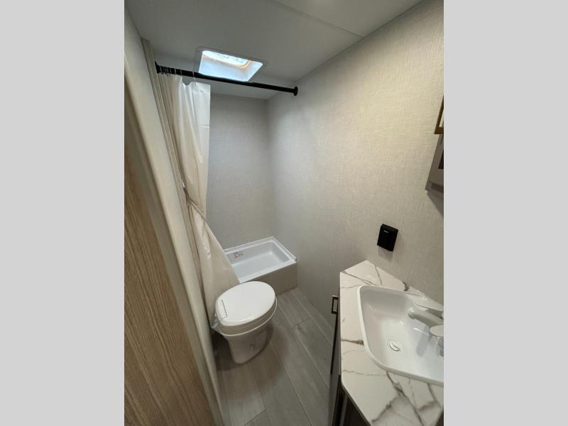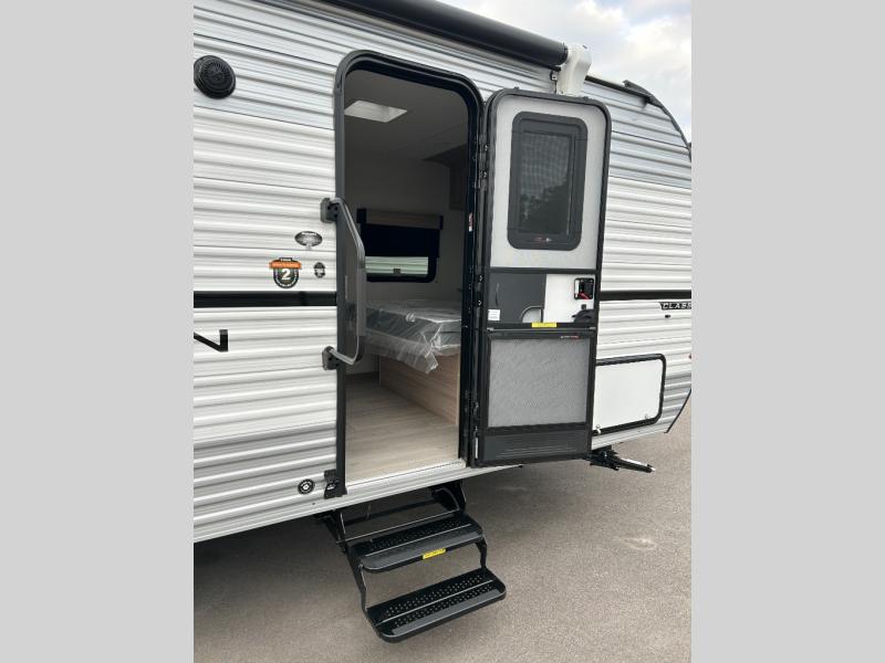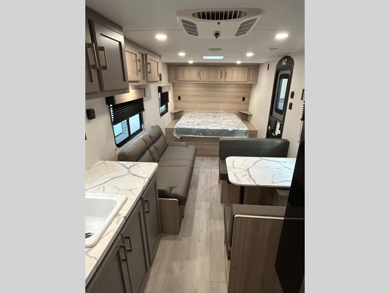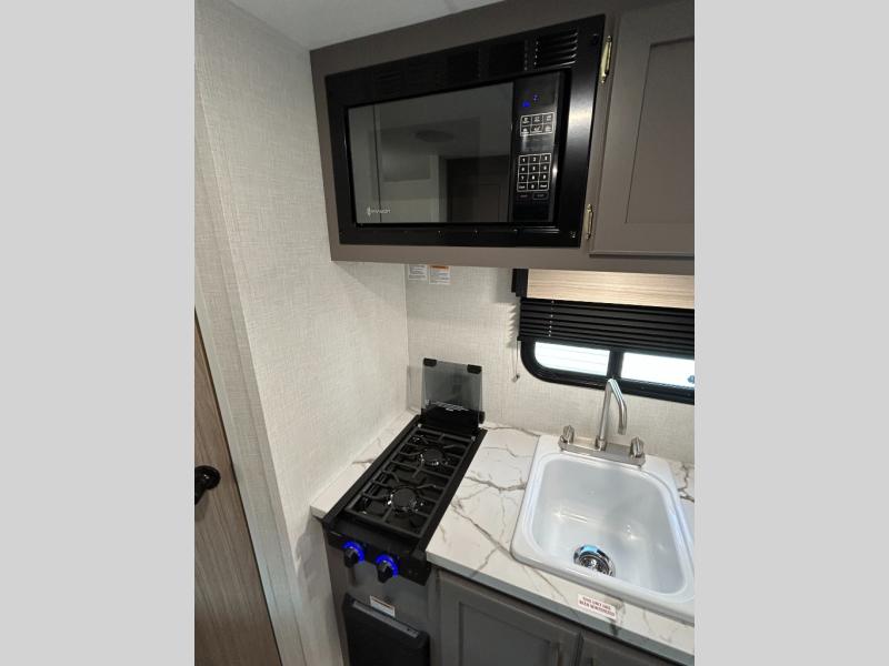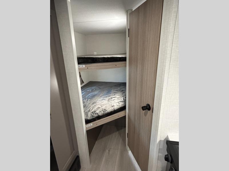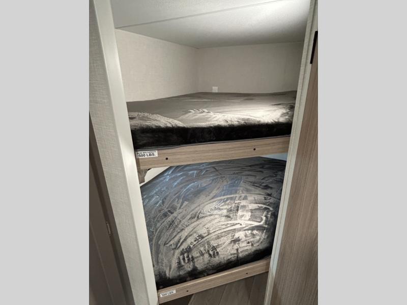 Double-size bunk beds provide ample space for kids or guests, while the front bed offers a cozy retreat for adults and nightstands add a touch of home. The full bathroom is equipped with everything you need to start your day feeling refreshed. The kitchen features an 8 cu refrigerator, two-burner cooktop, and sink, making meal prep easy. Plus, the pantry provides storage for your favorite snacks and ingredients. The jacknife sofa and booth dinette offer comfortable seating for meals, games, or movie nights.