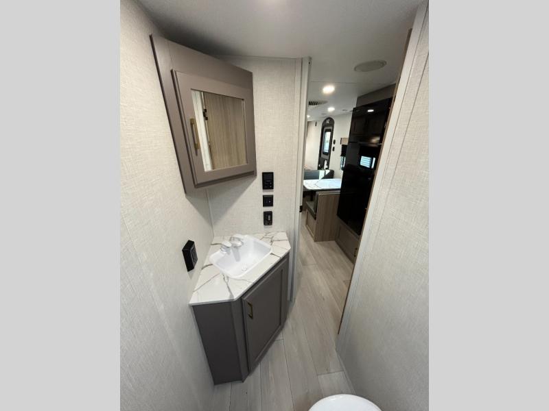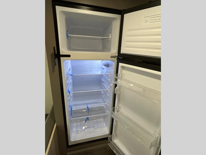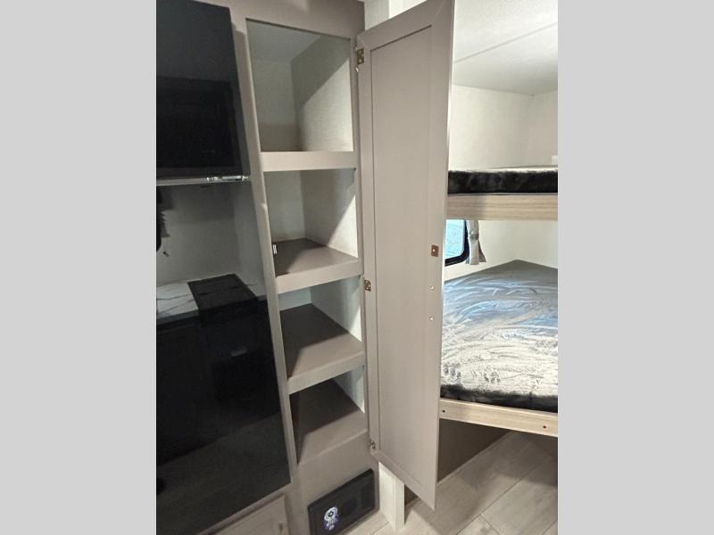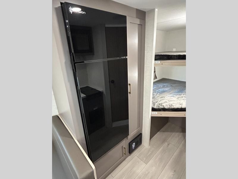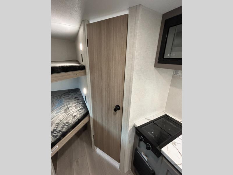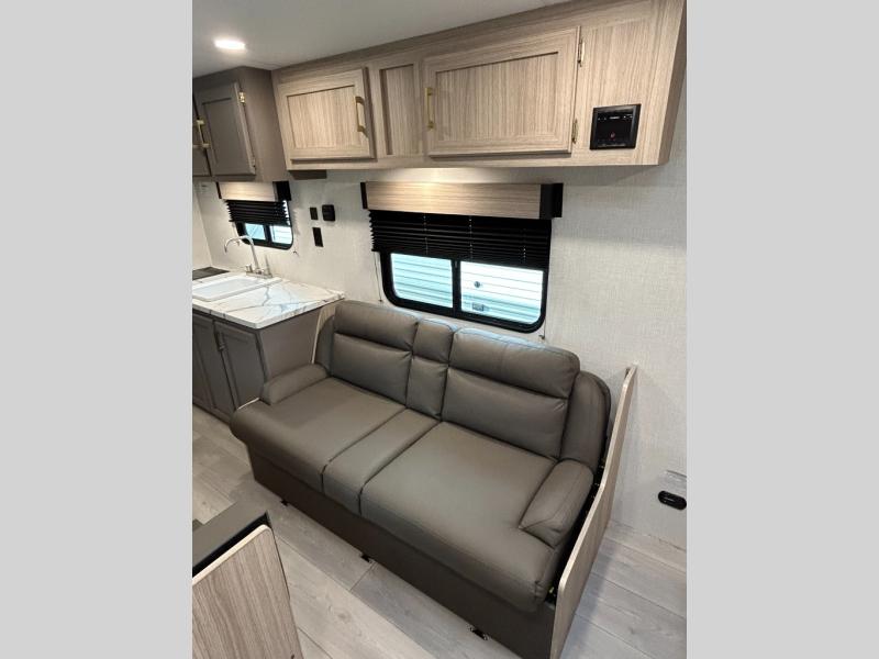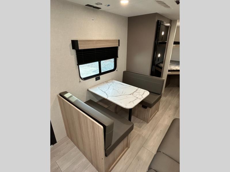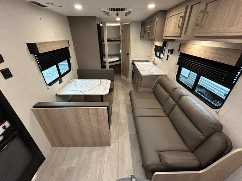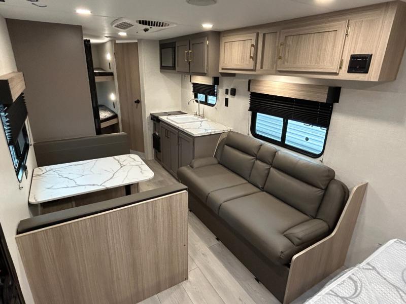 Double-size bunk beds provide ample space for kids or guests, while the front bed offers a cozy retreat for adults and nightstands add a touch of home. The full bathroom is equipped with everything you need to start your day feeling refreshed. The kitchen features an 8 cu refrigerator, two-burner cooktop, and sink, making meal prep easy. Plus, the pantry provides storage for your favorite snacks and ingredients. The jacknife sofa and booth dinette offer comfortable seating for meals, games, or movie nights.