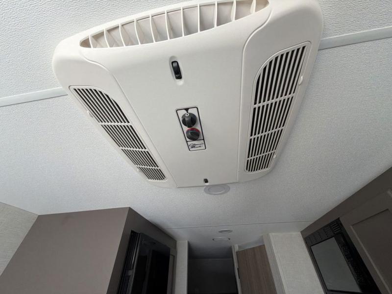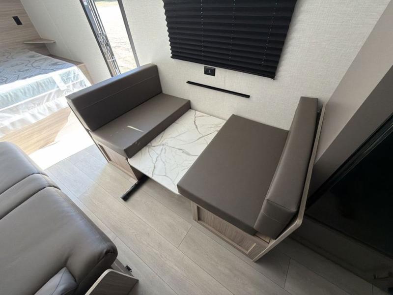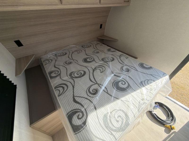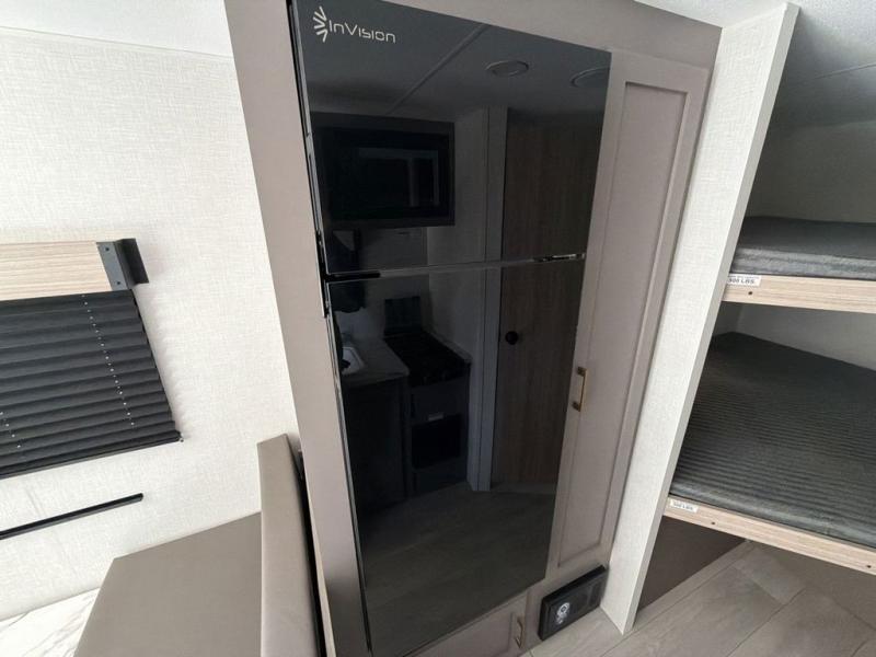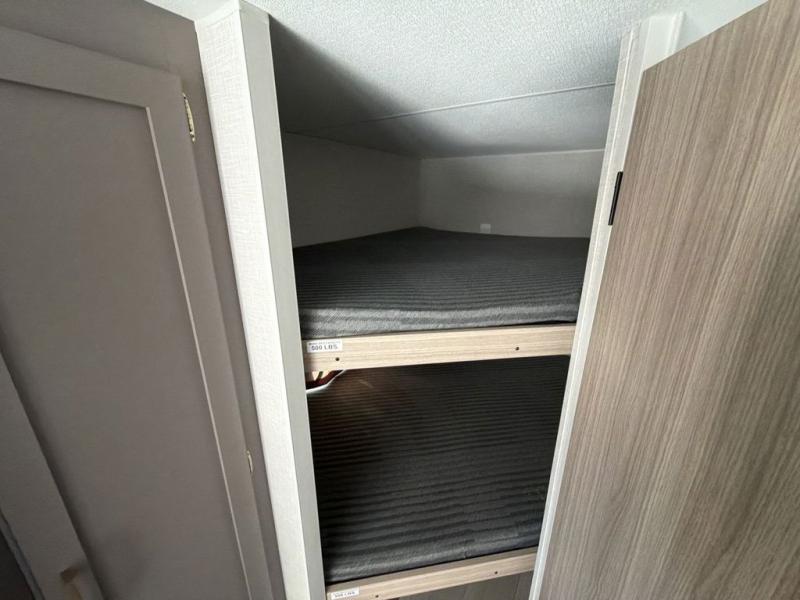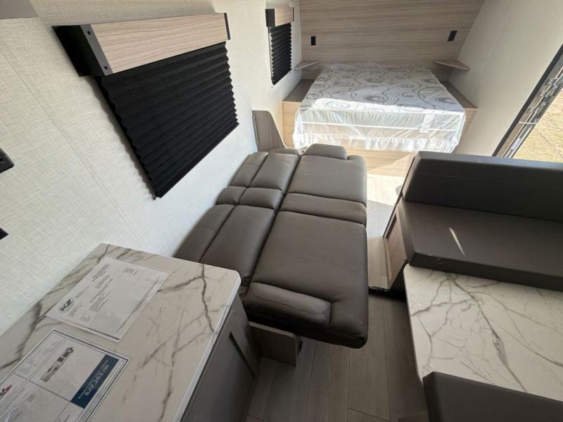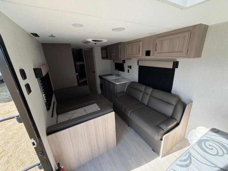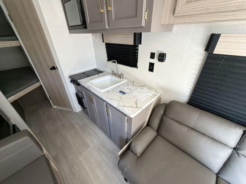 Double-size bunk beds provide ample space for kids or guests, while the front bed offers a cozy retreat for adults and nightstands add a touch of home. The full bathroom is equipped with everything you need to start your day feeling refreshed. The kitchen features an 8 cu refrigerator, two-burner cooktop, and sink, making meal prep easy. Plus, the pantry provides storage for your favorite snacks and ingredients. The jacknife sofa and booth dinette offer comfortable seating for meals, games, or movie nights.