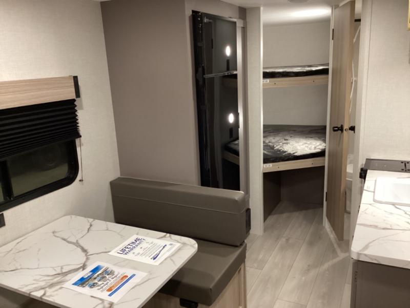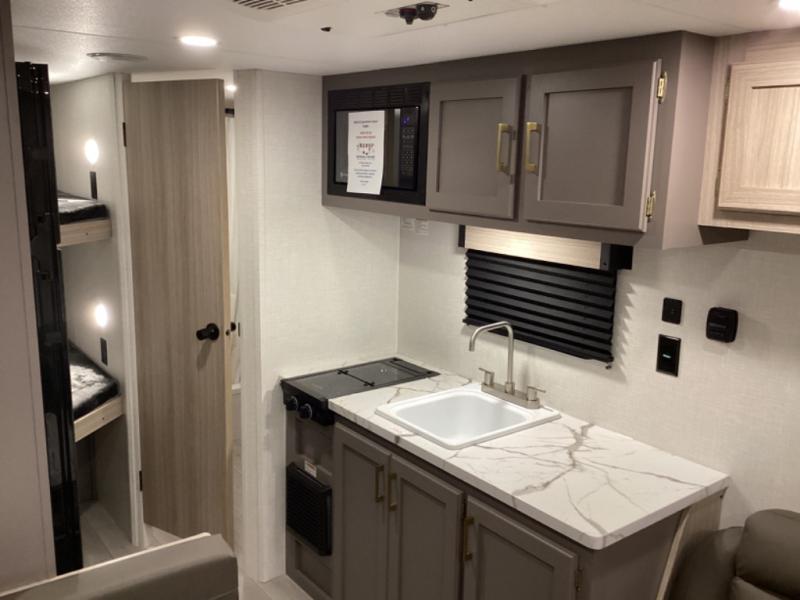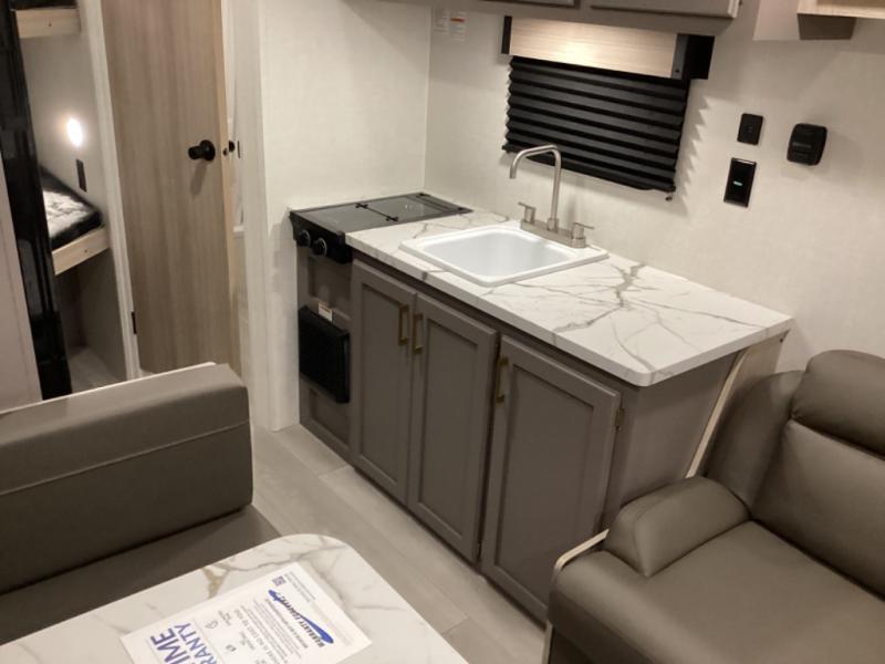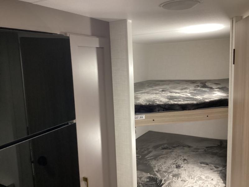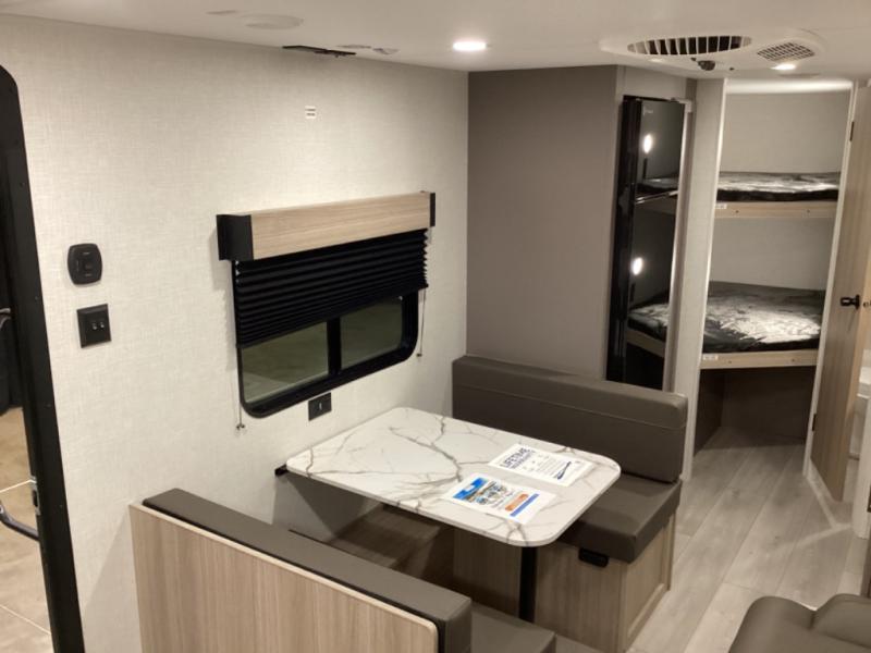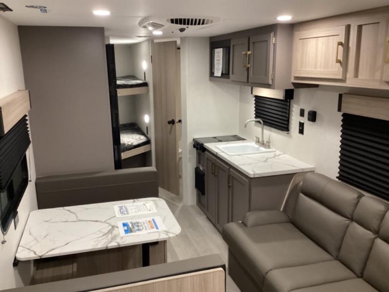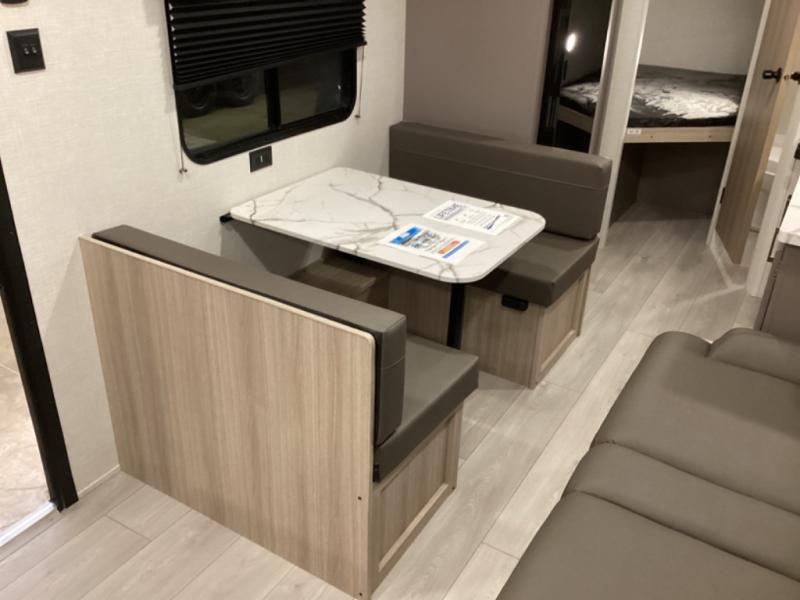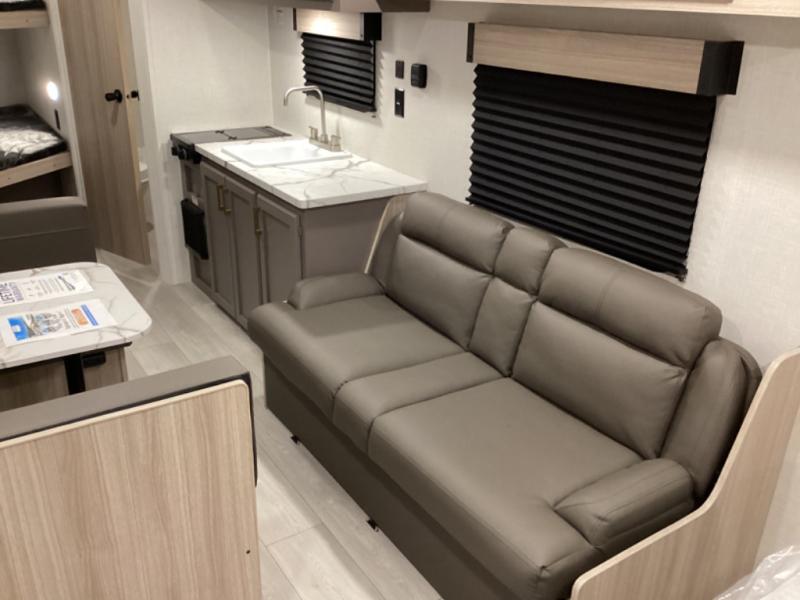 Double-size bunk beds provide ample space for kids or guests, while the front bed offers a cozy retreat for adults and nightstands add a touch of home. The full bathroom is equipped with everything you need to start your day feeling refreshed. The kitchen features an 8 cu refrigerator, two-burner cooktop, and sink, making meal prep easy. Plus, the pantry provides storage for your favorite snacks and ingredients. The jacknife sofa and booth dinette offer comfortable seating for meals, games, or movie nights.