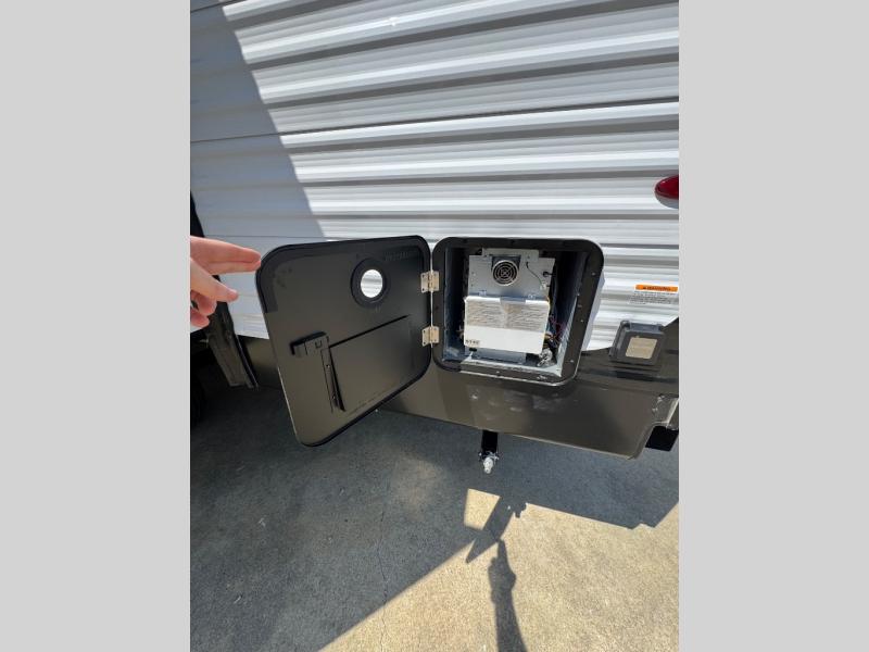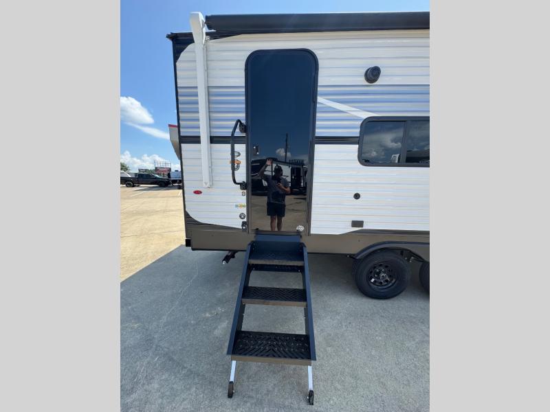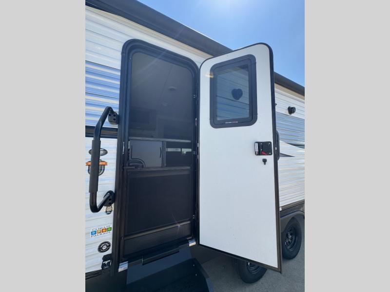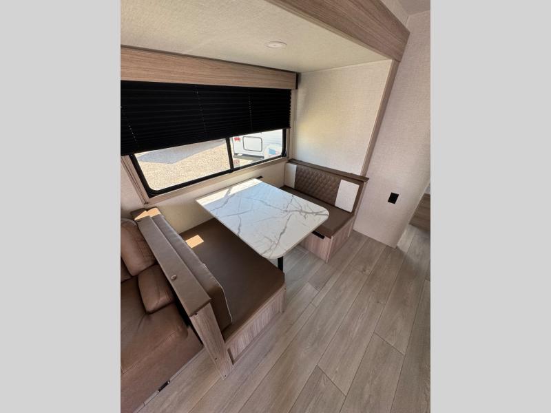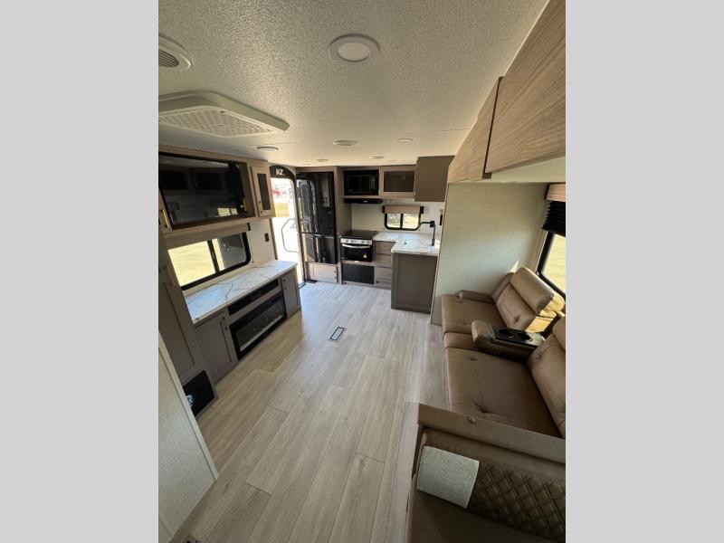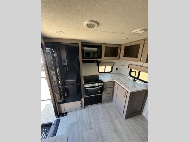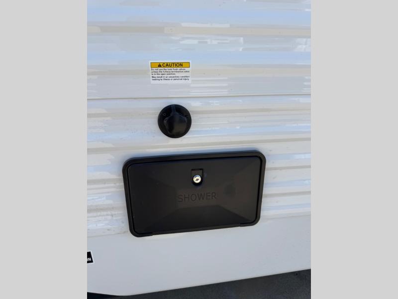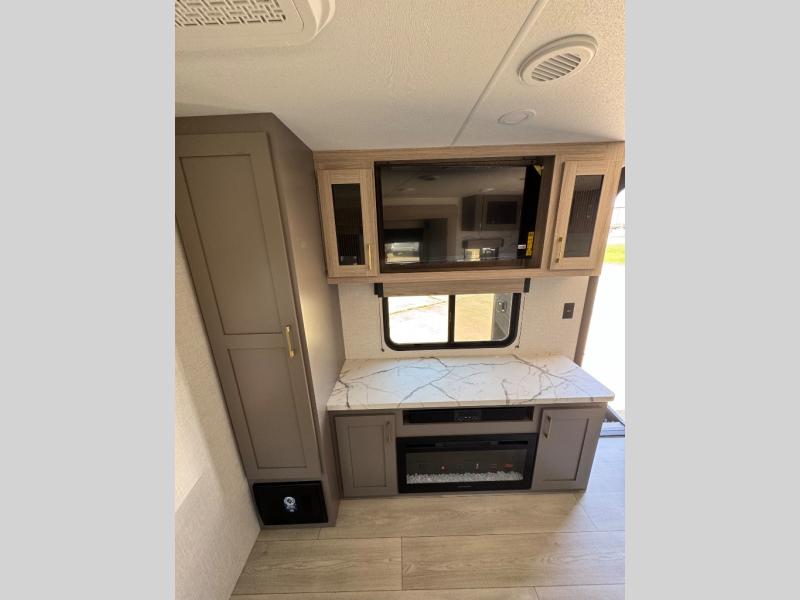 You will love the amount of interior space you have in this travel trailer thanks to the large slide out and rear kitchen with plenty of counter space. There is a 70" sofa and 42" booth dinette within the slide out across from the entertainment center, and you can add the optional 30" fireplace here for more comfort. The full bath includes a bath shelf with towel hooks, plus a foot-flush toilet for convenience. You will feel right at home in the front private bedroom that includes a queen bed, dual shirt closets, plus a TV mount if you choose to bring along a television.