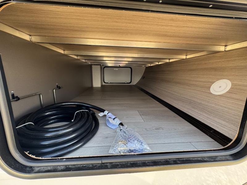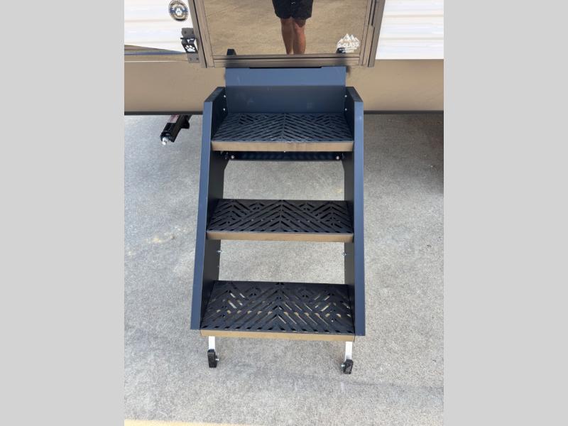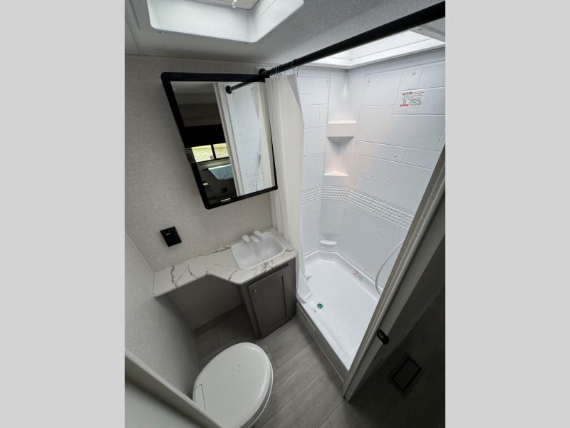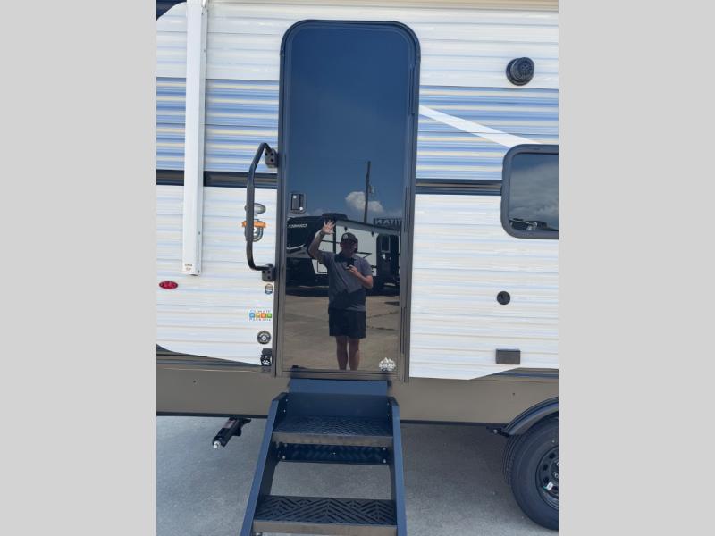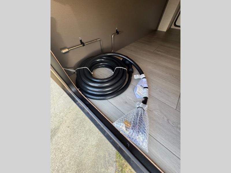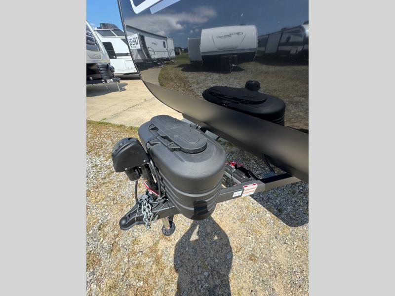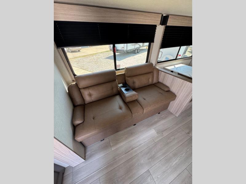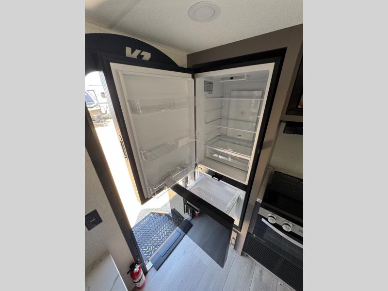 You will love the amount of interior space you have in this travel trailer thanks to the large slide out and rear kitchen with plenty of counter space. There is a 70" sofa and 42" booth dinette within the slide out across from the entertainment center, and you can add the optional 30" fireplace here for more comfort. The full bath includes a bath shelf with towel hooks, plus a foot-flush toilet for convenience. You will feel right at home in the front private bedroom that includes a queen bed, dual shirt closets, plus a TV mount if you choose to bring along a television.