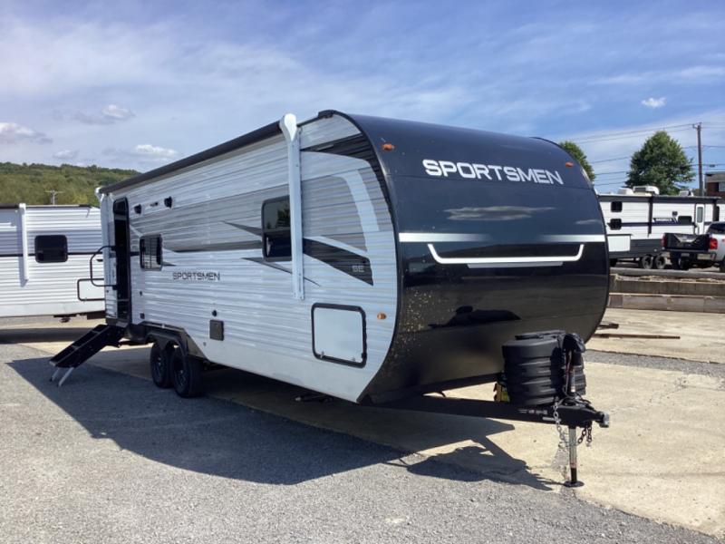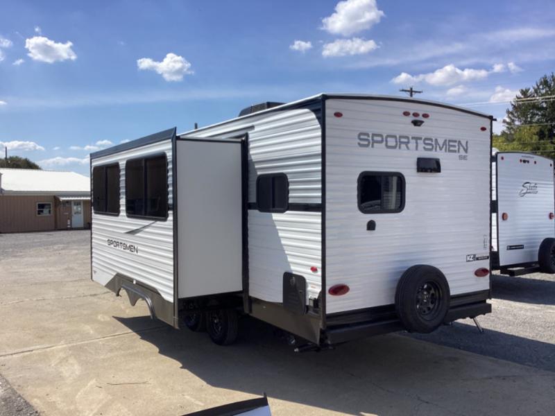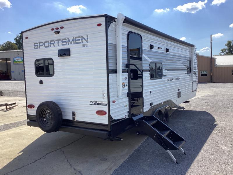 Each Sportsmen SE travel trailer by KZ is constructed with KZ exclusive tough shield exterior metal, a one-piece seamless walk-on Tufflex roofing material, and diamond plate rock guard to protect your unit from road debris. You will appreciate the extra large baggage doors for stowing away your gear when not in use, and tinted windows to help keep the harmful sun rays out plus keeping it cooler inside. Some of the exterior conveniences found in the mandatory Advantage Package are the solid folding steps with a large folding grab handle for easy entry and exit, a full glass friction hinged entry door, plus an exterior shower for your pets or to rinse off before you head inside. You'll also appreciate the nitrogen-filled tires, solar and backup camera prep, plus a Leash Latch with a bonus beverage opener. You'll feel right at home inside with linoleum flooring throughout, a 13,500 BTU air conditioner, large overhead cabinets, a shower surround, and much more!