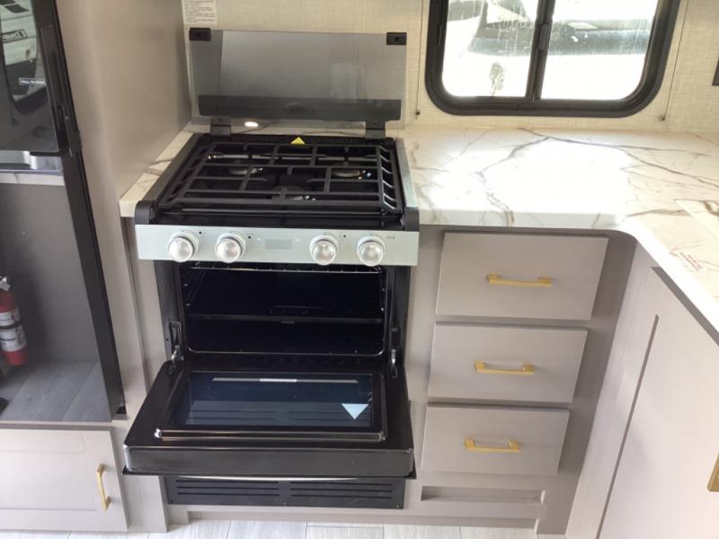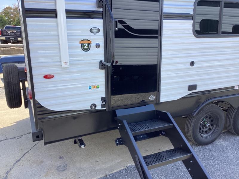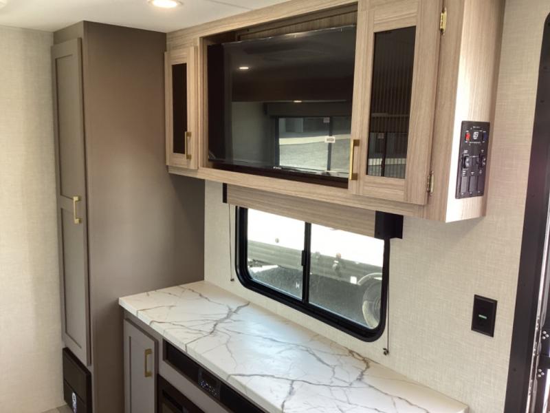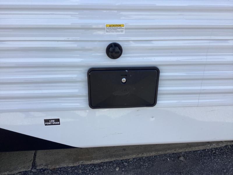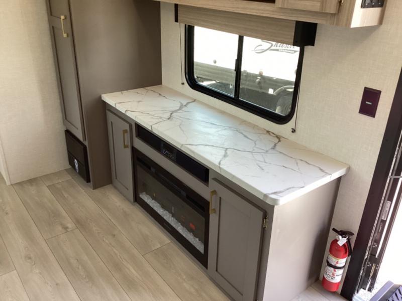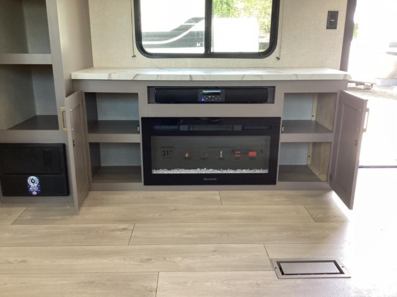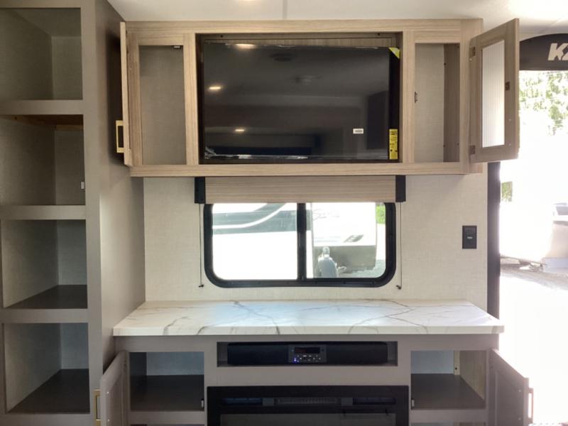 You will love the amount of interior space you have in this travel trailer thanks to the large slide out and rear kitchen with plenty of counter space. There is a 70" sofa and 42" booth dinette within the slide out across from the entertainment center, and you can add the optional 30" fireplace here for more comfort. The full bath includes a bath shelf with towel hooks, plus a foot-flush toilet for convenience. You will feel right at home in the front private bedroom that includes a queen bed, dual shirt closets, plus a TV mount if you choose to bring along a television.