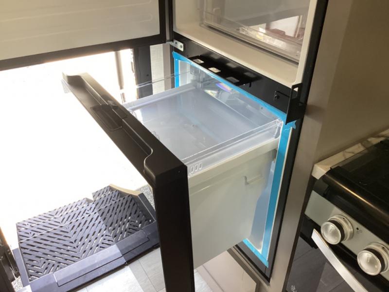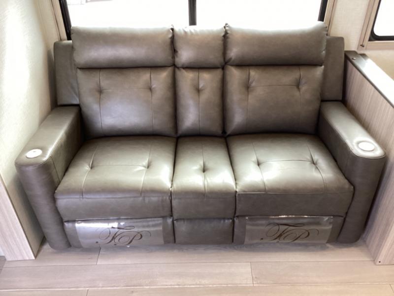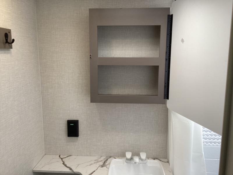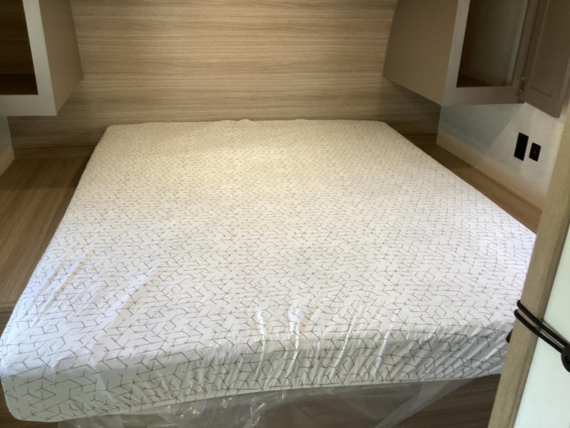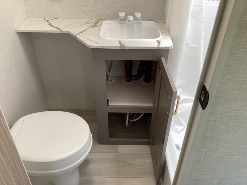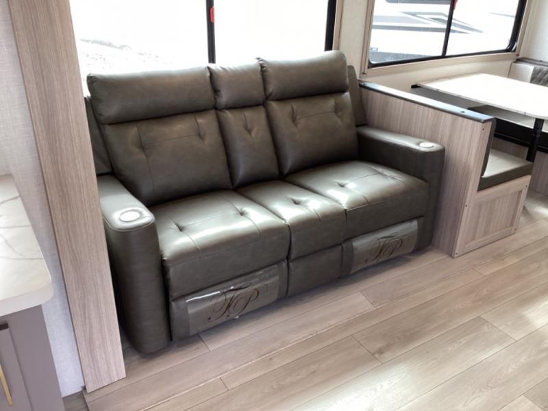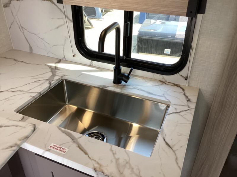 You will love the amount of interior space you have in this travel trailer thanks to the large slide out and rear kitchen with plenty of counter space. There is a 70" sofa and 42" booth dinette within the slide out across from the entertainment center, and you can add the optional 30" fireplace here for more comfort. The full bath includes a bath shelf with towel hooks, plus a foot-flush toilet for convenience. You will feel right at home in the front private bedroom that includes a queen bed, dual shirt closets, plus a TV mount if you choose to bring along a television.