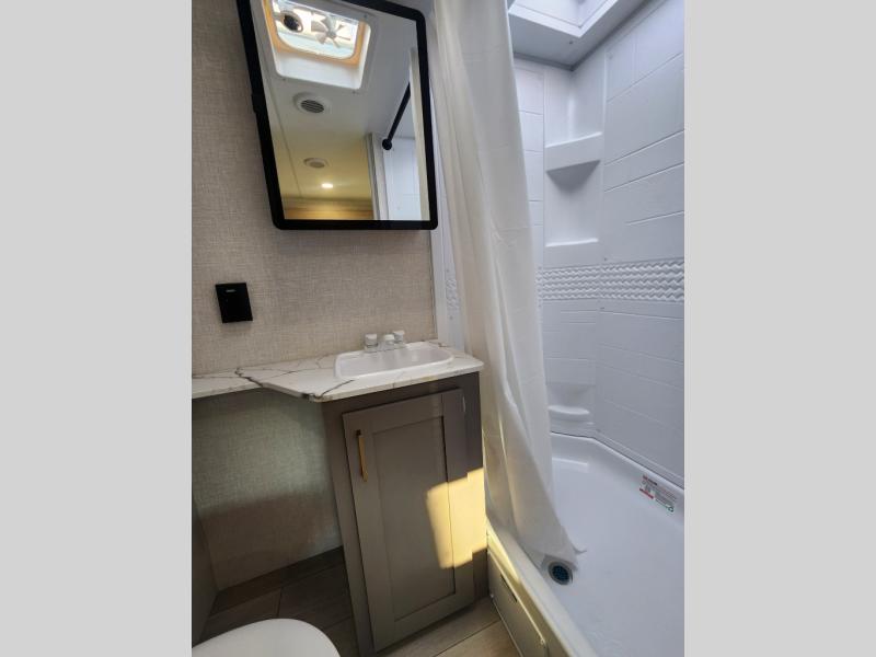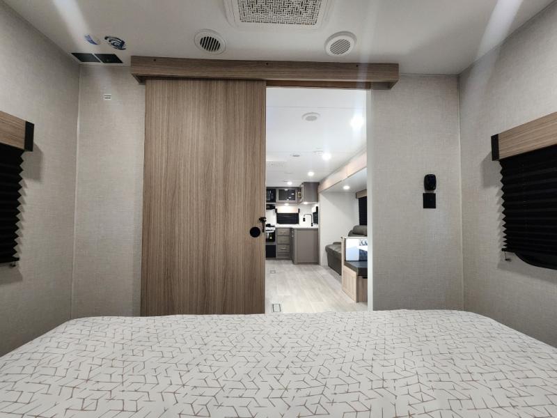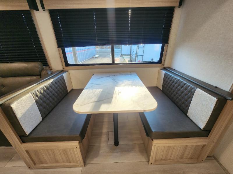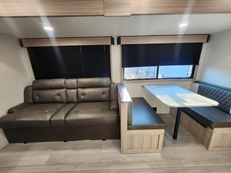 You will love the amount of interior space you have in this travel trailer thanks to the large slide out and rear kitchen with plenty of counter space. There is a 70" sofa and 42" booth dinette within the slide out across from the entertainment center, and you can add the optional 30" fireplace here for more comfort. The full bath includes a bath shelf with towel hooks, plus a foot-flush toilet for convenience. You will feel right at home in the front private bedroom that includes a queen bed, dual shirt closets, plus a TV mount if you choose to bring along a television.