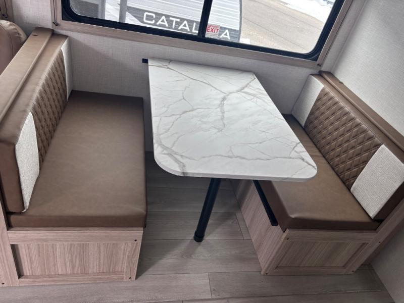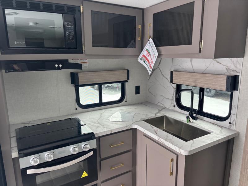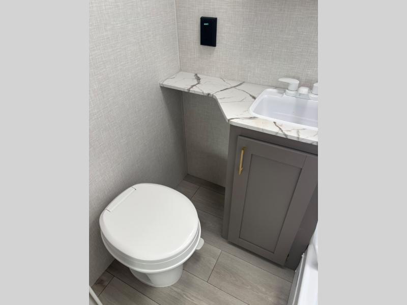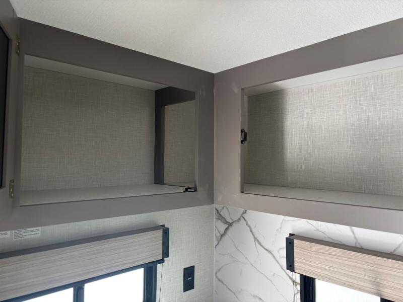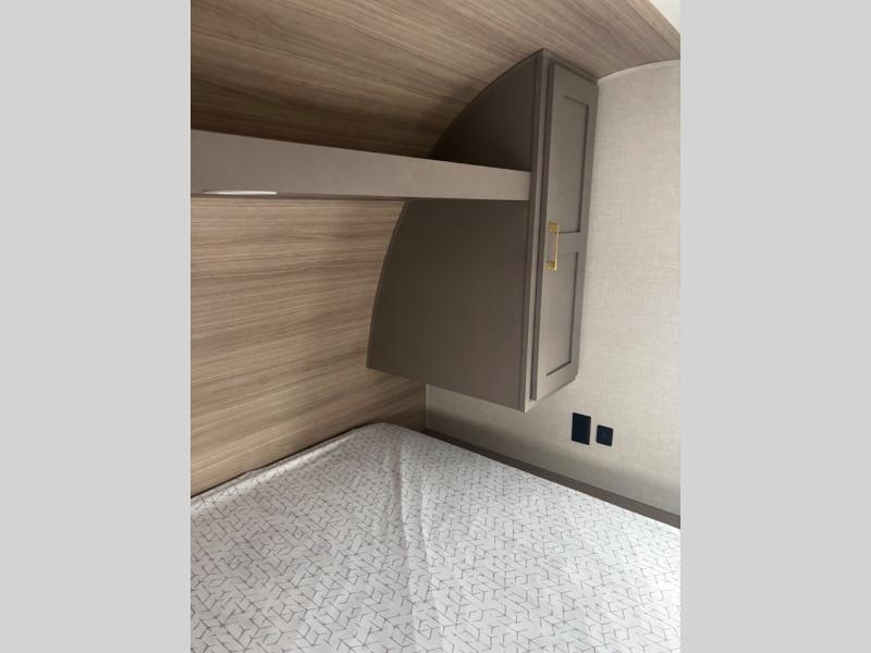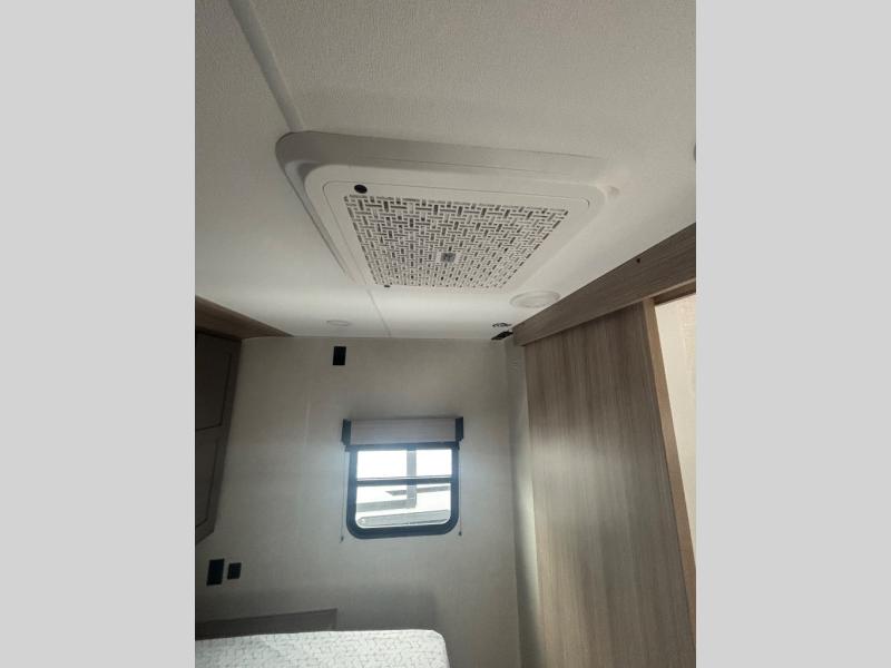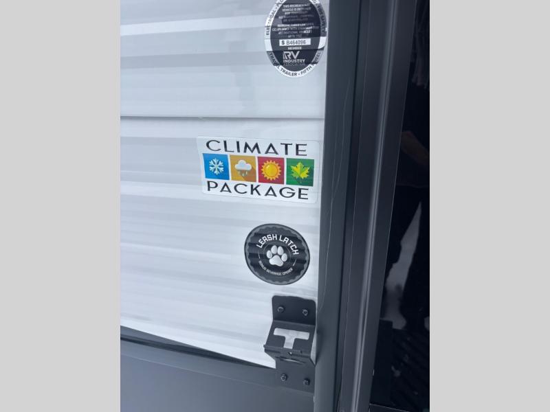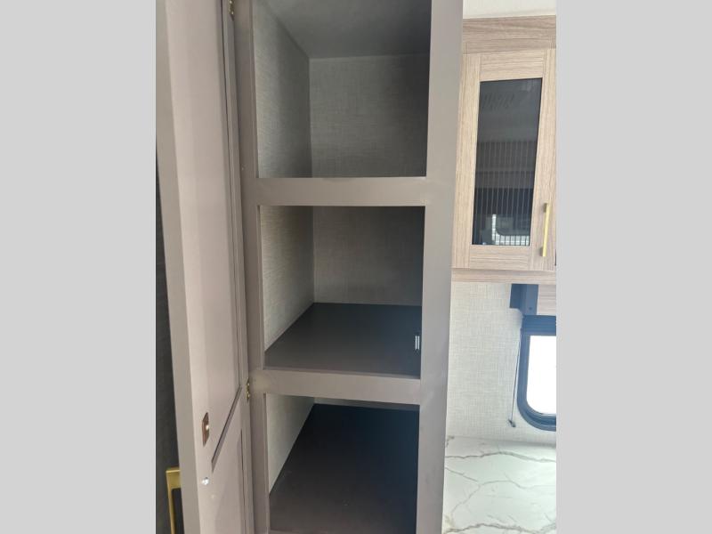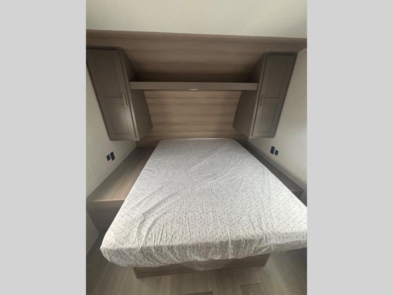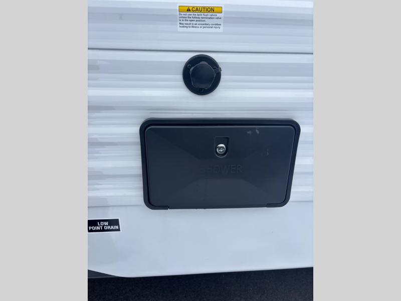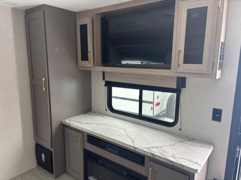 You will love the amount of interior space you have in this travel trailer thanks to the large slide out and rear kitchen with plenty of counter space. There is a 70" sofa and 42" booth dinette within the slide out across from the entertainment center, and you can add the optional 30" fireplace here for more comfort. The full bath includes a bath shelf with towel hooks, plus a foot-flush toilet for convenience. You will feel right at home in the front private bedroom that includes a queen bed, dual shirt closets, plus a TV mount if you choose to bring along a television.
