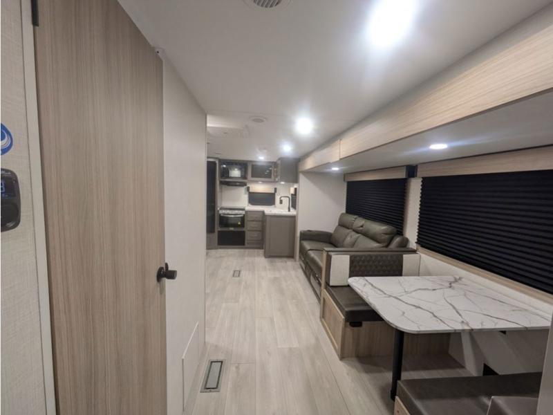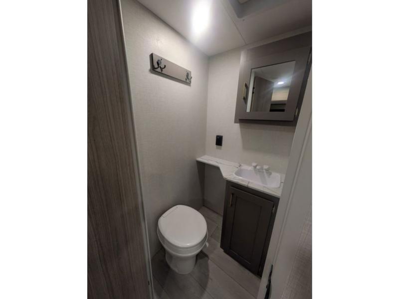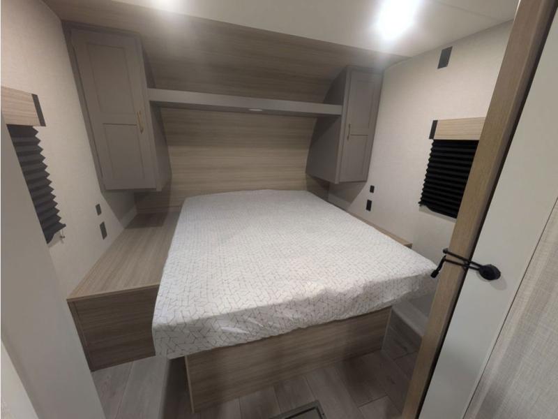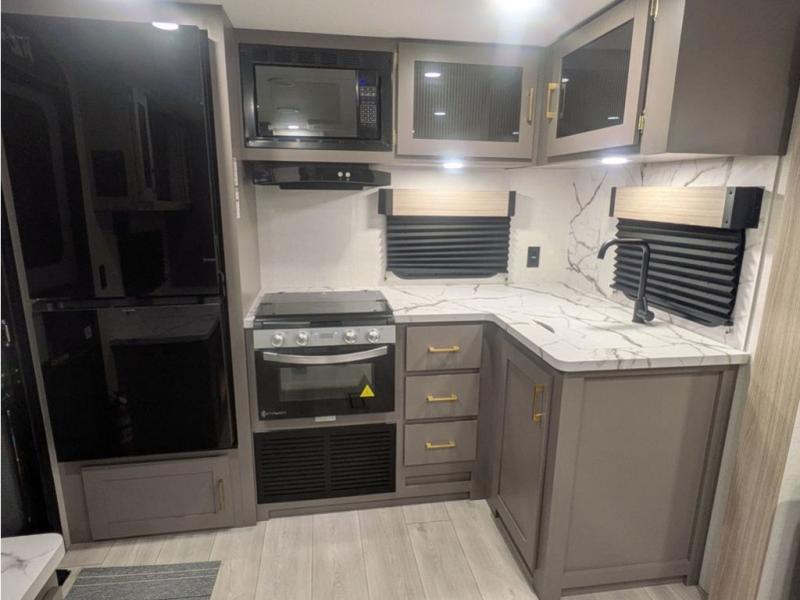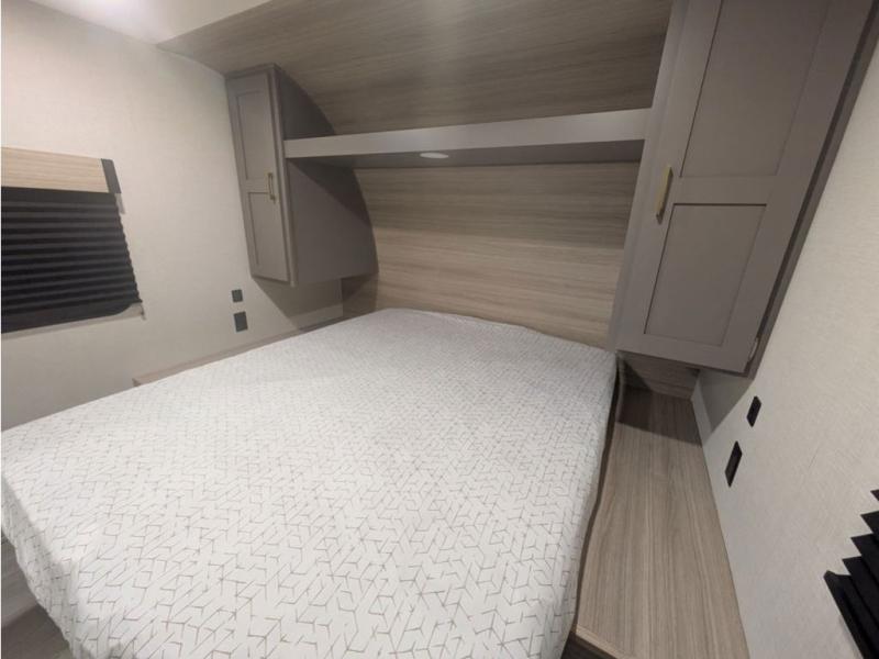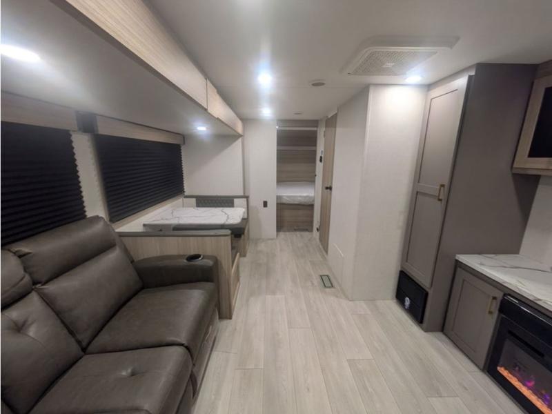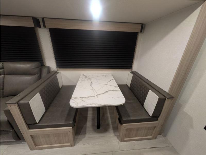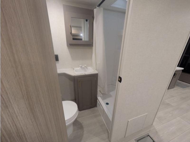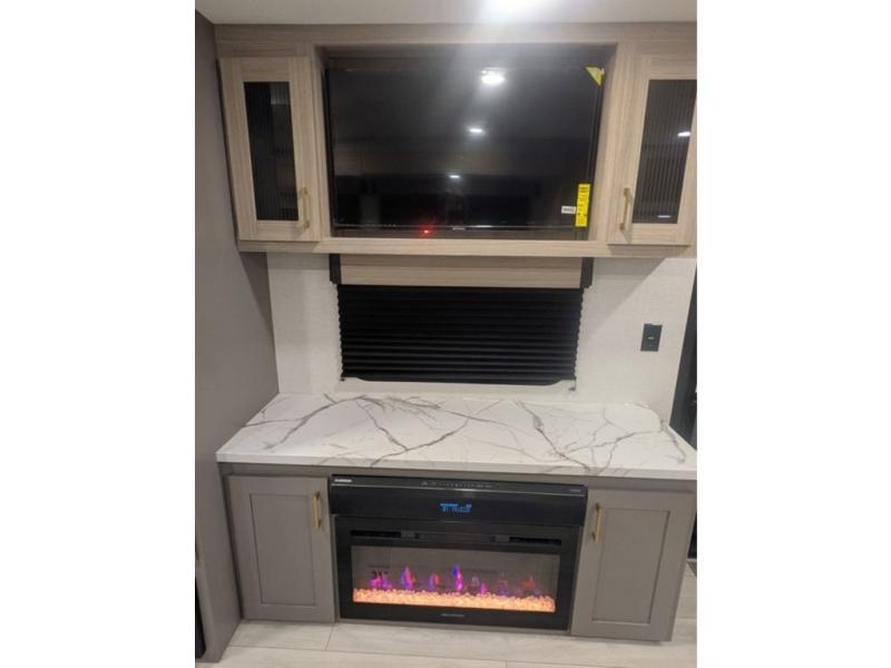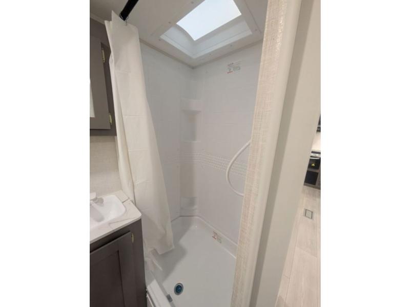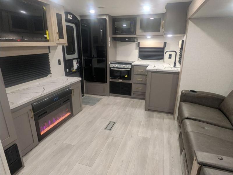 You will love the amount of interior space you have in this travel trailer thanks to the large slide out and rear kitchen with plenty of counter space. There is a 70" sofa and 42" booth dinette within the slide out across from the entertainment center, and you can add the optional 30" fireplace here for more comfort. The full bath includes a bath shelf with towel hooks, plus a foot-flush toilet for convenience. You will feel right at home in the front private bedroom that includes a queen bed, dual shirt closets, plus a TV mount if you choose to bring along a television.