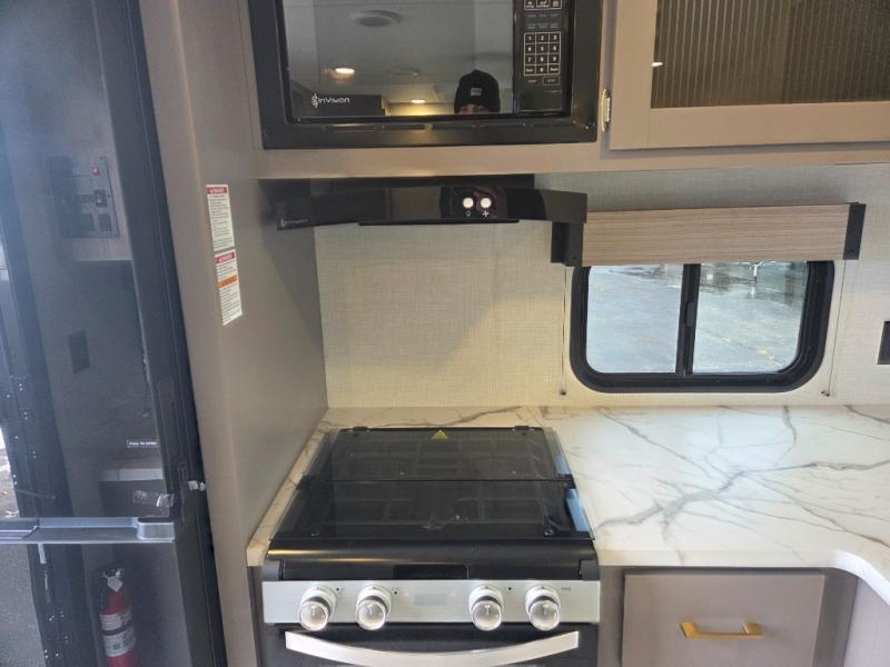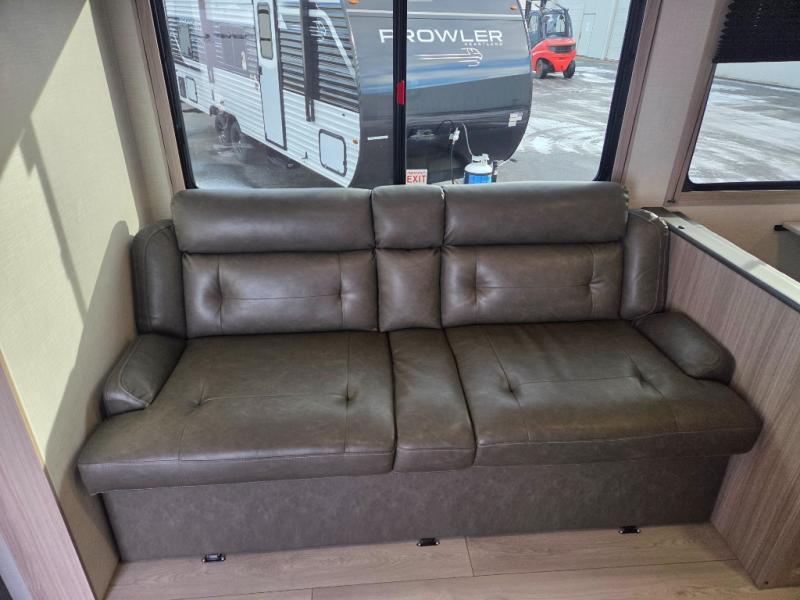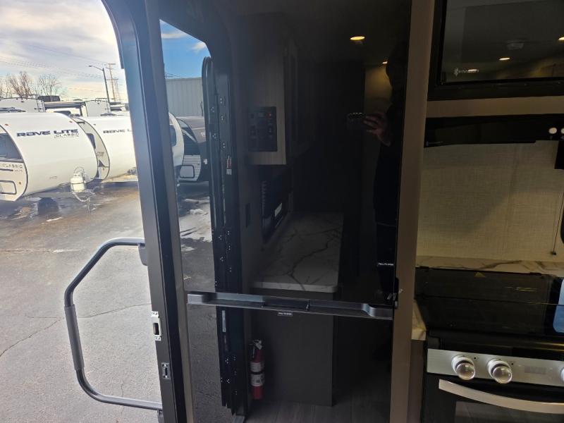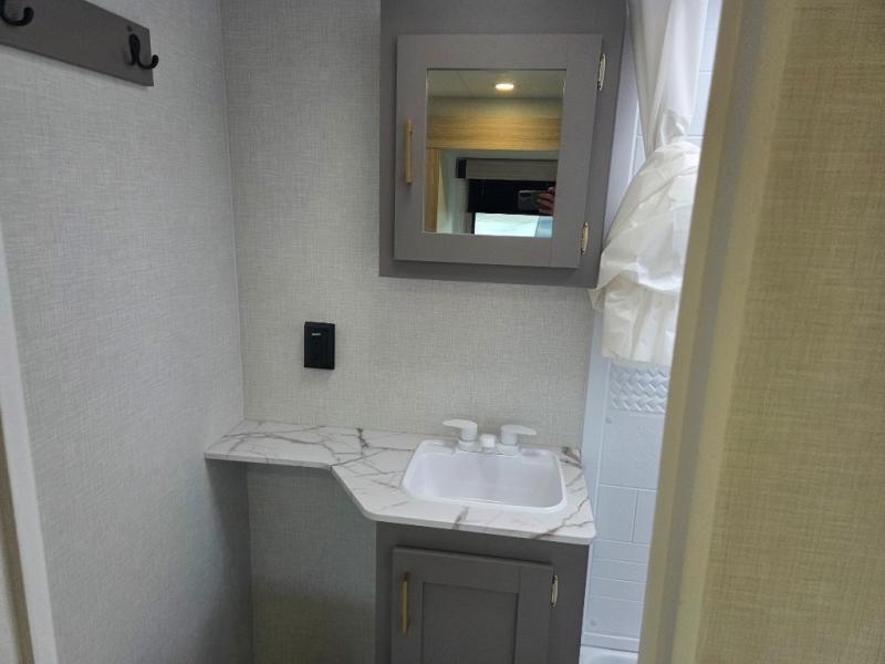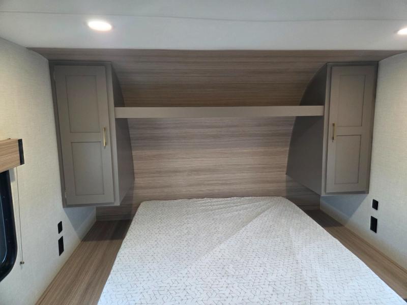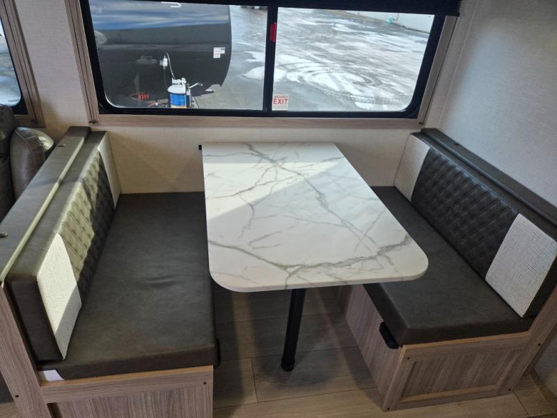 You will love the amount of interior space you have in this travel trailer thanks to the large slide out and rear kitchen with plenty of counter space. There is a 70" sofa and 42" booth dinette within the slide out across from the entertainment center, and you can add the optional 30" fireplace here for more comfort. The full bath includes a bath shelf with towel hooks, plus a foot-flush toilet for convenience. You will feel right at home in the front private bedroom that includes a queen bed, dual shirt closets, plus a TV mount if you choose to bring along a television.