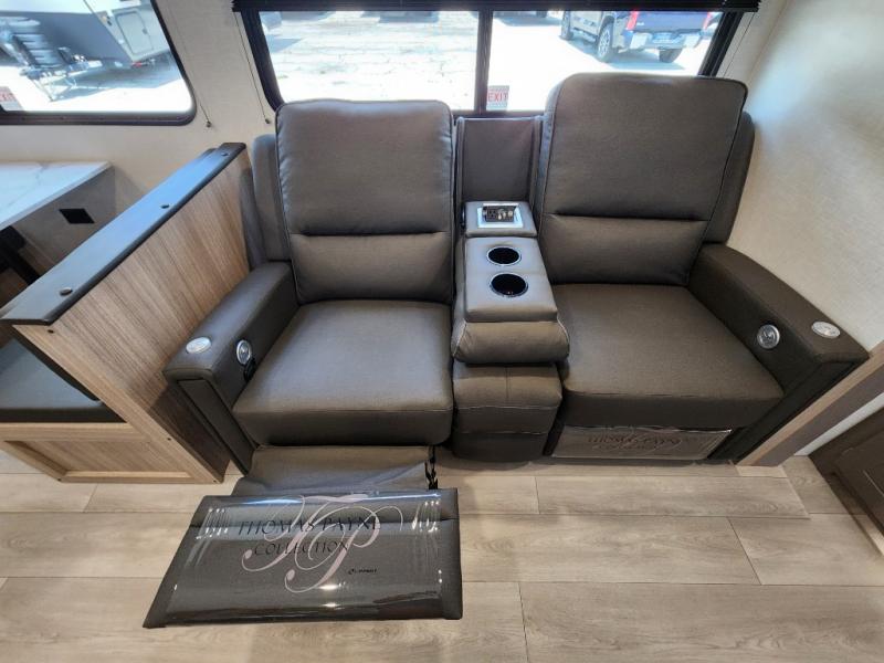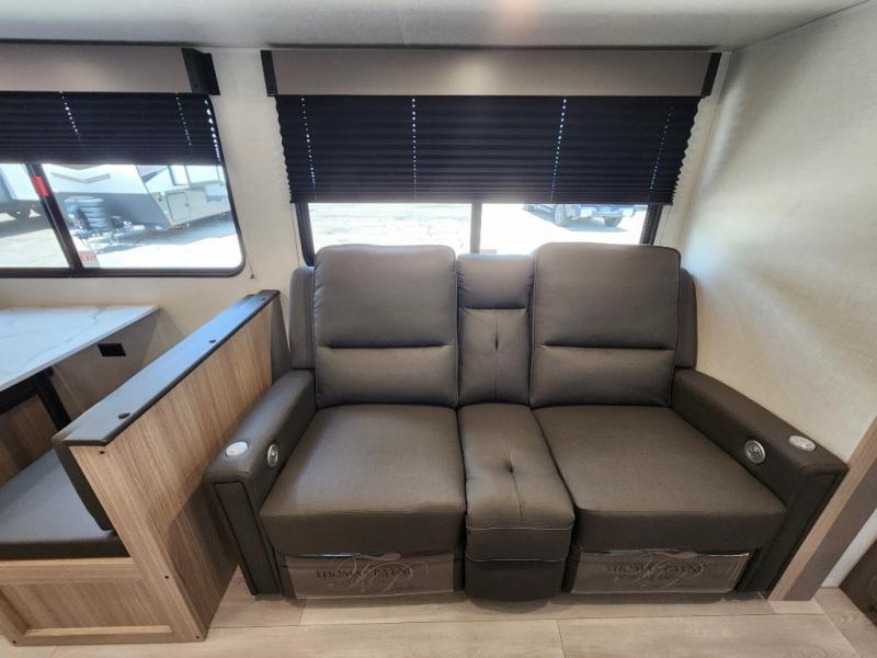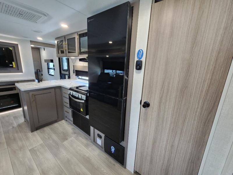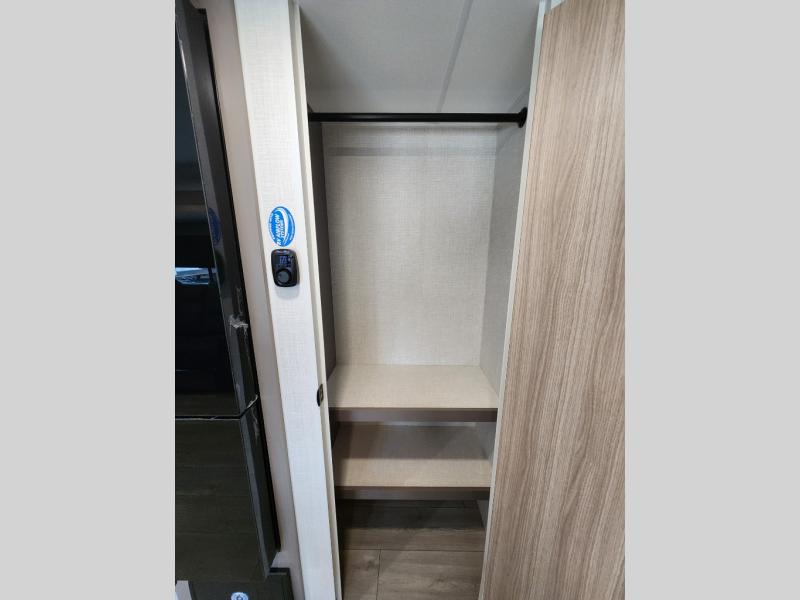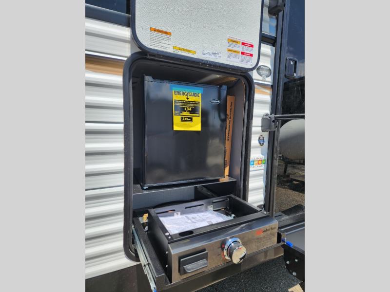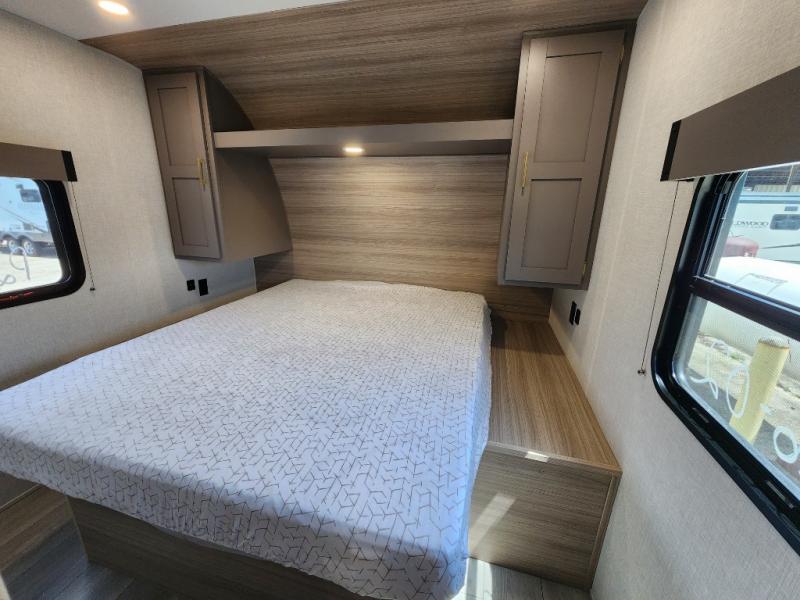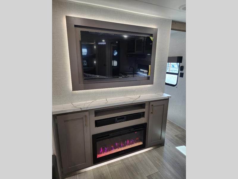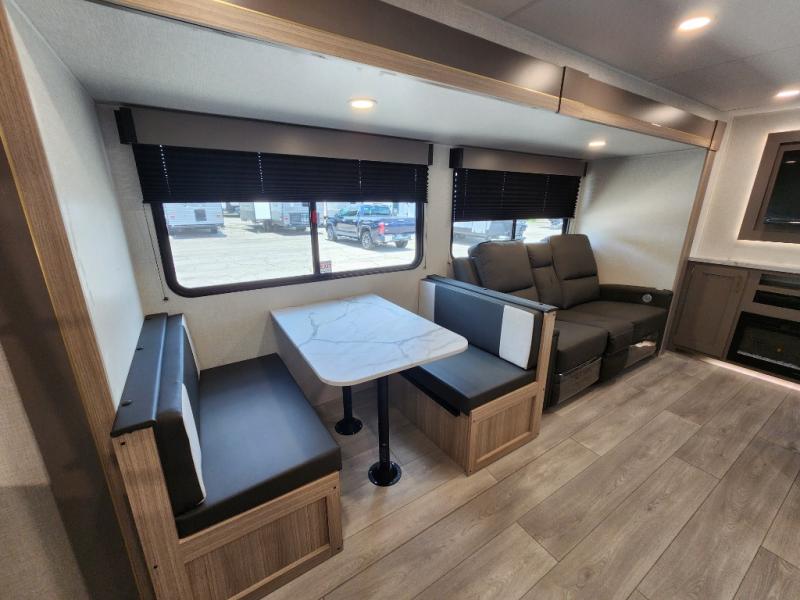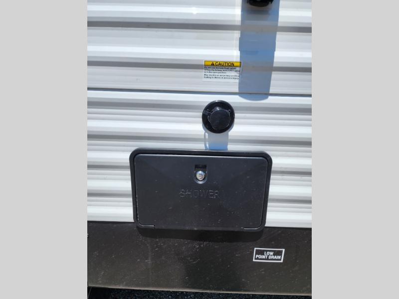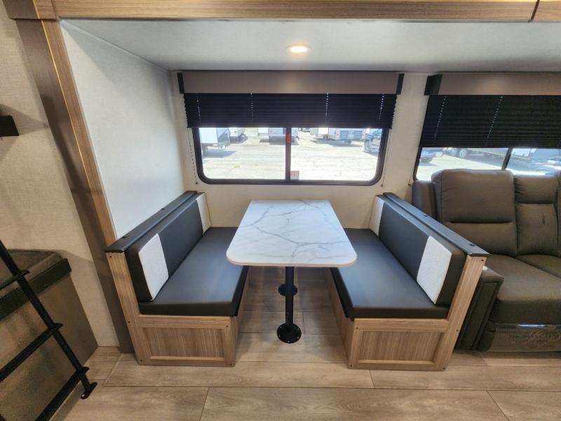 This is a great travel trailer to sleep all your friends or family! Once you arrive at the campground, the chef of your group can prepare lunch on the outside kitchen that includes a griddle and a refrigerator. The 18' power awning here will provide shade from the hot sun, and you can grab the lawn chairs from the pass-through storage to relax. You will find plenty of seating space inside on the 70" sofa and booth dinette within the large slide out, plus there is an entertainment center here. The interior kitchen includes everything you need to prepare meals each day, including a three burner cooktop, a microwave oven, plus a wardrobe/pantry for jackets or dry goods!