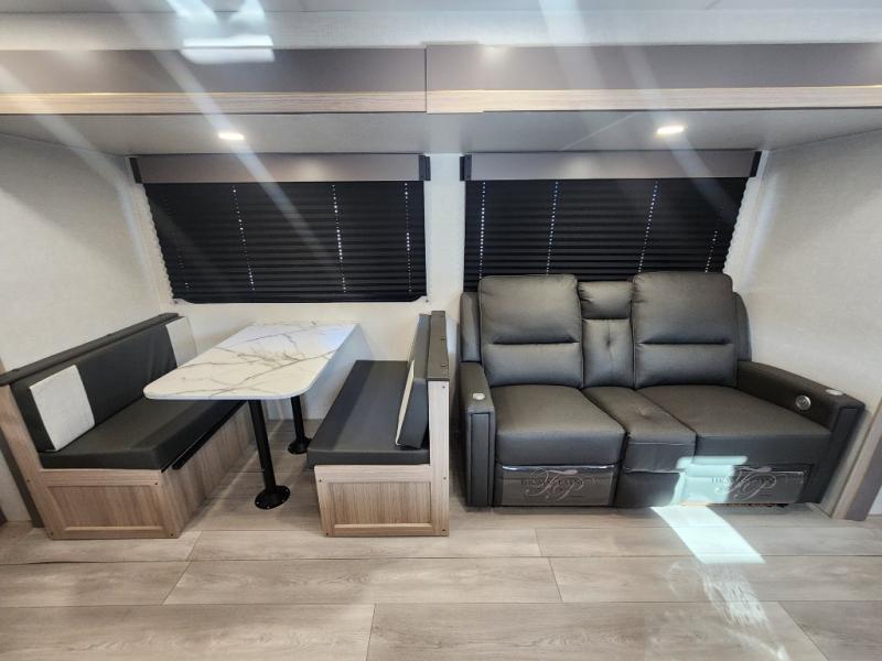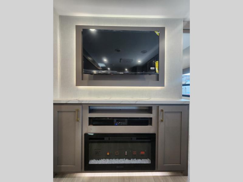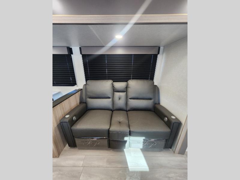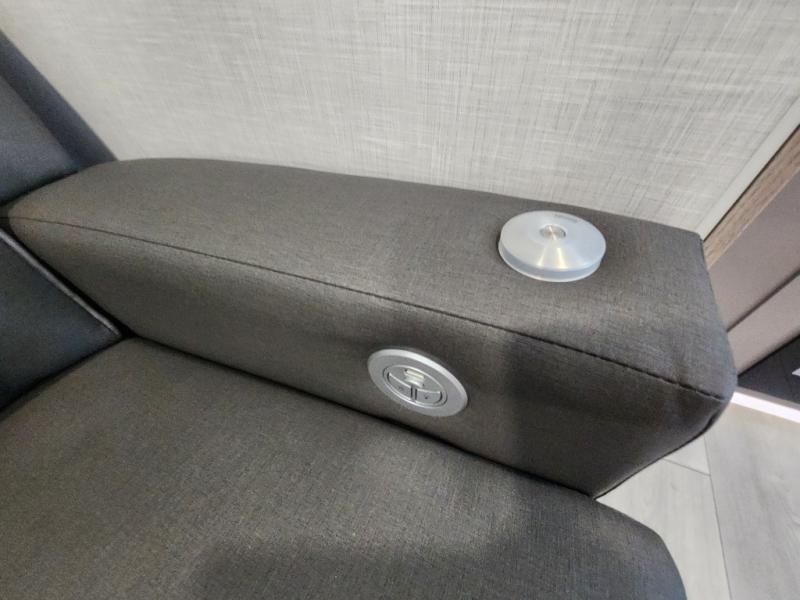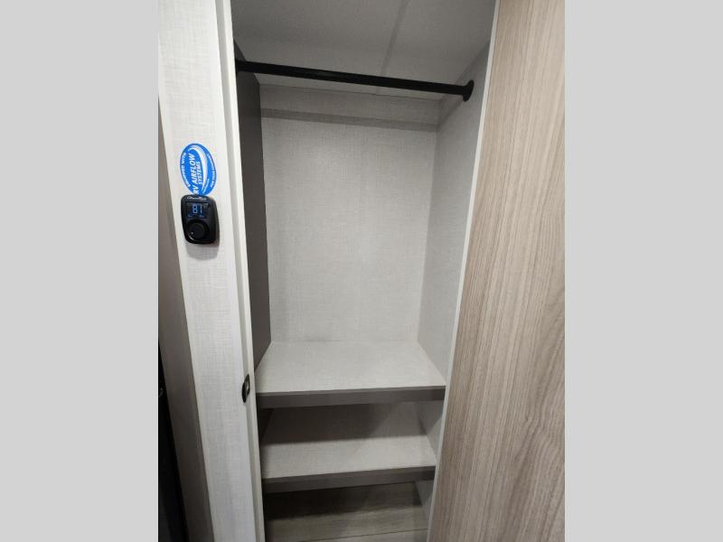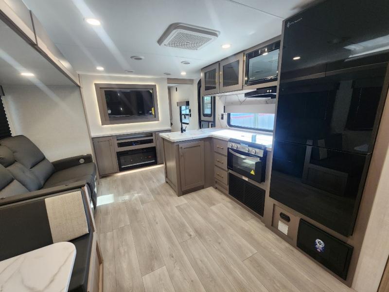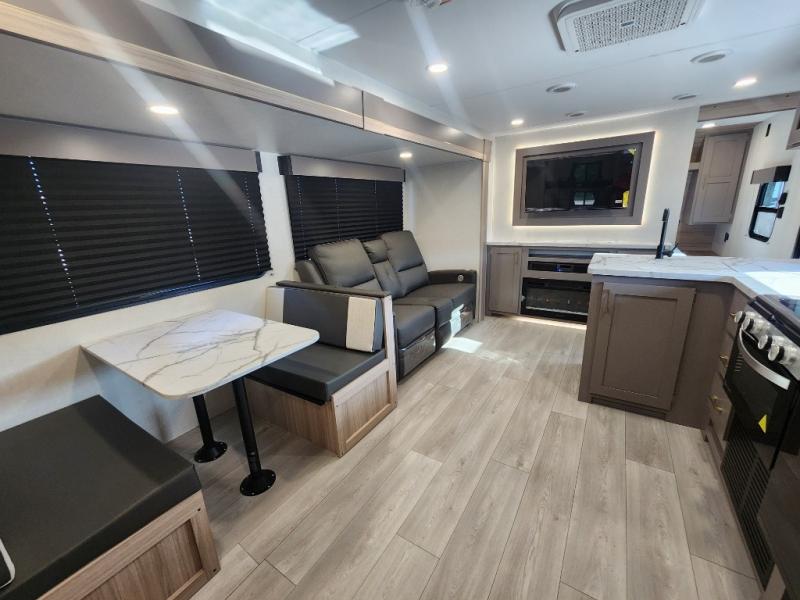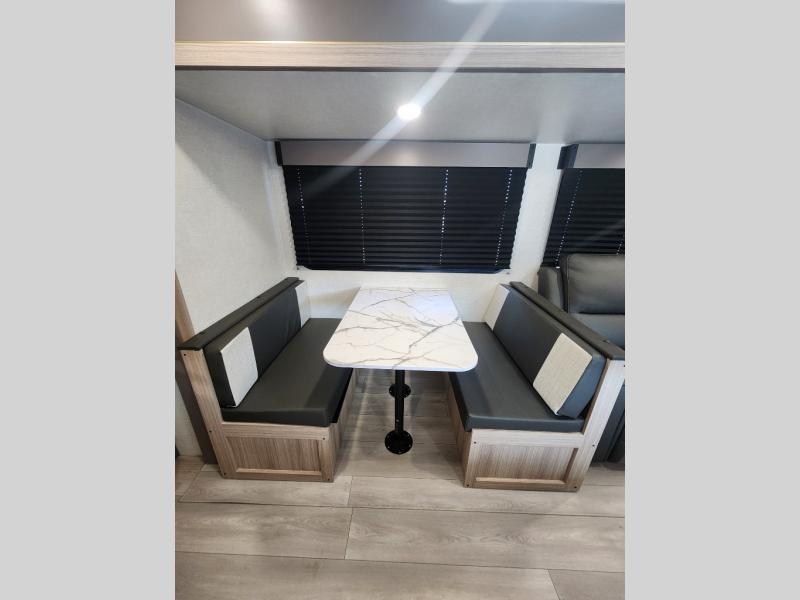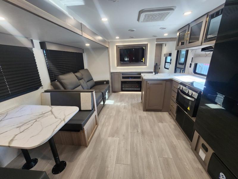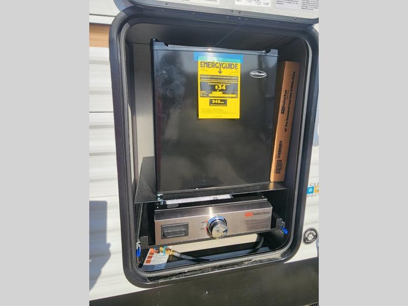 This is a great travel trailer to sleep all your friends or family! Once you arrive at the campground, the chef of your group can prepare lunch on the outside kitchen that includes a griddle and a refrigerator. The 18' power awning here will provide shade from the hot sun, and you can grab the lawn chairs from the pass-through storage to relax. You will find plenty of seating space inside on the 70" sofa and booth dinette within the large slide out, plus there is an entertainment center here. The interior kitchen includes everything you need to prepare meals each day, including a three burner cooktop, a microwave oven, plus a wardrobe/pantry for jackets or dry goods!