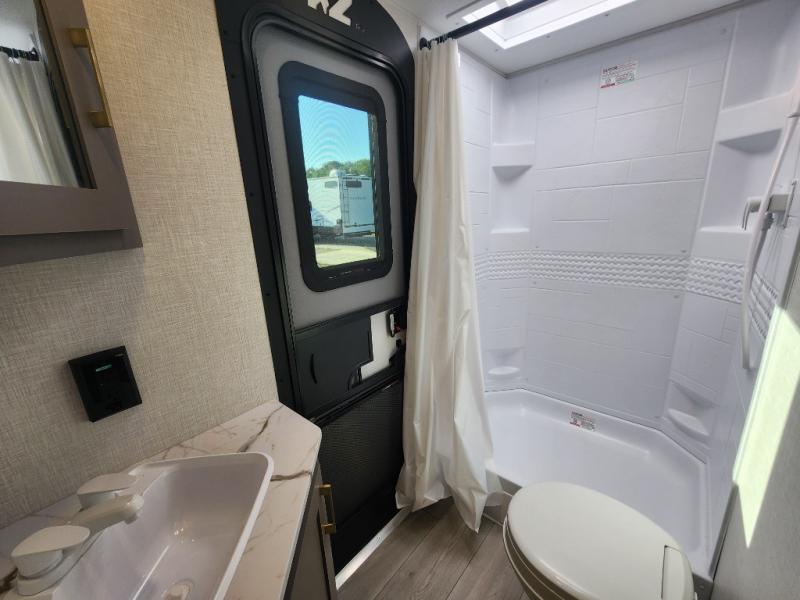 Each Sportsmen SE travel trailer and toy hauler by KZ is constructed with KZ exclusive tough shield exterior metal, a one-piece seamless walk-on Tufflex roofing material, and diamond plate rock guard to protect your unit from road debris. You will appreciate the extra large baggage doors for stowing away your gear when not in use, and tinted windows to help keep the harmful sun rays out plus keeping it cooler inside. Some of the exterior conveniences found in the mandatory Advantage Package are the solid folding steps with a large folding grab handle for easy entry and exit, a full glass friction hinged entry door, plus an exterior shower for your pets or to rinse off before you head inside. You'll also appreciate the nitrogen-filled tires, solar and backup camera prep, plus a Leash Latch with a bonus beverage opener. You'll feel right at home inside with linoleum flooring throughout, a 13,500 BTU air conditioner, large overhead cabinets, a shower surround, and much more!