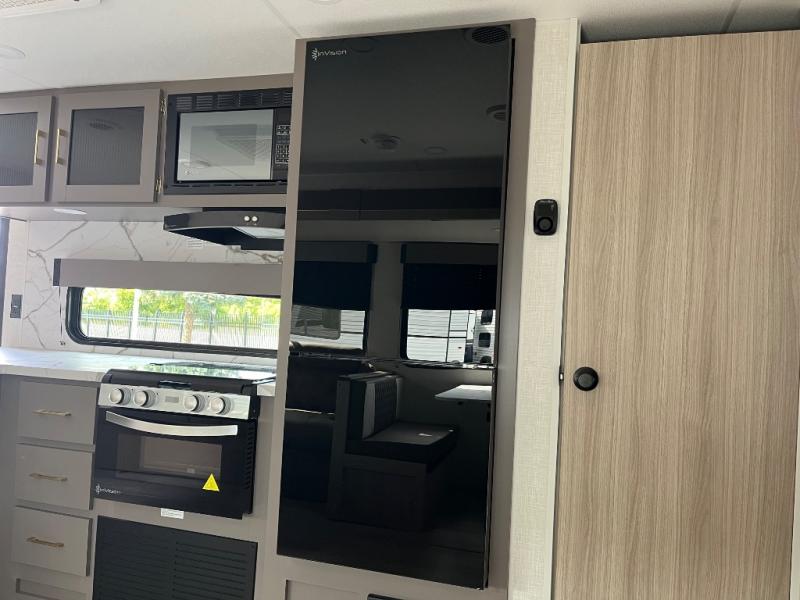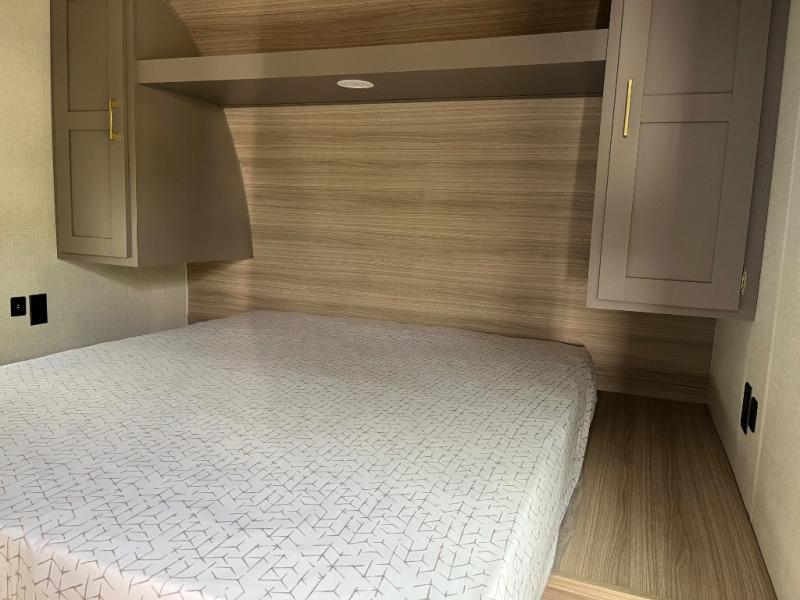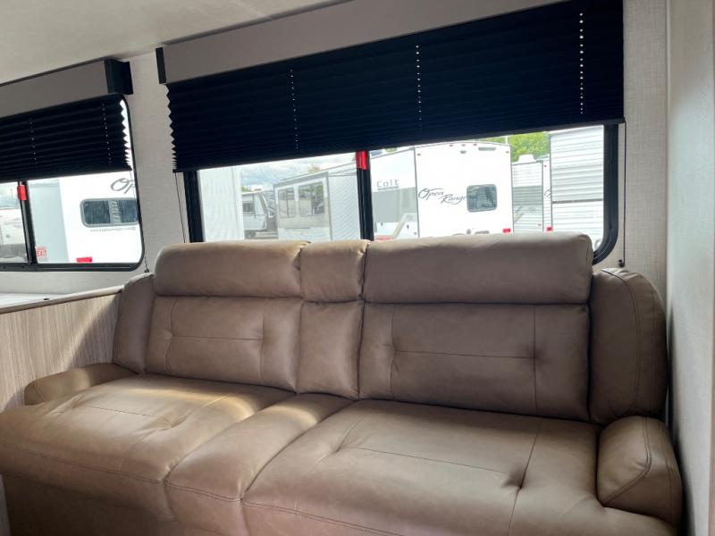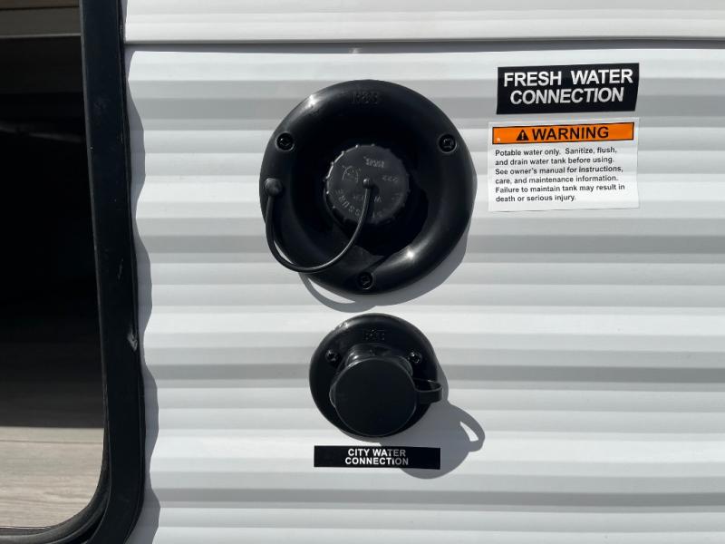 This is a great travel trailer to sleep all your friends or family! Once you arrive at the campground, the chef of your group can prepare lunch on the outside kitchen that includes a griddle and a refrigerator. The 18' power awning here will provide shade from the hot sun, and you can grab the lawn chairs from the pass-through storage to relax. You will find plenty of seating space inside on the 70" sofa and booth dinette within the large slide out, plus there is an entertainment center here. The interior kitchen includes everything you need to prepare meals each day, including a three burner cooktop, a microwave oven, plus a wardrobe/pantry for jackets or dry goods!