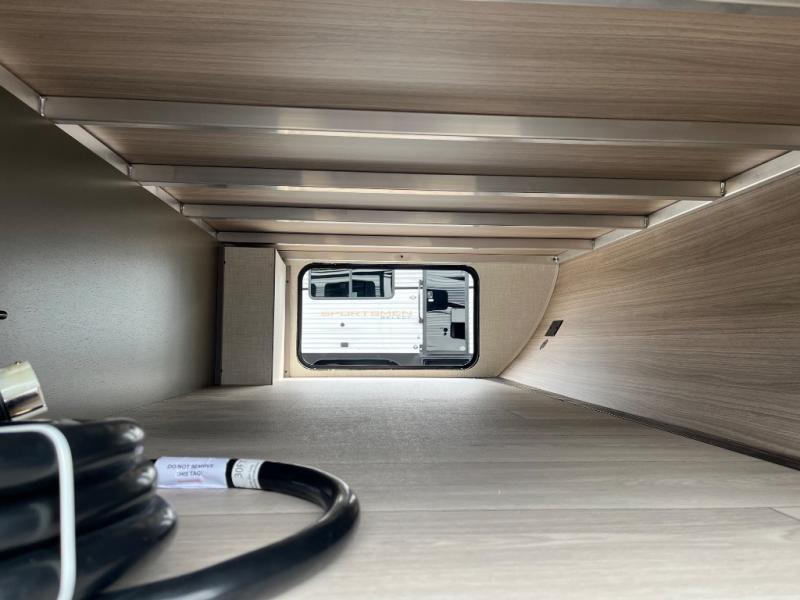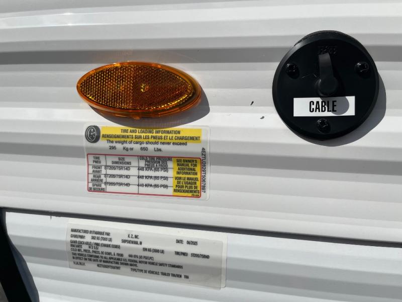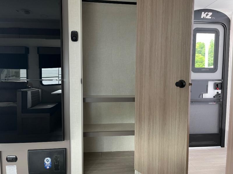 Each Sportsmen SE travel trailer and toy hauler by KZ is constructed with KZ exclusive tough shield exterior metal, a one-piece seamless walk-on Tufflex roofing material, and diamond plate rock guard to protect your unit from road debris. You will appreciate the extra large baggage doors for stowing away your gear when not in use, and tinted windows to help keep the harmful sun rays out plus keeping it cooler inside. Some of the exterior conveniences found in the mandatory Advantage Package are the solid folding steps with a large folding grab handle for easy entry and exit, a full glass friction hinged entry door, plus an exterior shower for your pets or to rinse off before you head inside. You'll also appreciate the nitrogen-filled tires, solar and backup camera prep, plus a Leash Latch with a bonus beverage opener. You'll feel right at home inside with linoleum flooring throughout, a 13,500 BTU air conditioner, large overhead cabinets, a shower surround, and much more!