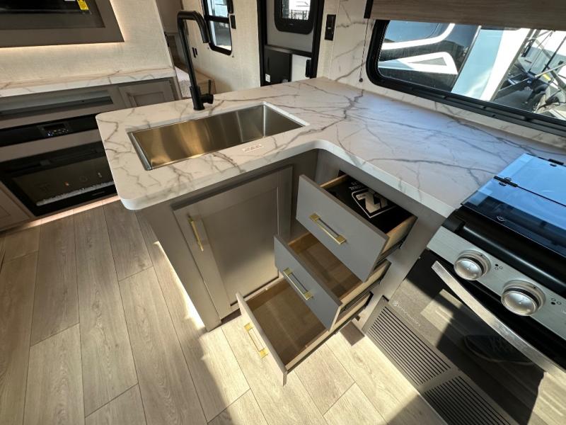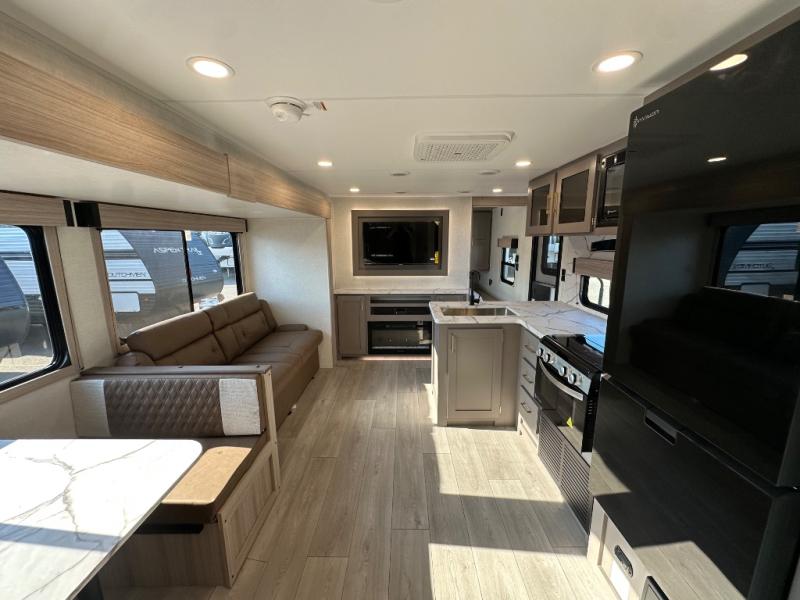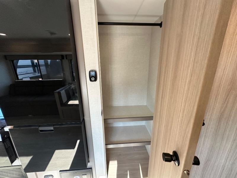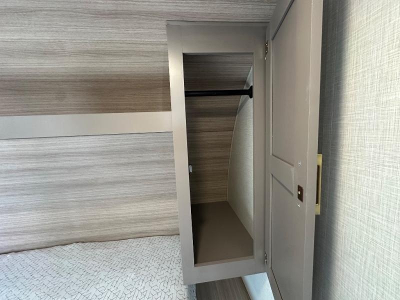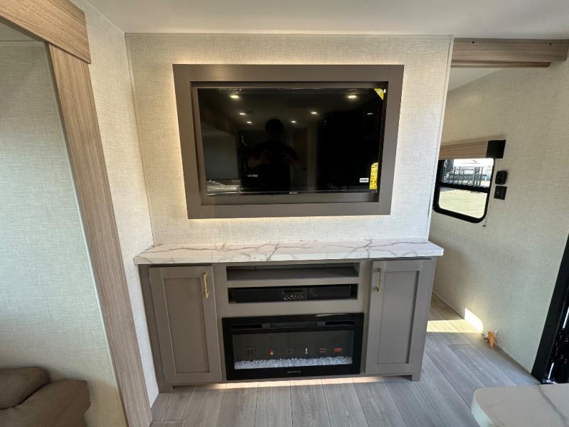 This is a great travel trailer to sleep all your friends or family! Once you arrive at the campground, the chef of your group can prepare lunch on the outside kitchen that includes a griddle and a refrigerator. The 18' power awning here will provide shade from the hot sun, and you can grab the lawn chairs from the pass-through storage to relax. You will find plenty of seating space inside on the 70" sofa and booth dinette within the large slide out, plus there is an entertainment center here. The interior kitchen includes everything you need to prepare meals each day, including a three burner cooktop, a microwave oven, plus a wardrobe/pantry for jackets or dry goods!
