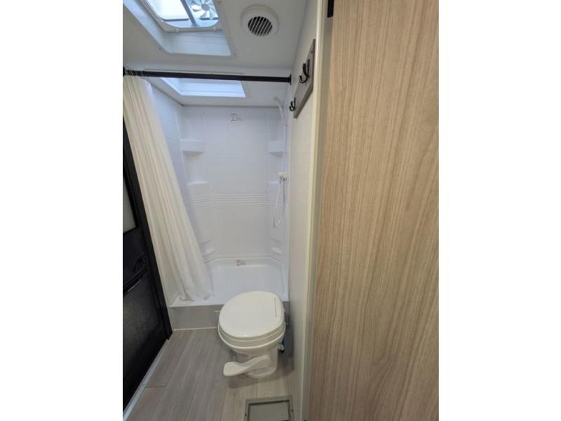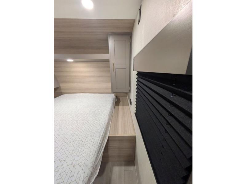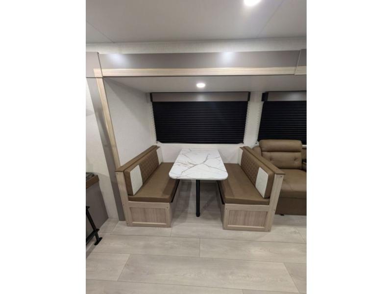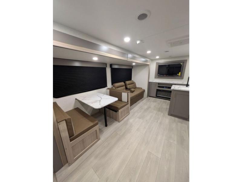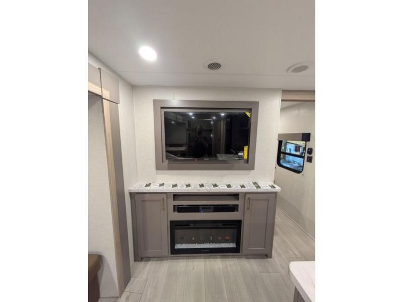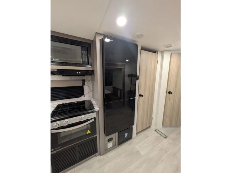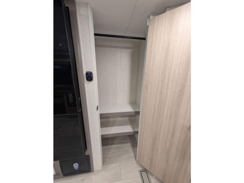 This is a great travel trailer to sleep all your friends or family! Once you arrive at the campground, the chef of your group can prepare lunch on the outside kitchen that includes a griddle and a refrigerator. The 18' power awning here will provide shade from the hot sun, and you can grab the lawn chairs from the pass-through storage to relax. You will find plenty of seating space inside on the 70" sofa and booth dinette within the large slide out, plus there is an entertainment center here. The interior kitchen includes everything you need to prepare meals each day, including a three burner cooktop, a microwave oven, plus a wardrobe/pantry for jackets or dry goods!