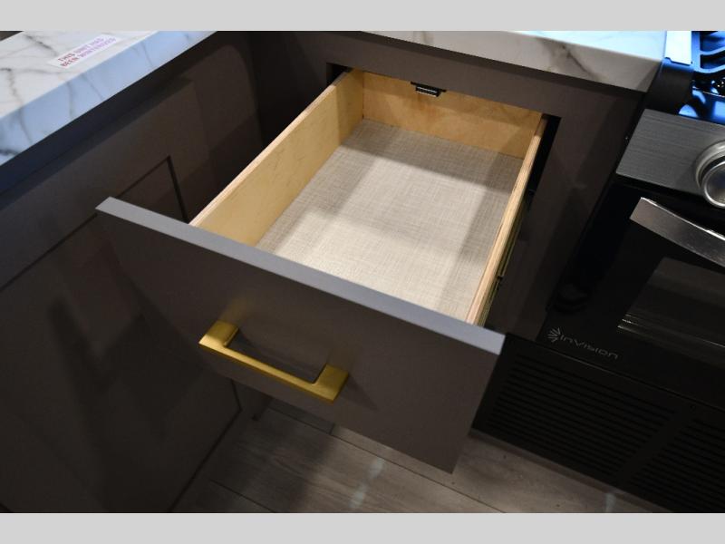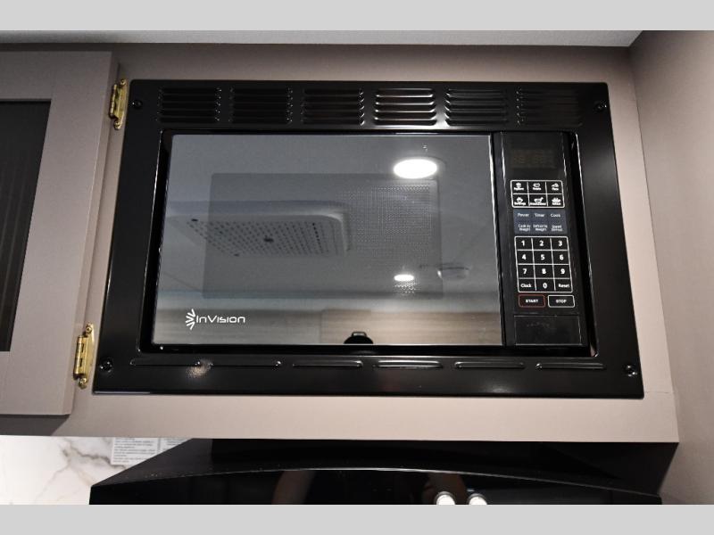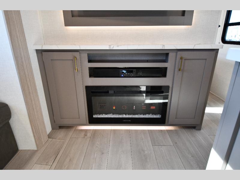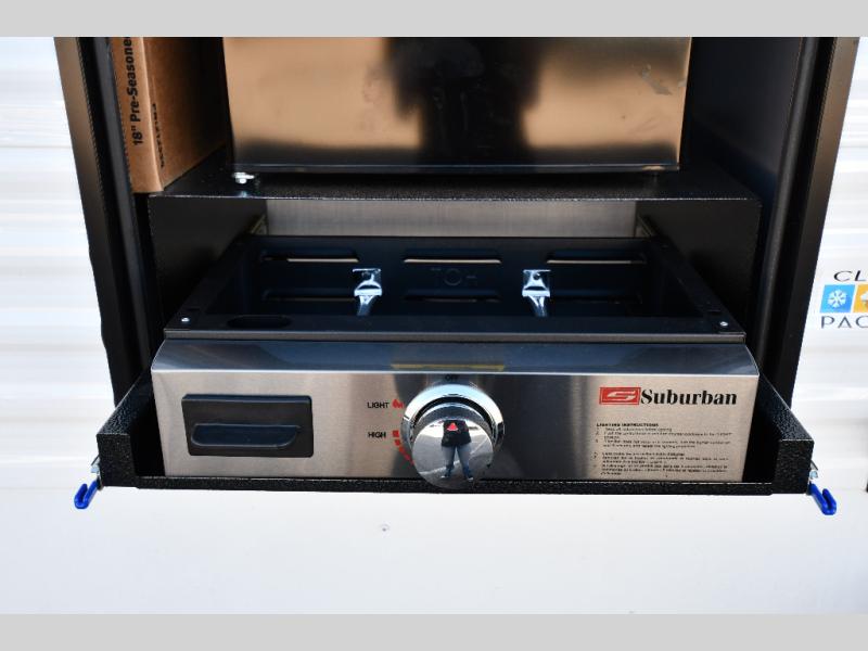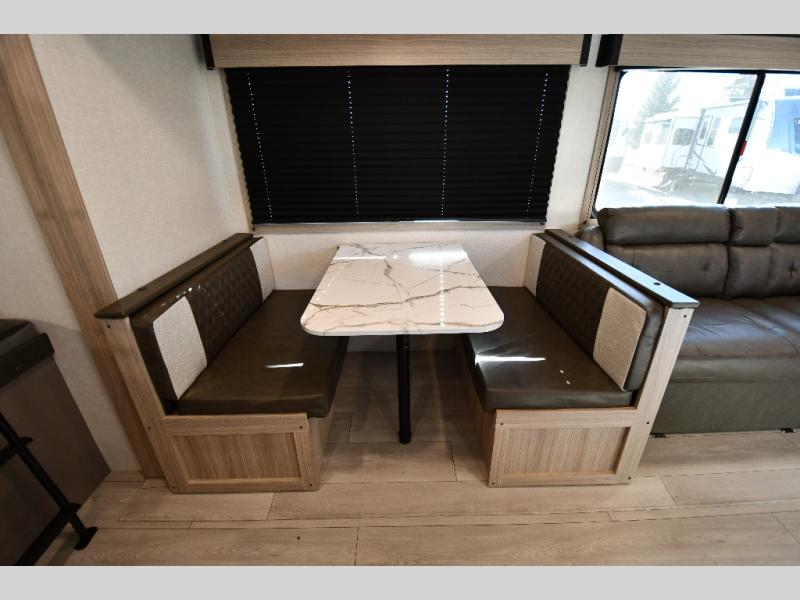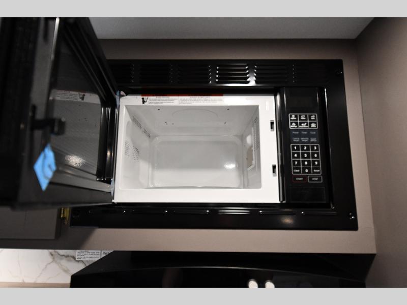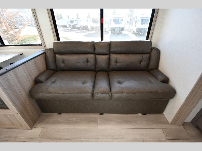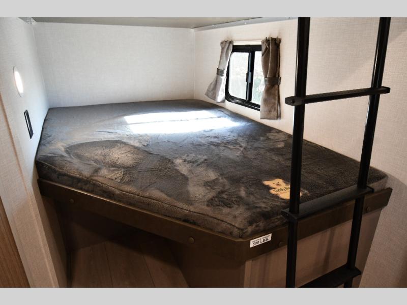 This is a great travel trailer to sleep all your friends or family! Once you arrive at the campground, the chef of your group can prepare lunch on the outside kitchen that includes a griddle and a refrigerator. The 18' power awning here will provide shade from the hot sun, and you can grab the lawn chairs from the pass-through storage to relax. You will find plenty of seating space inside on the 70" sofa and booth dinette within the large slide out, plus there is an entertainment center here. The interior kitchen includes everything you need to prepare meals each day, including a three burner cooktop, a microwave oven, plus a wardrobe/pantry for jackets or dry goods!