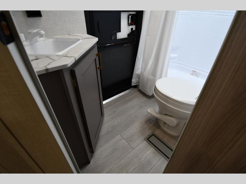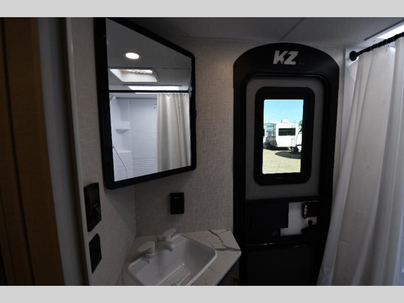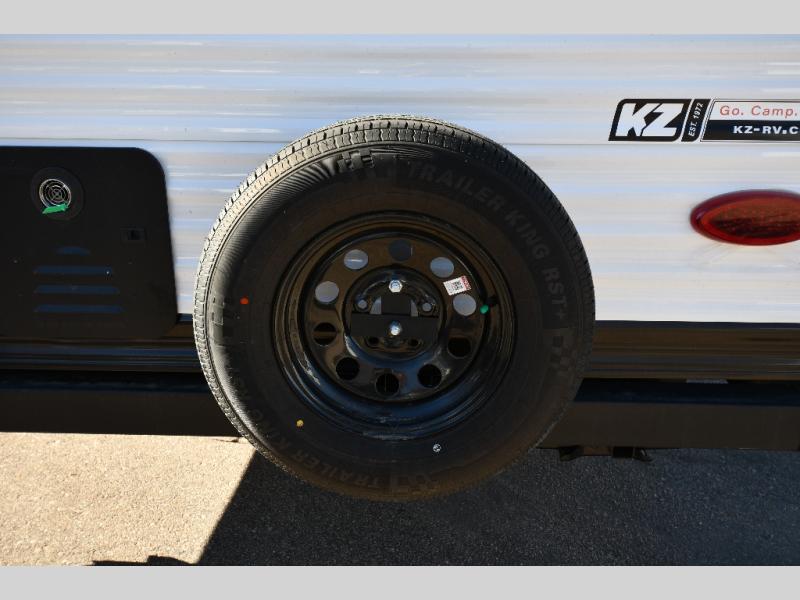 Each Sportsmen SE travel trailer and toy hauler by KZ is constructed with KZ exclusive tough shield exterior metal, a one-piece seamless walk-on Tufflex roofing material, and diamond plate rock guard to protect your unit from road debris. You will appreciate the extra large baggage doors for stowing away your gear when not in use, and tinted windows to help keep the harmful sun rays out plus keeping it cooler inside. Some of the exterior conveniences found in the mandatory Advantage Package are the solid folding steps with a large folding grab handle for easy entry and exit, a full glass friction hinged entry door, plus an exterior shower for your pets or to rinse off before you head inside. You'll also appreciate the nitrogen-filled tires, solar and backup camera prep, plus a Leash Latch with a bonus beverage opener. You'll feel right at home inside with linoleum flooring throughout, a 13,500 BTU air conditioner, large overhead cabinets, a shower surround, and much more!
