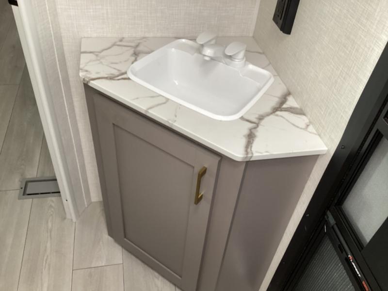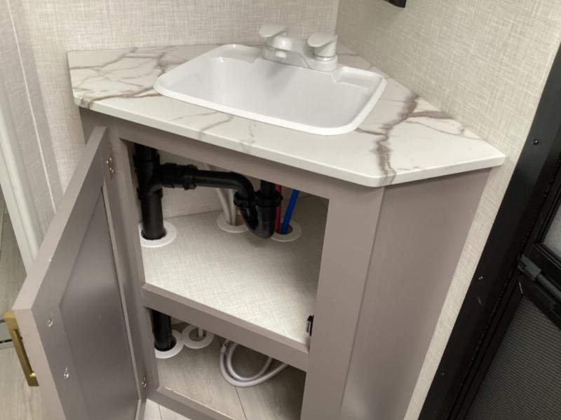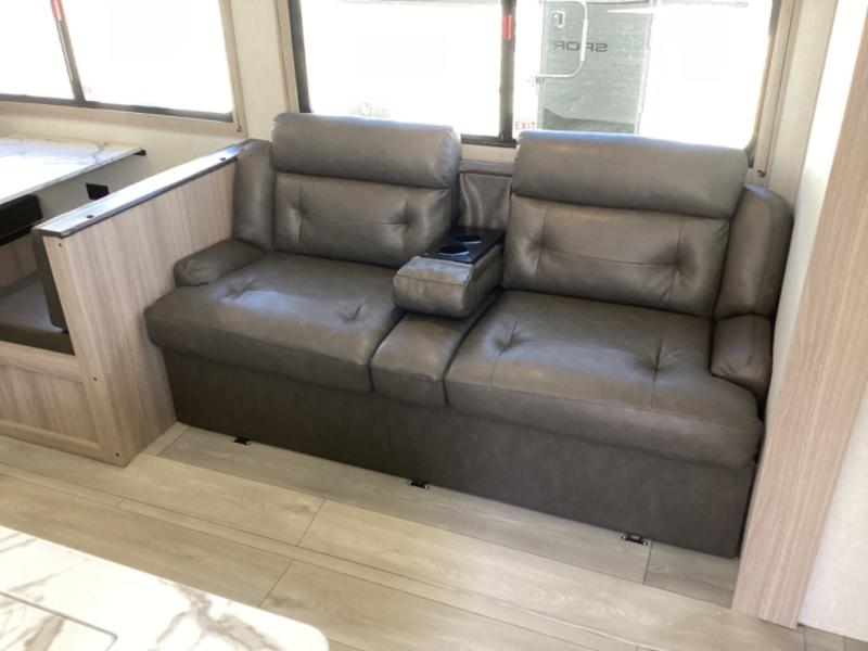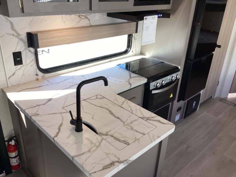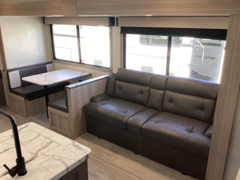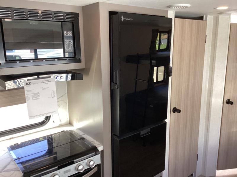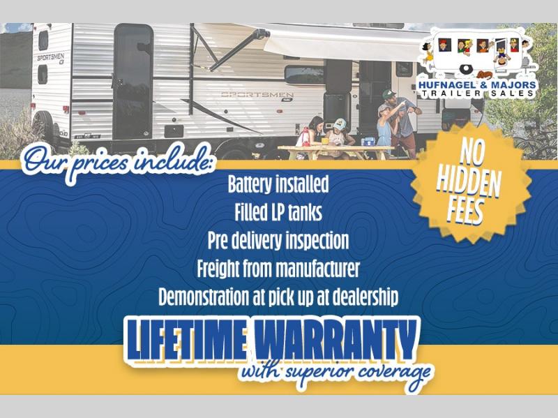 Each Sportsmen SE travel trailer and toy hauler by KZ is constructed with KZ exclusive tough shield exterior metal, a one-piece seamless walk-on Tufflex roofing material, and diamond plate rock guard to protect your unit from road debris. You will appreciate the extra large baggage doors for stowing away your gear when not in use, and tinted windows to help keep the harmful sun rays out plus keeping it cooler inside. Some of the exterior conveniences found in the mandatory Advantage Package are the solid folding steps with a large folding grab handle for easy entry and exit, a full glass friction hinged entry door, plus an exterior shower for your pets or to rinse off before you head inside. You'll also appreciate the nitrogen-filled tires, solar and backup camera prep, plus a Leash Latch with a bonus beverage opener. You'll feel right at home inside with linoleum flooring throughout, a 13,500 BTU air conditioner, large overhead cabinets, a shower surround, and much more!