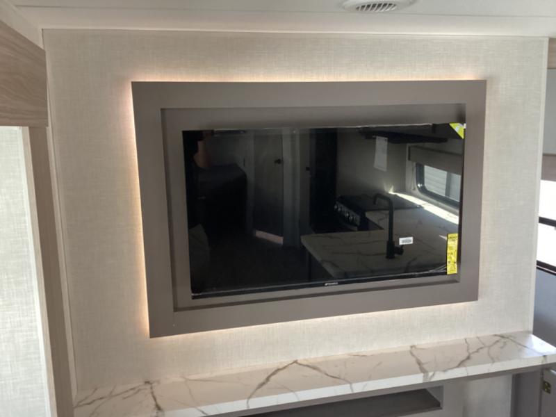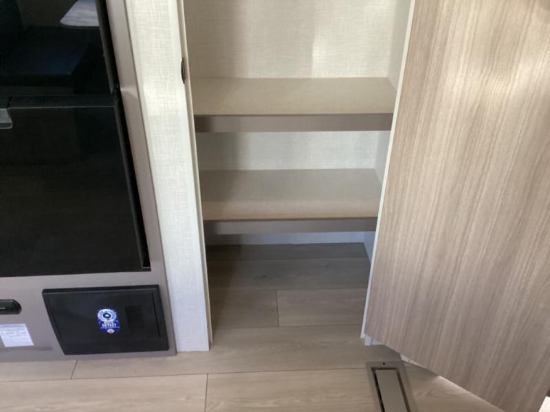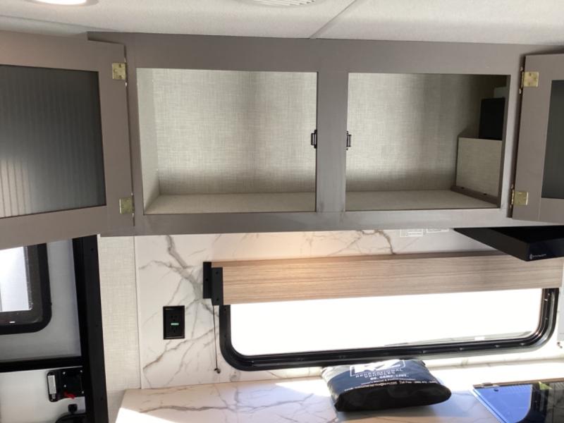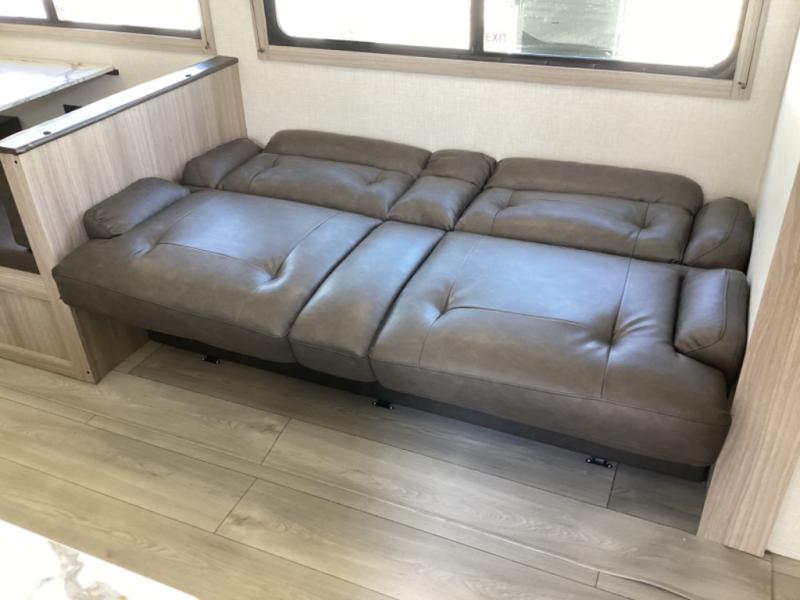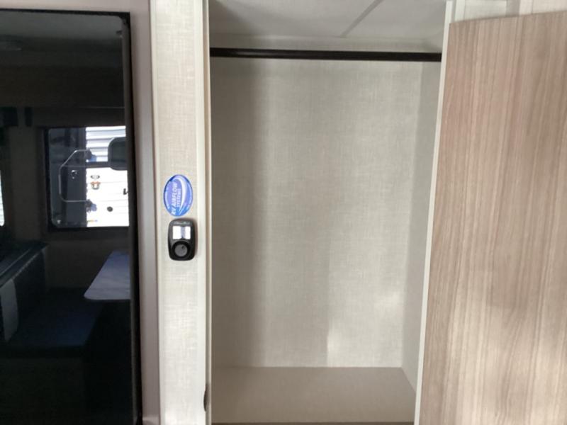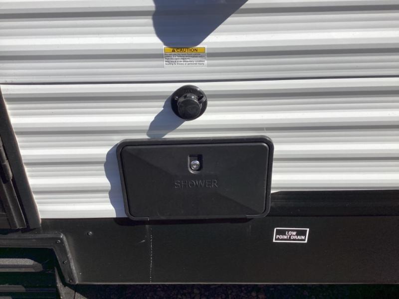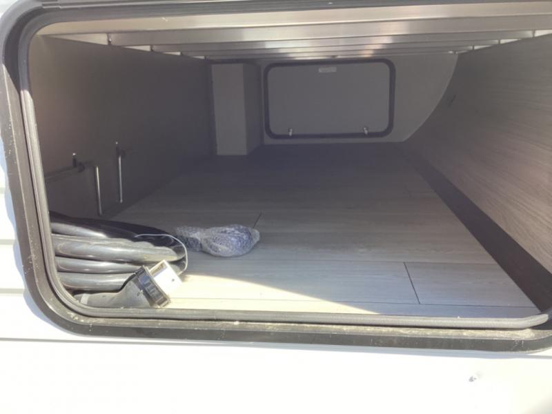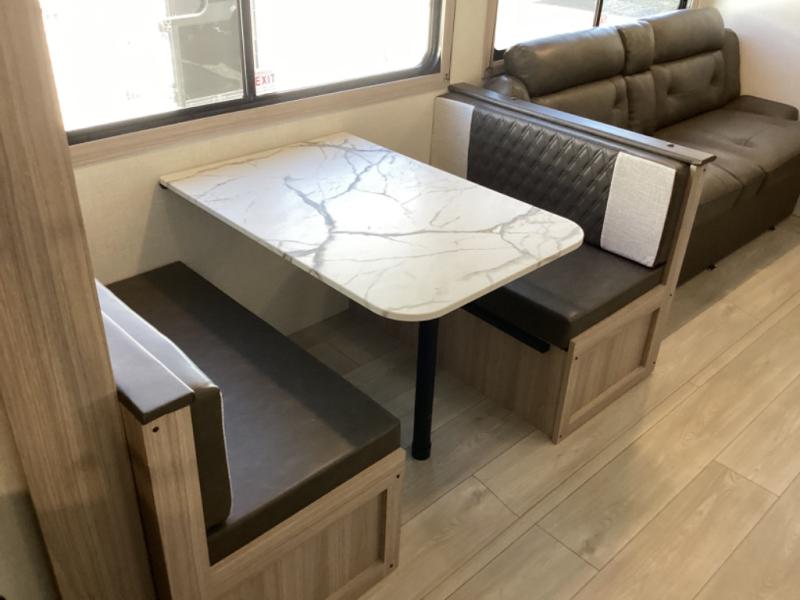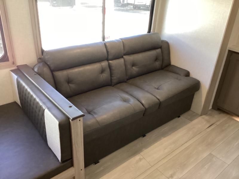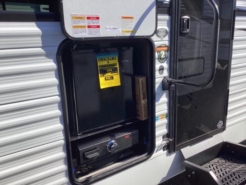 This is a great travel trailer to sleep all your friends or family! Once you arrive at the campground, the chef of your group can prepare lunch on the outside kitchen that includes a griddle and a refrigerator. The 18' power awning here will provide shade from the hot sun, and you can grab the lawn chairs from the pass-through storage to relax. You will find plenty of seating space inside on the 70" sofa and booth dinette within the large slide out, plus there is an entertainment center here. The interior kitchen includes everything you need to prepare meals each day, including a three burner cooktop, a microwave oven, plus a wardrobe/pantry for jackets or dry goods!