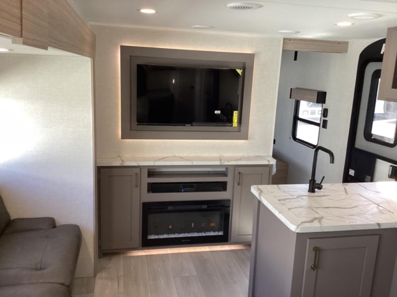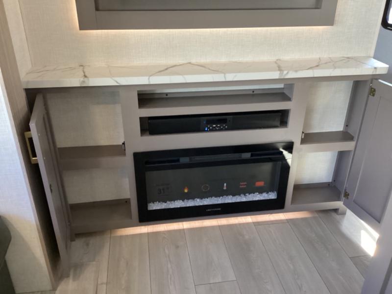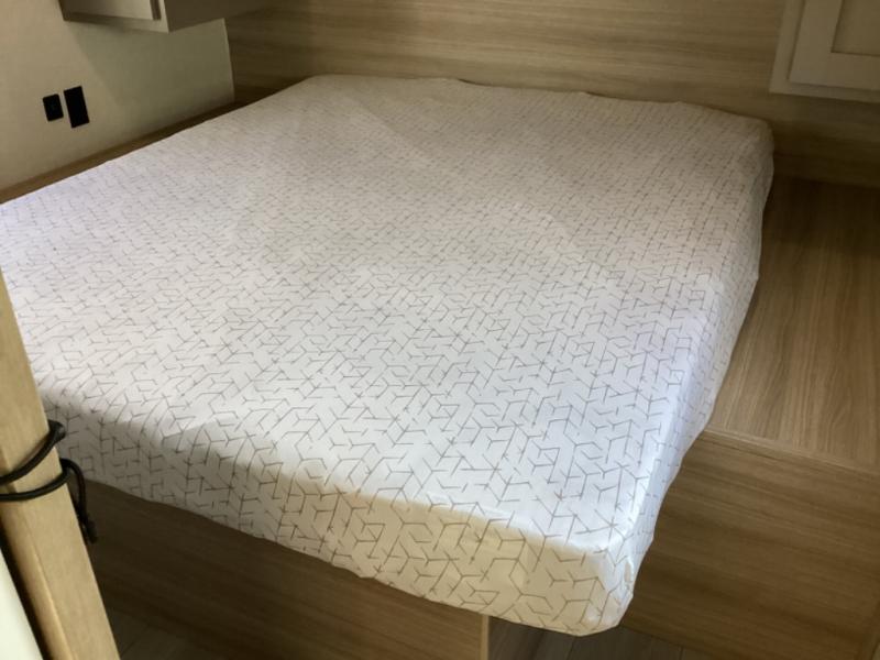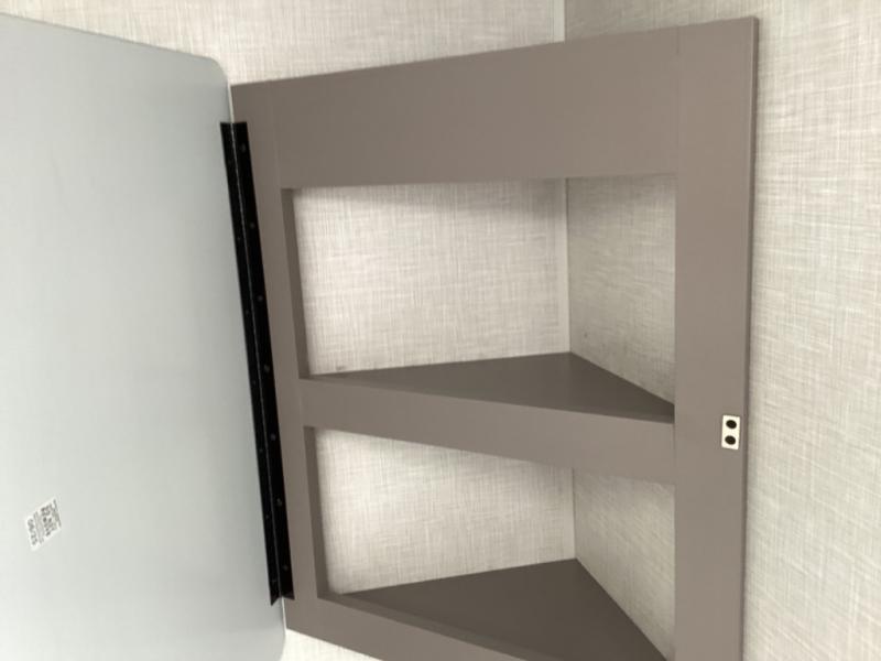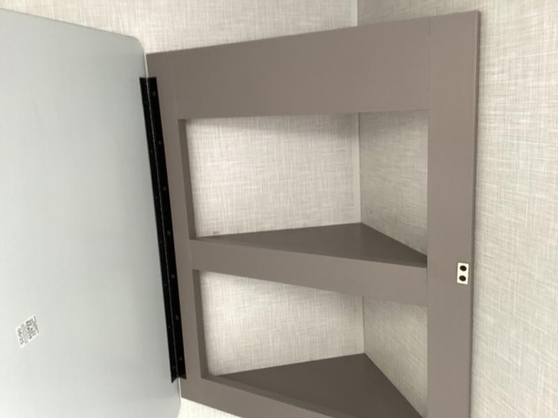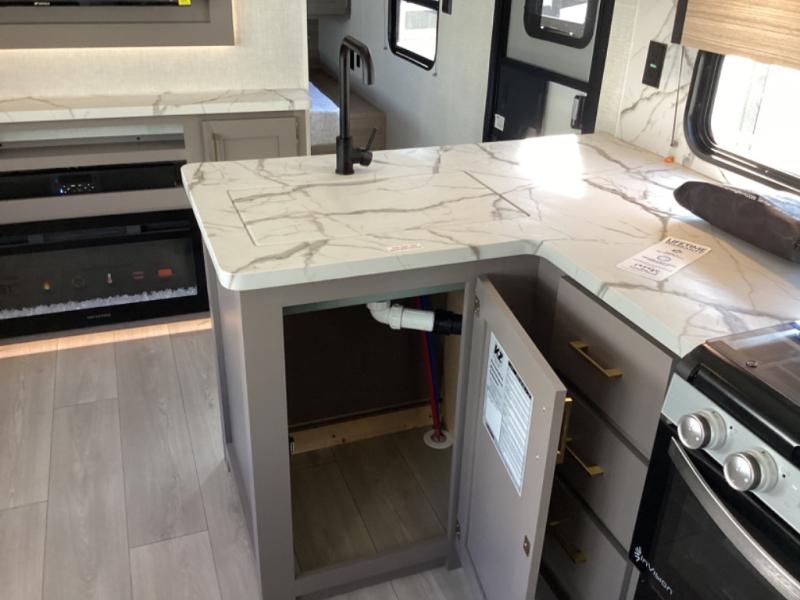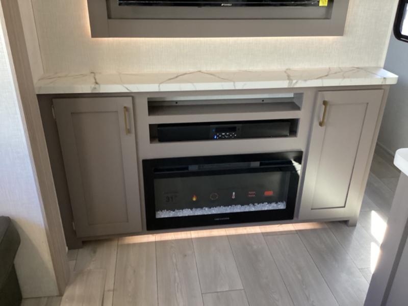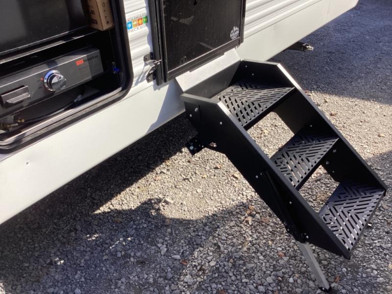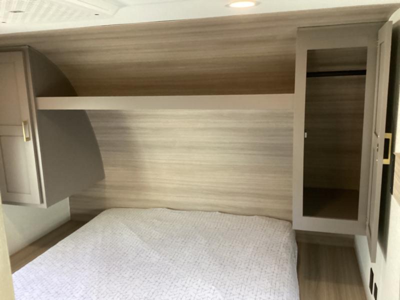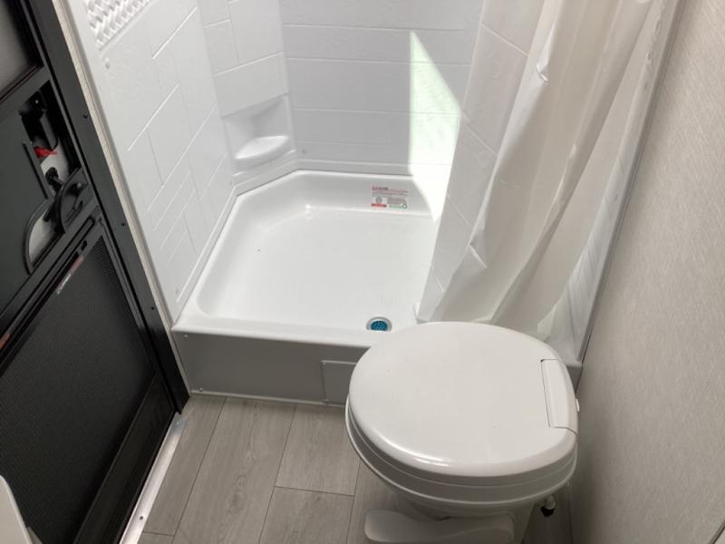 This is a great travel trailer to sleep all your friends or family! Once you arrive at the campground, the chef of your group can prepare lunch on the outside kitchen that includes a griddle and a refrigerator. The 18' power awning here will provide shade from the hot sun, and you can grab the lawn chairs from the pass-through storage to relax. You will find plenty of seating space inside on the 70" sofa and booth dinette within the large slide out, plus there is an entertainment center here. The interior kitchen includes everything you need to prepare meals each day, including a three burner cooktop, a microwave oven, plus a wardrobe/pantry for jackets or dry goods!