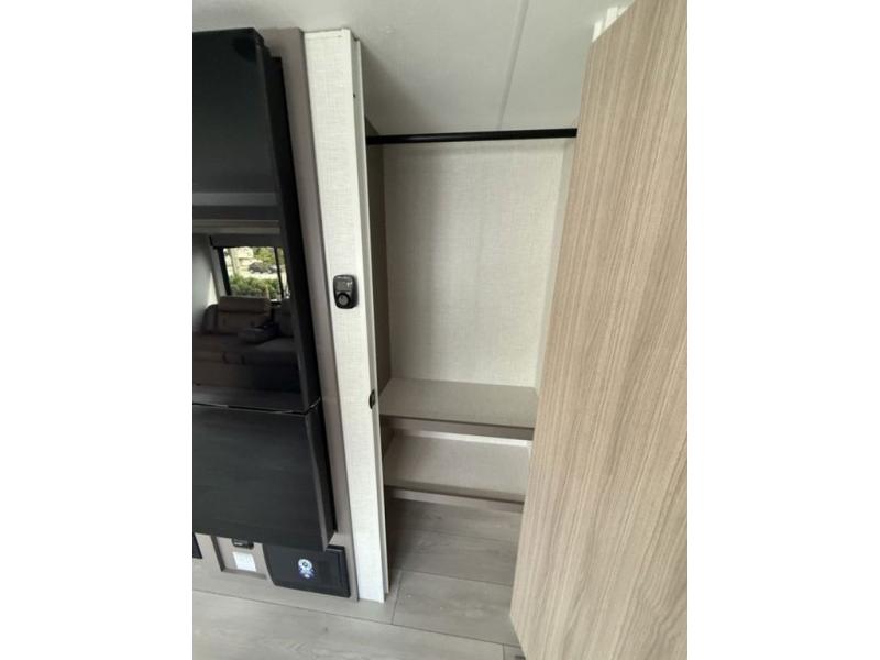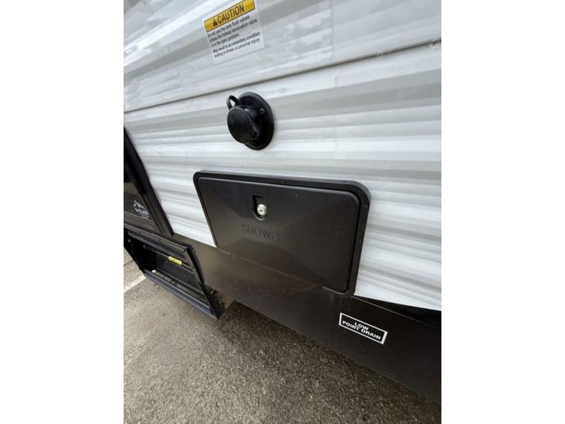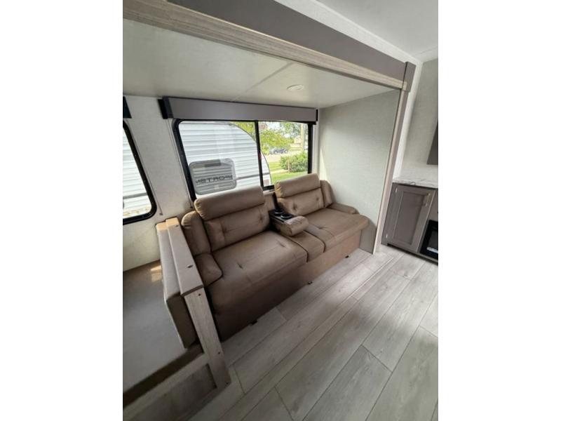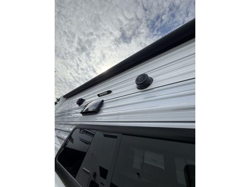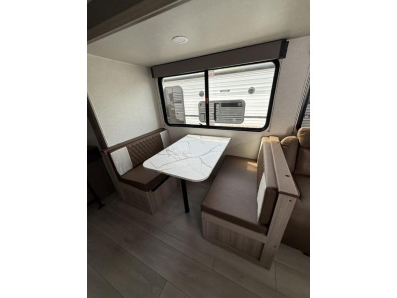 This is a great travel trailer to sleep all your friends or family! Once you arrive at the campground, the chef of your group can prepare lunch on the outside kitchen that includes a griddle and a refrigerator. The 18' power awning here will provide shade from the hot sun, and you can grab the lawn chairs from the pass-through storage to relax. You will find plenty of seating space inside on the 70" sofa and booth dinette within the large slide out, plus there is an entertainment center here. The interior kitchen includes everything you need to prepare meals each day, including a three burner cooktop, a microwave oven, plus a wardrobe/pantry for jackets or dry goods!