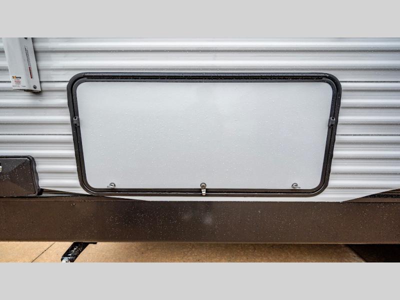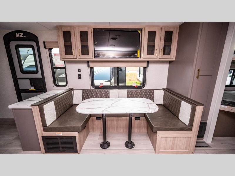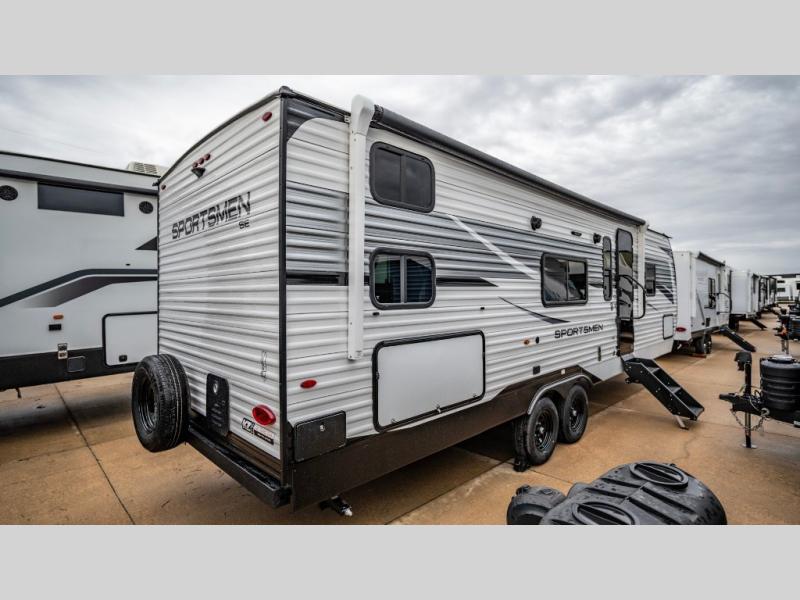 Each Sportsmen SE travel trailer and toy hauler by KZ is constructed with KZ exclusive tough shield exterior metal, a one-piece seamless walk-on Tufflex roofing material, and diamond plate rock guard to protect your unit from road debris. You will appreciate the extra large baggage doors for stowing away your gear when not in use, and tinted windows to help keep the harmful sun rays out plus keeping it cooler inside. Some of the exterior conveniences found in the mandatory Advantage Package are the solid folding steps with a large folding grab handle for easy entry and exit, a full glass friction hinged entry door, plus an exterior shower for your pets or to rinse off before you head inside. You'll also appreciate the nitrogen-filled tires, solar and backup camera prep, plus a Leash Latch with a bonus beverage opener. You'll feel right at home inside with linoleum flooring throughout, a 13,500 BTU air conditioner, large overhead cabinets, a shower surround, and much more!