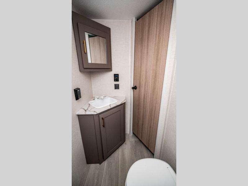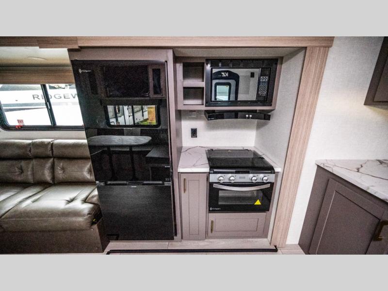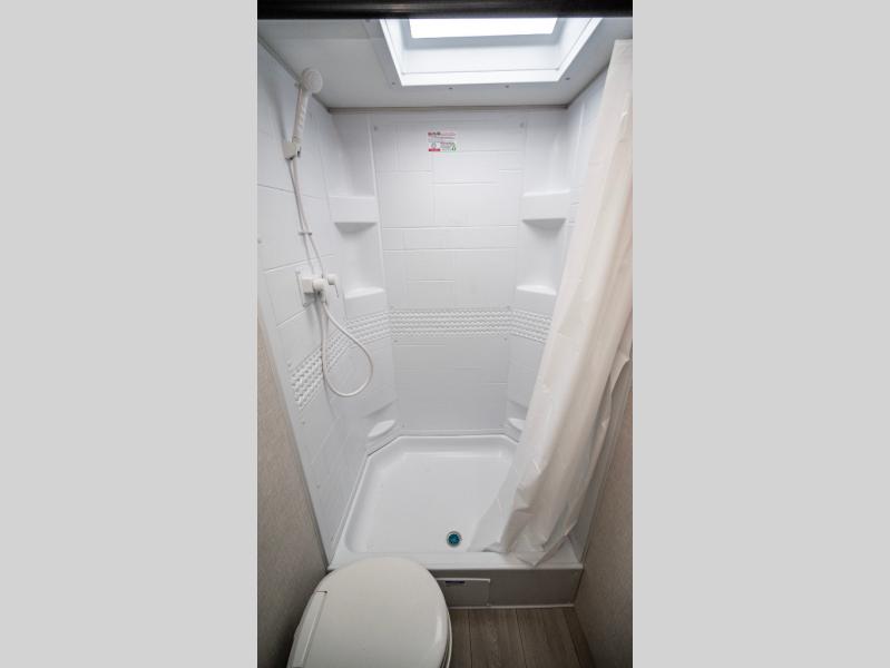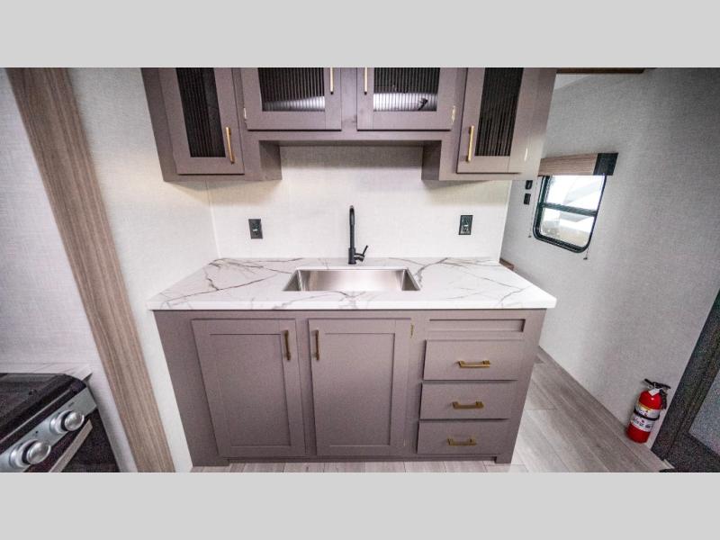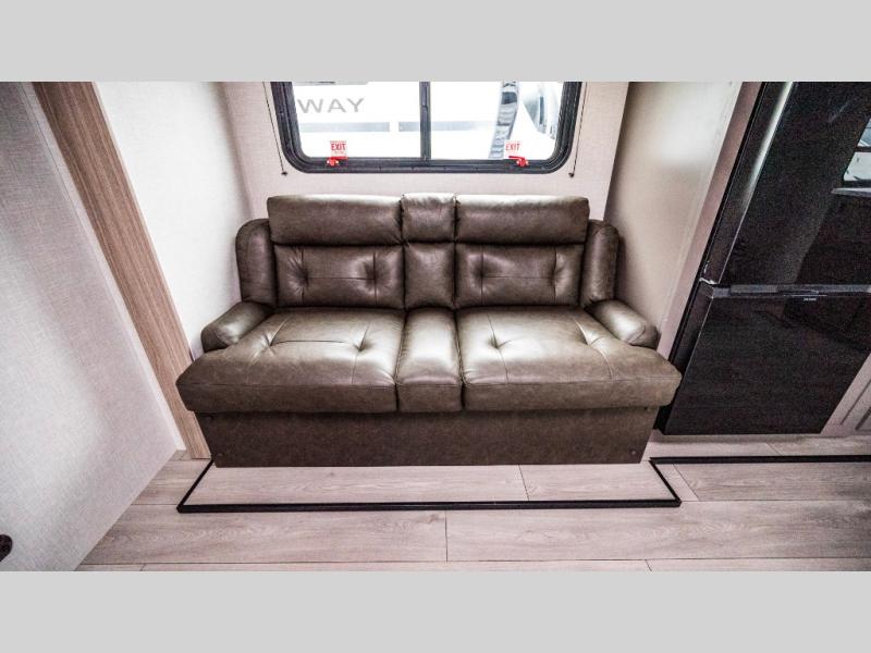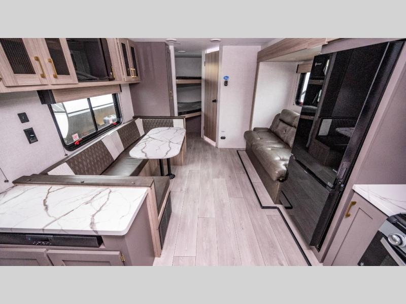 This is a great travel trailer to sleep all your friends or family! Once you arrive at the campground, the chef of your group can prepare lunch on the outside kitchen that includes a griddle and a refrigerator. The 20' power awning will provide shade from the hot sun, and you can grab the lawn chairs from the pass-through storage to relax. Once entering the travel trailer you will find a shoe storage conveniently placed by the entrance so you can neatly store your footwear. You'll find plenty of seating space inside on the 70" sofa, plus there is a u-shaped dinette that will be perfect for either having a quick meal or a long nap. The interior kitchen includes everything you need to prepare meals each day, including a three burner cooktop, a microwave oven, plus a pantry for snacks and dry goods!