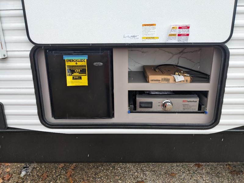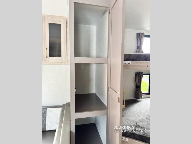 This is a great travel trailer to sleep all your friends or family! Once you arrive at the campground, the chef of your group can prepare lunch on the outside kitchen that includes a griddle and a refrigerator. The 20' power awning will provide shade from the hot sun, and you can grab the lawn chairs from the pass-through storage to relax. Once entering the travel trailer you will find a shoe storage conveniently placed by the entrance so you can neatly store your footwear. You'll find plenty of seating space inside on the 70" sofa, plus there is a u-shaped dinette that will be perfect for either having a quick meal or a long nap. The interior kitchen includes everything you need to prepare meals each day, including a three burner cooktop, a microwave oven, plus a pantry for snacks and dry goods!