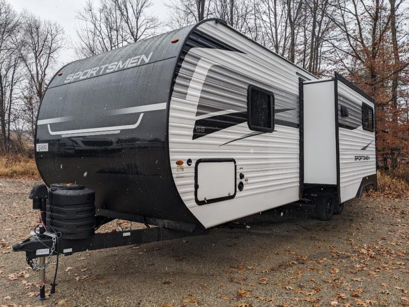 Each Sportsmen SE travel trailer and toy hauler by KZ is constructed with KZ exclusive tough shield exterior metal, a one-piece seamless walk-on Tufflex roofing material, and diamond plate rock guard to protect your unit from road debris. You will appreciate the extra large baggage doors for stowing away your gear when not in use, and tinted windows to help keep the harmful sun rays out plus keeping it cooler inside. Some of the exterior conveniences found in the mandatory Advantage Package are the solid folding steps with a large folding grab handle for easy entry and exit, a full glass friction hinged entry door, plus an exterior shower for your pets or to rinse off before you head inside. You'll also appreciate the nitrogen-filled tires, solar and backup camera prep, plus a Leash Latch with a bonus beverage opener. You'll feel right at home inside with linoleum flooring throughout, a 13,500 BTU air conditioner, large overhead cabinets, a shower surround, and much more!