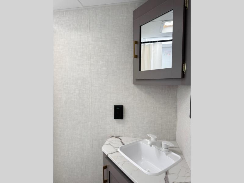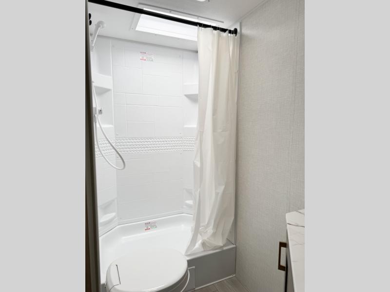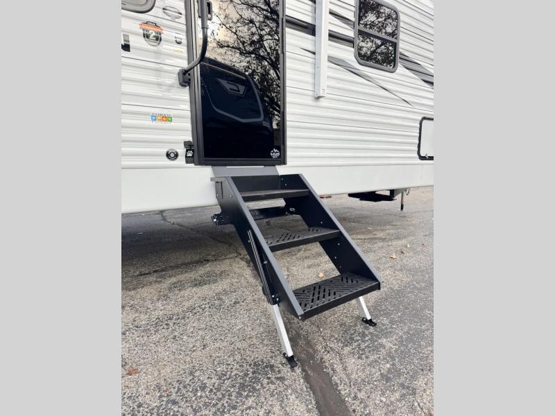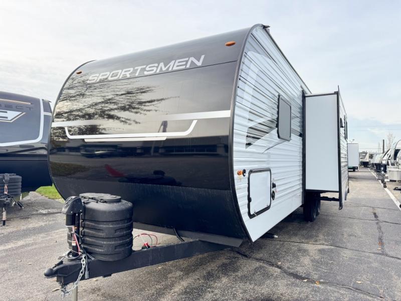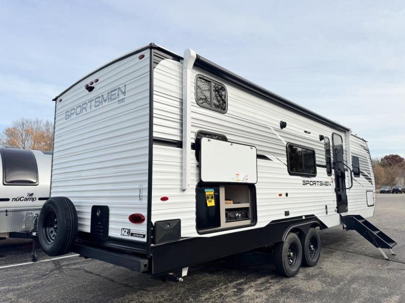 Each Sportsmen SE travel trailer and toy hauler by KZ is constructed with KZ exclusive tough shield exterior metal, a one-piece seamless walk-on Tufflex roofing material, and diamond plate rock guard to protect your unit from road debris. You will appreciate the extra large baggage doors for stowing away your gear when not in use, and tinted windows to help keep the harmful sun rays out plus keeping it cooler inside. Some of the exterior conveniences found in the mandatory Advantage Package are the solid folding steps with a large folding grab handle for easy entry and exit, a full glass friction hinged entry door, plus an exterior shower for your pets or to rinse off before you head inside. You'll also appreciate the nitrogen-filled tires, solar and backup camera prep, plus a Leash Latch with a bonus beverage opener. You'll feel right at home inside with linoleum flooring throughout, a 13,500 BTU air conditioner, large overhead cabinets, a shower surround, and much more!