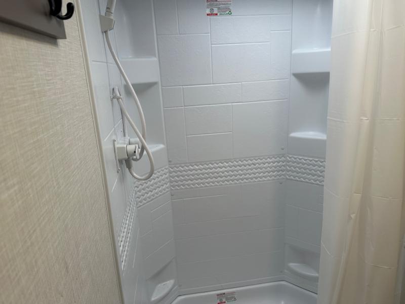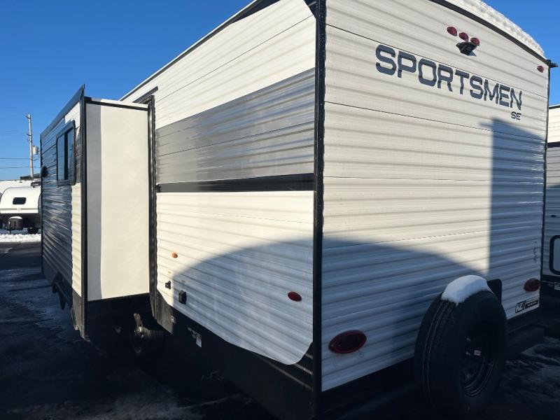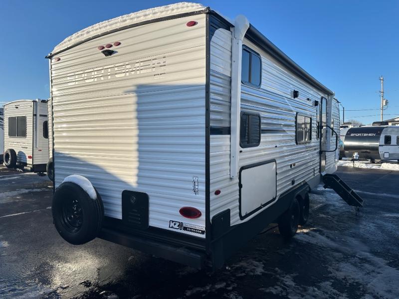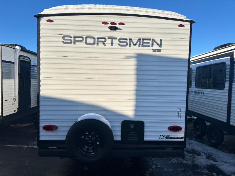Each Sportsmen SE travel trailer and toy hauler by KZ is constructed with KZ exclusive tough shield exterior metal, a one-piece seamless walk-on Tufflex roofing material, and diamond plate rock guard to protect your unit from road debris. You will appreciate the extra large baggage doors for stowing away your gear when not in use, and tinted windows to help keep the harmful sun rays out plus keeping it cooler inside. Some of the exterior conveniences found in the mandatory Advantage Package are the solid folding steps with a large folding grab handle for easy entry and exit, a full glass friction hinged entry door, plus an exterior shower for your pets or to rinse off before you head inside. You'll also appreciate the nitrogen-filled tires, solar and backup camera prep, plus a Leash Latch with a bonus beverage opener. You'll feel right at home inside with linoleum flooring throughout, a 13,500 BTU air conditioner, large overhead cabinets, a shower surround, and much more!