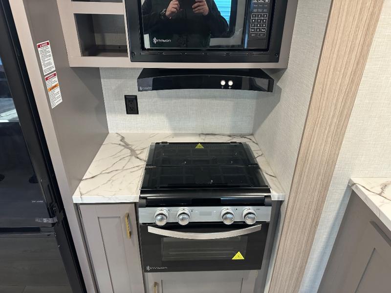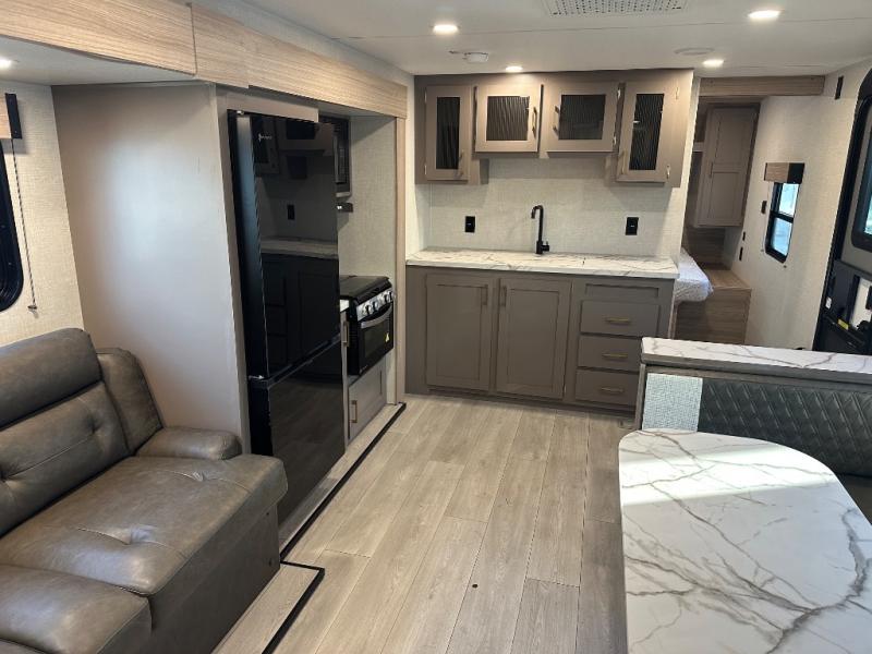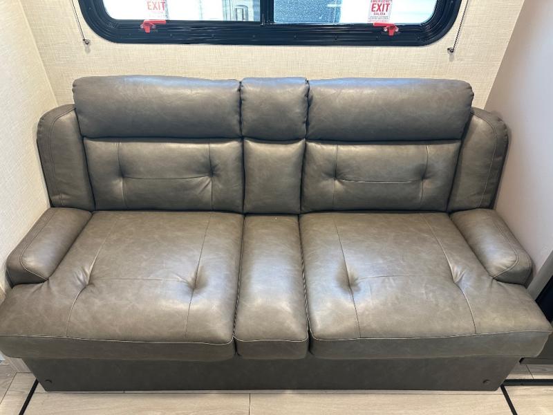 This is a great travel trailer to sleep all your friends or family! Once you arrive at the campground, the chef of your group can prepare lunch on the outside kitchen that includes a griddle and a refrigerator. The 20' power awning will provide shade from the hot sun, and you can grab the lawn chairs from the pass-through storage to relax. Once entering the travel trailer you will find a shoe storage conveniently placed by the entrance so you can neatly store your footwear. You'll find plenty of seating space inside on the 70" sofa, plus there is a u-shaped dinette that will be perfect for either having a quick meal or a long nap. The interior kitchen includes everything you need to prepare meals each day, including a three burner cooktop, a microwave oven, plus a pantry for snacks and dry goods!