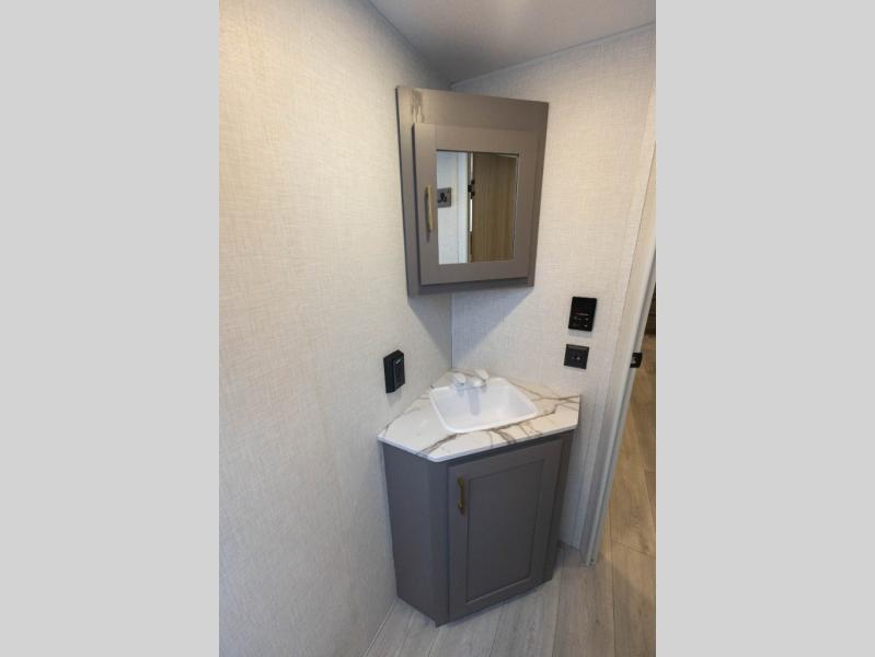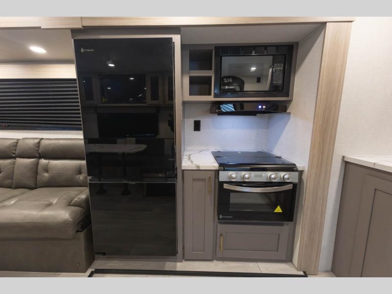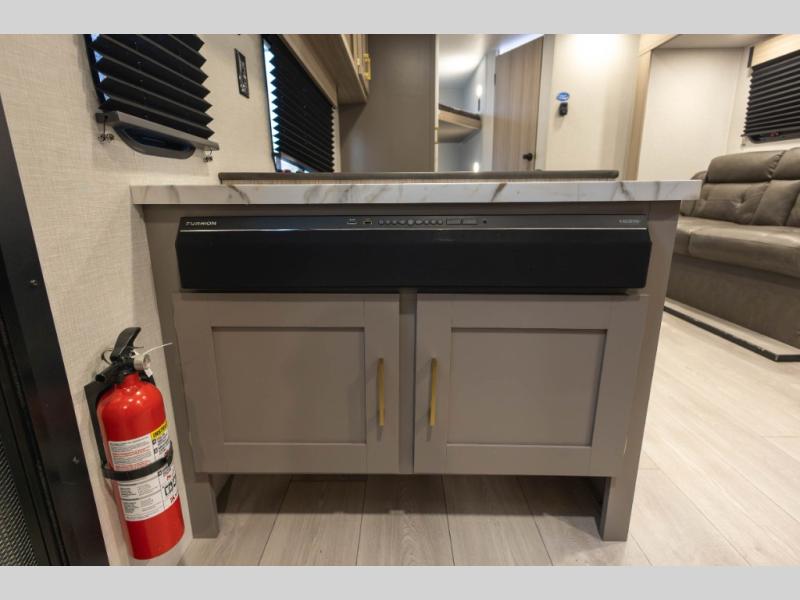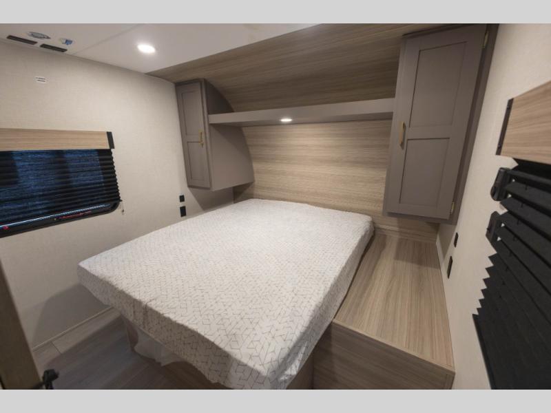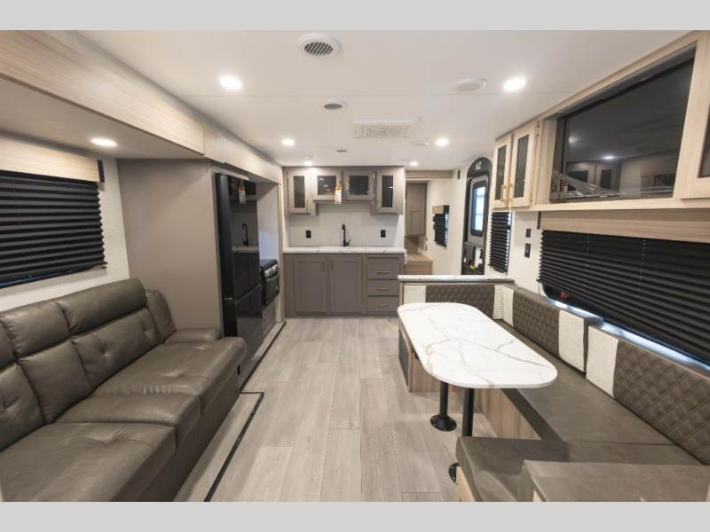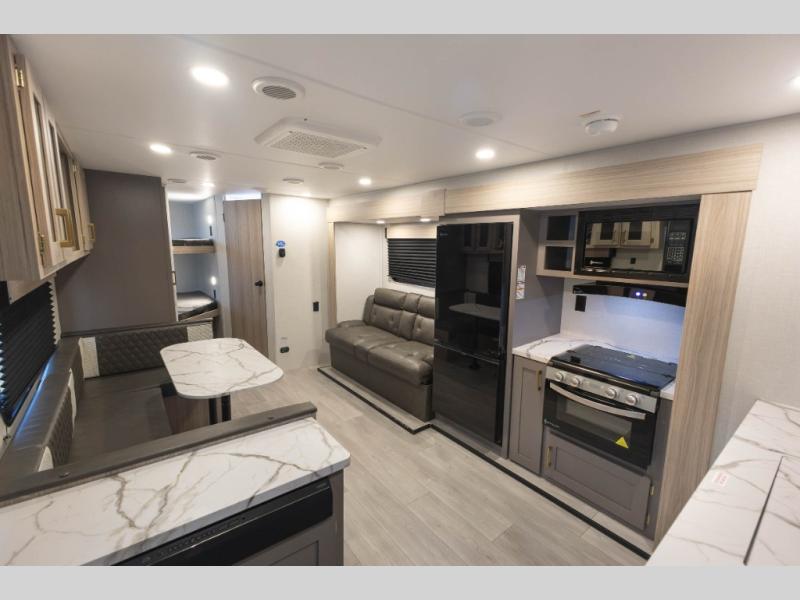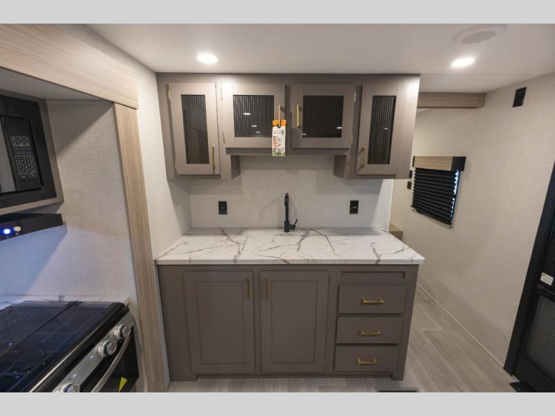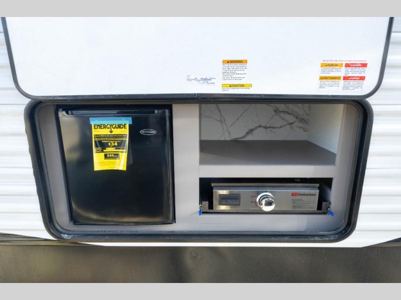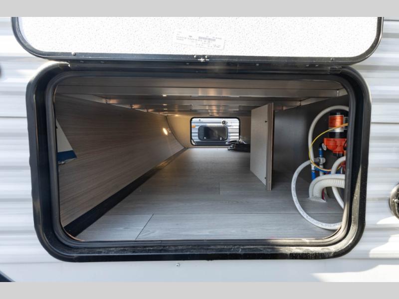 This is a great travel trailer to sleep all your friends or family! Once you arrive at the campground, the chef of your group can prepare lunch on the outside kitchen that includes a griddle and a refrigerator. The 20' power awning will provide shade from the hot sun, and you can grab the lawn chairs from the pass-through storage to relax. Once entering the travel trailer you will find a shoe storage conveniently placed by the entrance so you can neatly store your footwear. You'll find plenty of seating space inside on the 70" sofa, plus there is a u-shaped dinette that will be perfect for either having a quick meal or a long nap. The interior kitchen includes everything you need to prepare meals each day, including a three burner cooktop, a microwave oven, plus a pantry for snacks and dry goods!