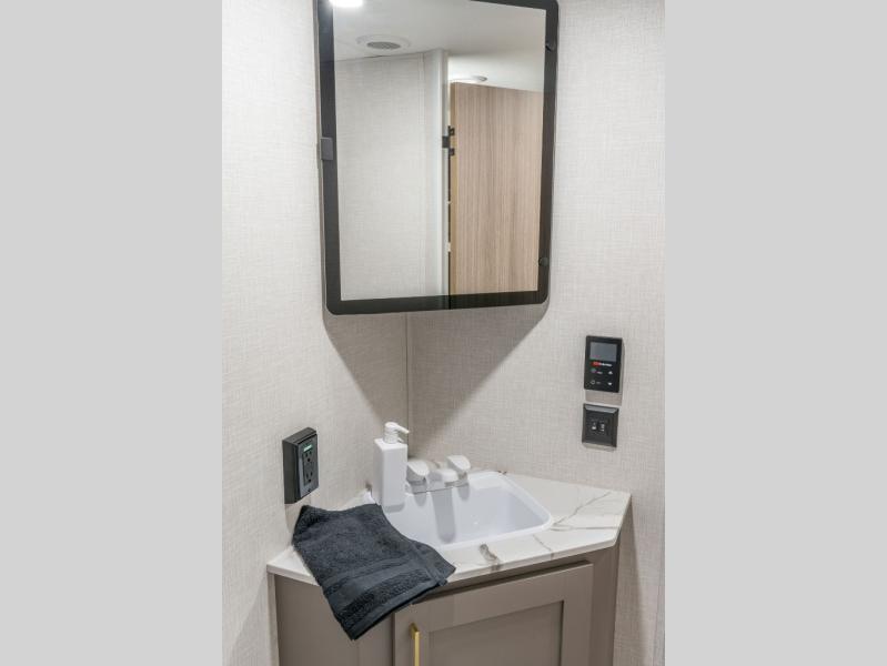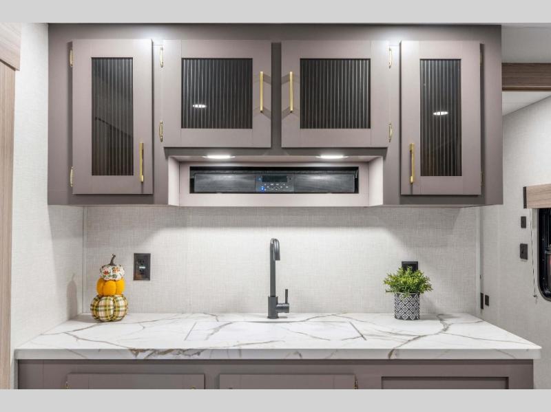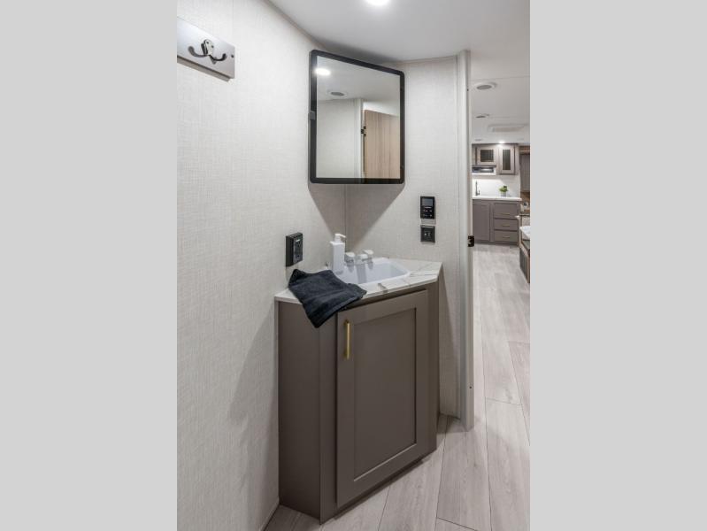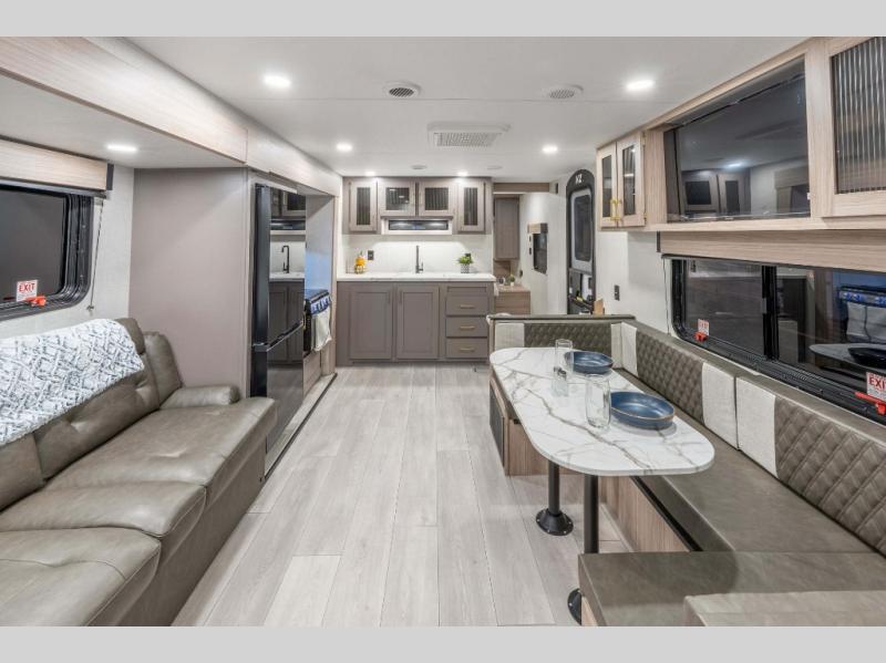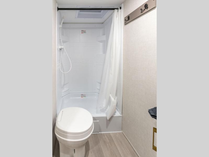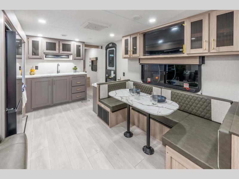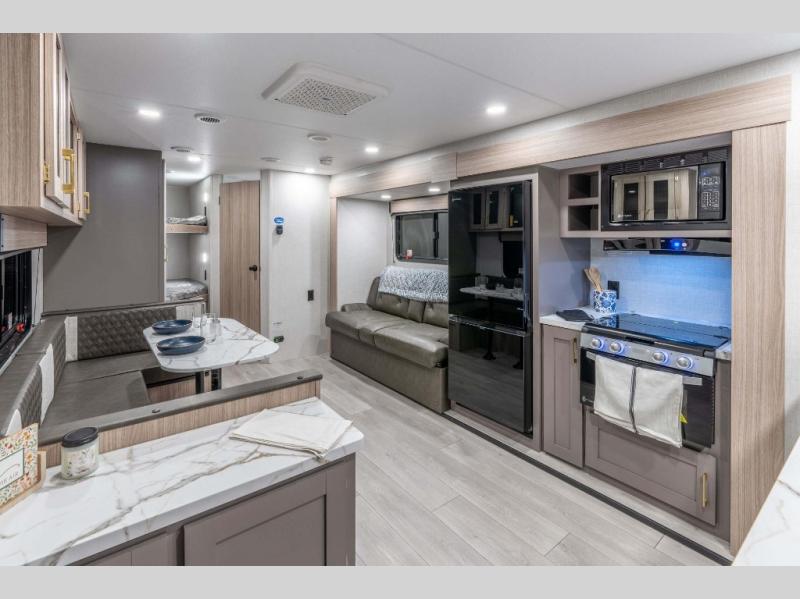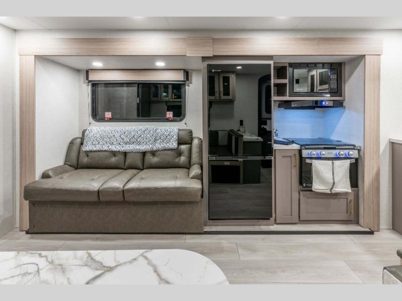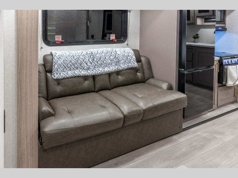 This is a great travel trailer to sleep all your friends or family! Once you arrive at the campground, the chef of your group can prepare lunch on the outside kitchen that includes a griddle and a refrigerator. The 20' power awning will provide shade from the hot sun, and you can grab the lawn chairs from the pass-through storage to relax. Once entering the travel trailer you will find a shoe storage conveniently placed by the entrance so you can neatly store your footwear. You'll find plenty of seating space inside on the 70" sofa, plus there is a u-shaped dinette that will be perfect for either having a quick meal or a long nap. The interior kitchen includes everything you need to prepare meals each day, including a three burner cooktop, a microwave oven, plus a pantry for snacks and dry goods!