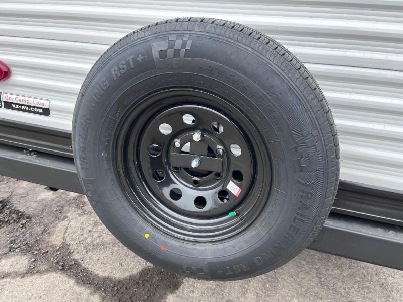 Each Sportsmen SE travel trailer and toy hauler by KZ is constructed with KZ exclusive tough shield exterior metal, a one-piece seamless walk-on Tufflex roofing material, and diamond plate rock guard to protect your unit from road debris. You will appreciate the extra large baggage doors for stowing away your gear when not in use, and tinted windows to help keep the harmful sun rays out plus keeping it cooler inside. Some of the exterior conveniences found in the mandatory Advantage Package are the solid folding steps with a large folding grab handle for easy entry and exit, a full glass friction hinged entry door, plus an exterior shower for your pets or to rinse off before you head inside. You'll also appreciate the nitrogen-filled tires, solar and backup camera prep, plus a Leash Latch with a bonus beverage opener. You'll feel right at home inside with linoleum flooring throughout, a 13,500 BTU air conditioner, large overhead cabinets, a shower surround, and much more!