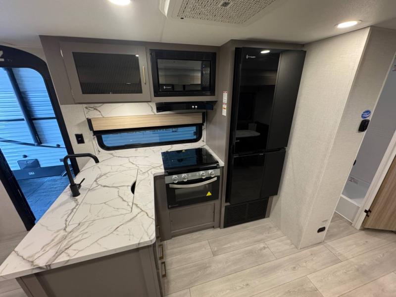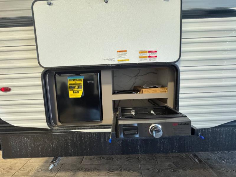 Each Sportsmen SE travel trailer and toy hauler by KZ is constructed with KZ exclusive tough shield exterior metal, a one-piece seamless walk-on Tufflex roofing material, and diamond plate rock guard to protect your unit from road debris. You will appreciate the extra large baggage doors for stowing away your gear when not in use, and tinted windows to help keep the harmful sun rays out plus keeping it cooler inside. Some of the exterior conveniences found in the mandatory Advantage Package are the solid folding steps with a large folding grab handle for easy entry and exit, a full glass friction hinged entry door, plus an exterior shower for your pets or to rinse off before you head inside. You'll also appreciate the nitrogen-filled tires, solar and backup camera prep, plus a Leash Latch with a bonus beverage opener. You'll feel right at home inside with linoleum flooring throughout, a 13,500 BTU air conditioner, large overhead cabinets, a shower surround, and much more!