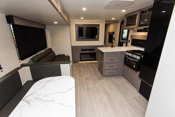 Wow! Take a look at this travel trailer with two private bedroom that include queen beds and space to store your clothes. Each room also has a TV mount if you choose to bring along your own television for late-night movies in bed. The main living area is spacious with the large slide out, and here you can relax on the sofa or around the U-shaped dinette. This model also includes a full bath with a 40" shower that will allow you to clean up each day.