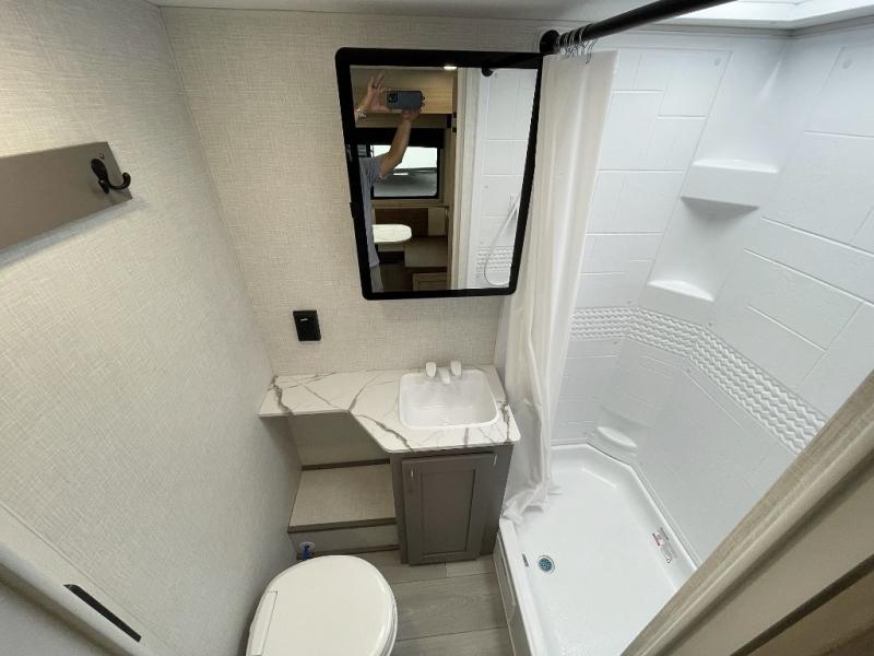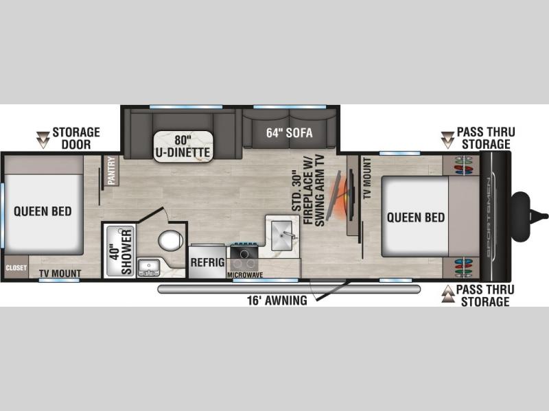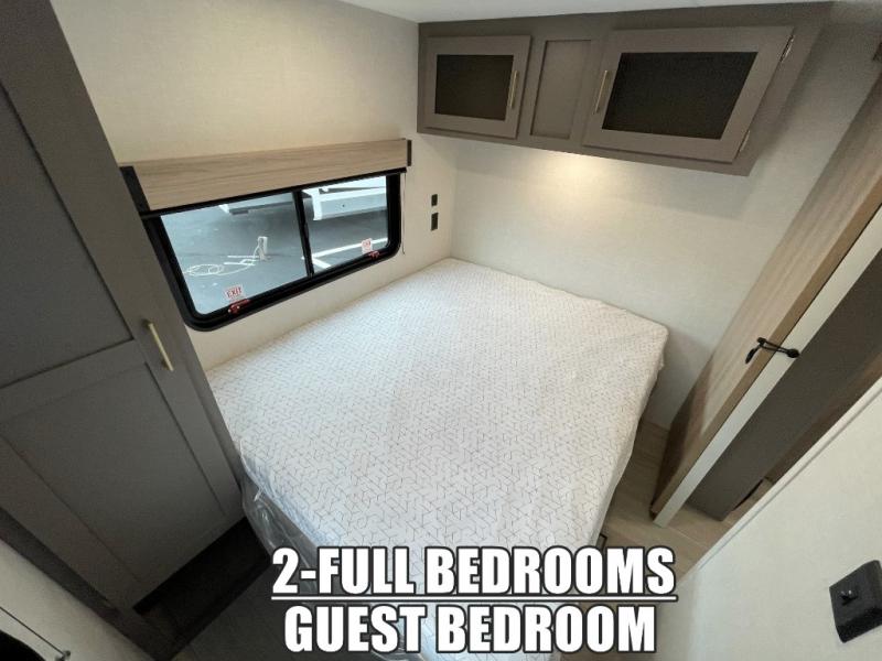 Wow! Take a look at this travel trailer with two private bedroom that include queen beds and space to store your clothes. Each room also has a TV mount if you choose to bring along your own television for late-night movies in bed. The main living area is spacious with the large slide out, and here you can relax on the sofa or around the U-shaped dinette. This model also includes a full bath with a 40" shower that will allow you to clean up each day.