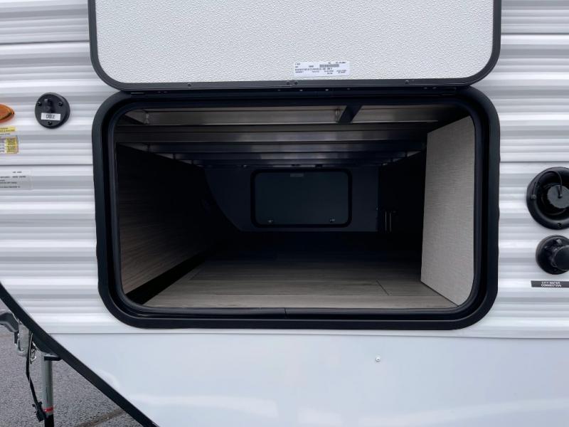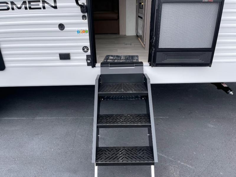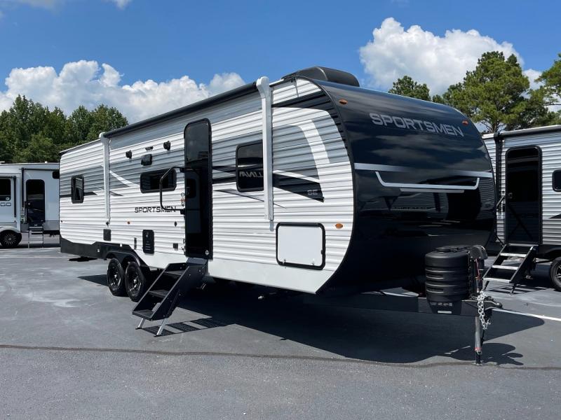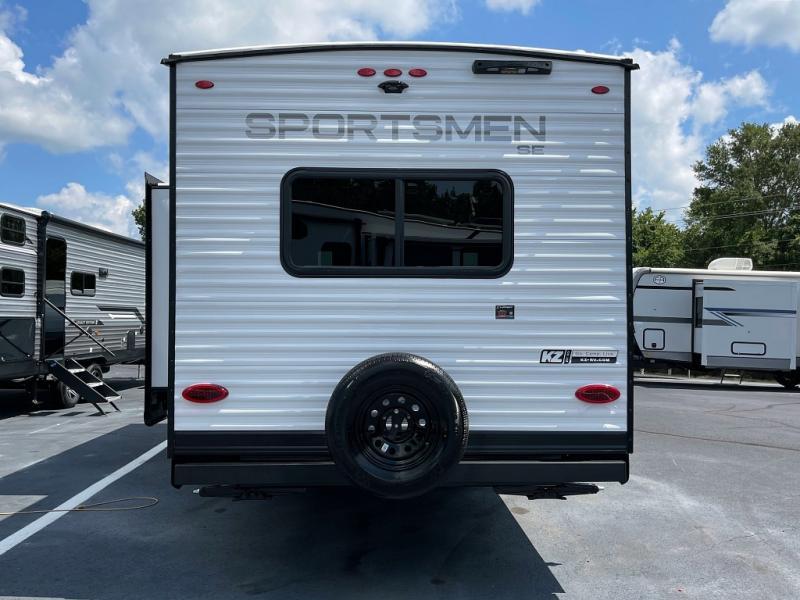 Each Sportsmen SE travel trailer and toy hauler by KZ is constructed with KZ exclusive tough shield exterior metal, a one-piece seamless walk-on Tufflex roofing material, and diamond plate rock guard to protect your unit from road debris. You will appreciate the extra large baggage doors for stowing away your gear when not in use, and tinted windows to help keep the harmful sun rays out plus keeping it cooler inside. Some of the exterior conveniences found in the mandatory Advantage Package are the solid folding steps with a large folding grab handle for easy entry and exit, a full glass friction hinged entry door, plus an exterior shower for your pets or to rinse off before you head inside. You'll also appreciate the nitrogen-filled tires, solar and backup camera prep, plus a Leash Latch with a bonus beverage opener. You'll feel right at home inside with linoleum flooring throughout, a 13,500 BTU air conditioner, large overhead cabinets, a shower surround, and much more!
