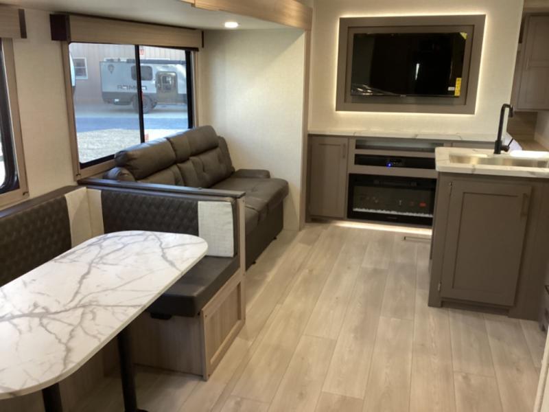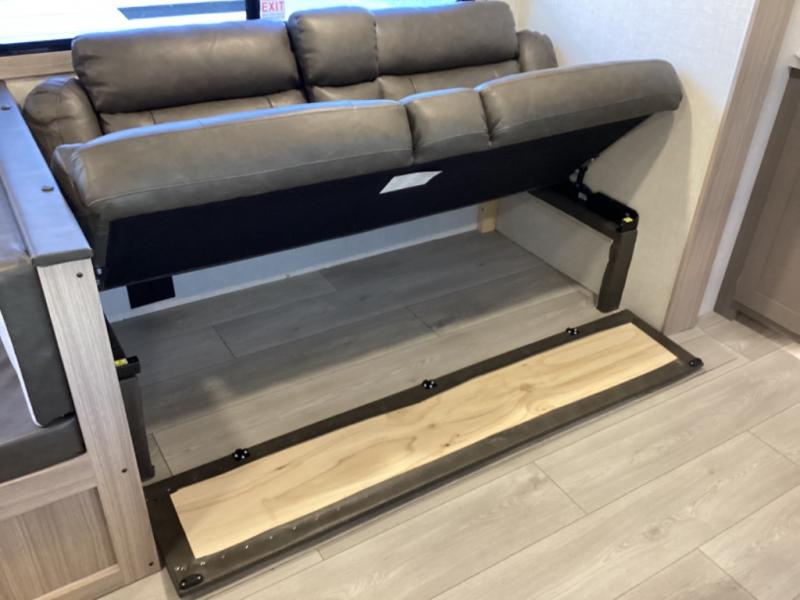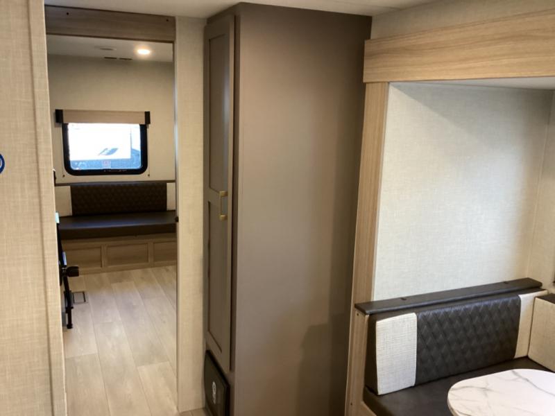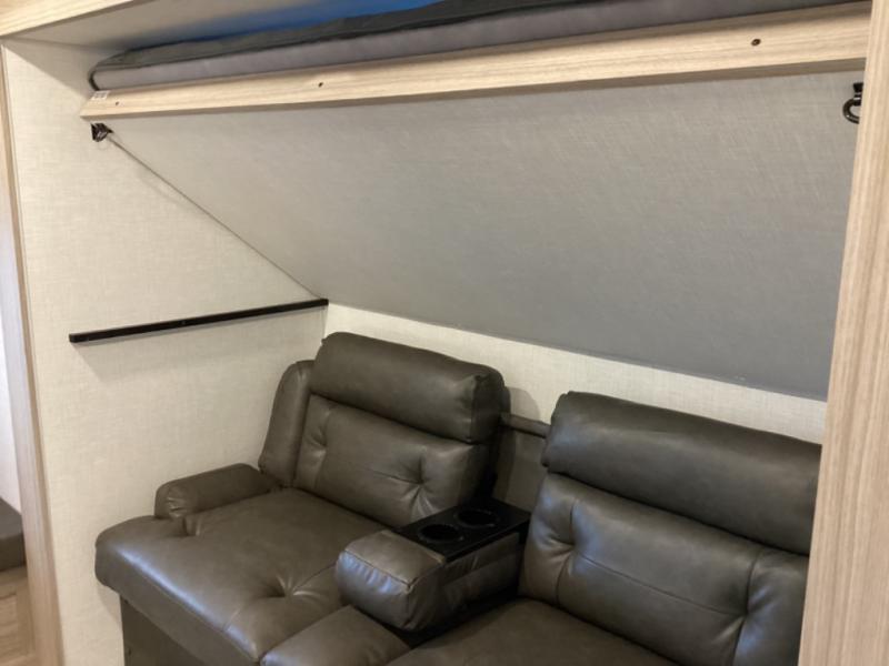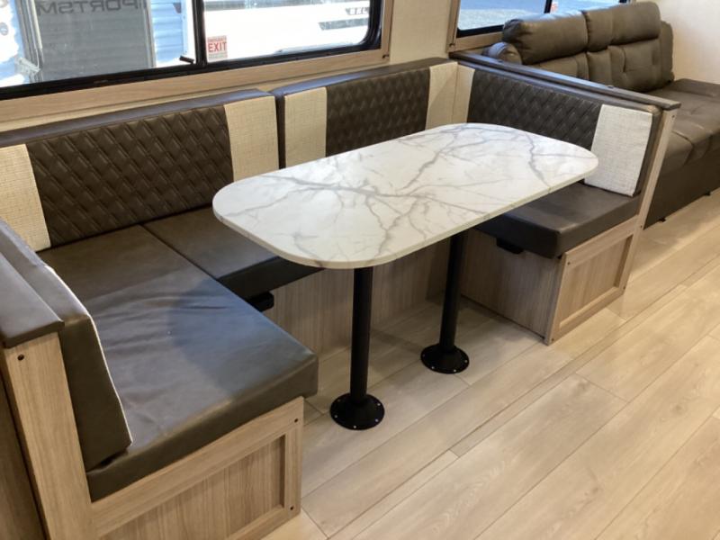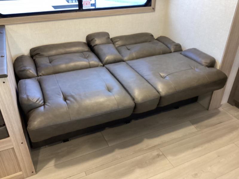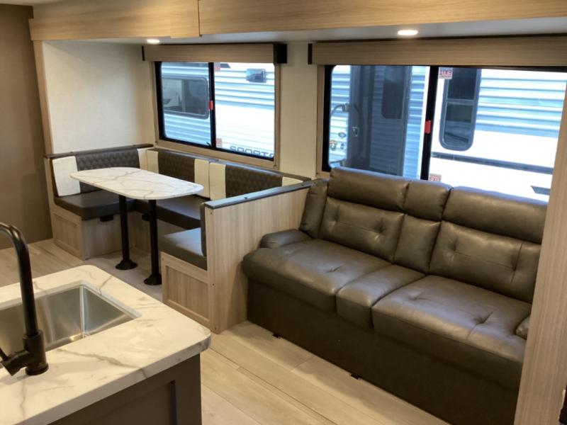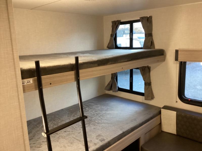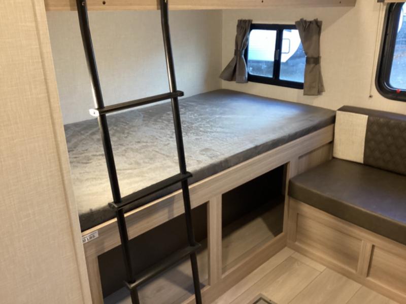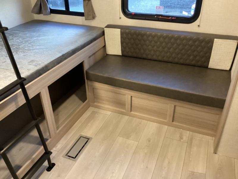 If you've been looking for a travel trailer with plenty of space for your family or group of friends, look no further than this one! The private bunkhouse includes two bunks, plus a third bunk across the room and a jiffy sofa below. There is also a bench seat here, and the full bath is close by for convenience. Everyone can gather in the main living area at the 80" U-shaped dinette, and there is a 64" sofa here for more seating space. If the weather is nice, head outdoors to relax under the 20' power awning with LED lights as the cook prepares dinner on the outside griddle!