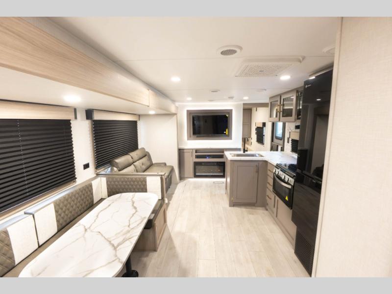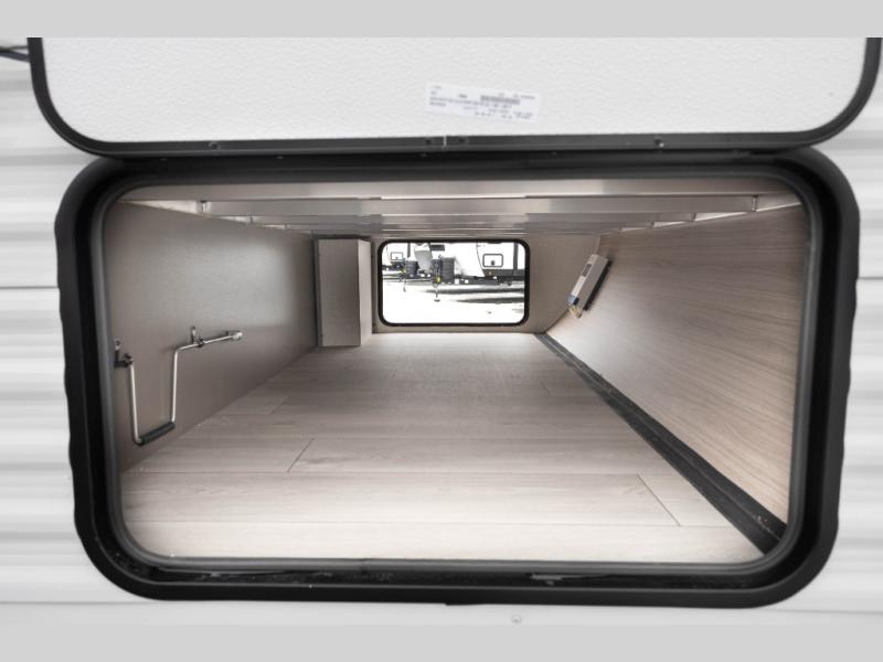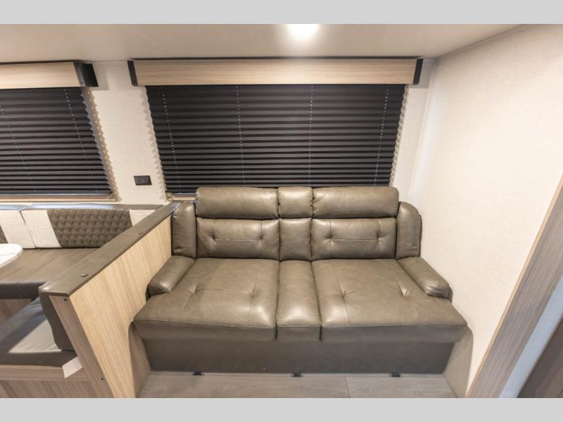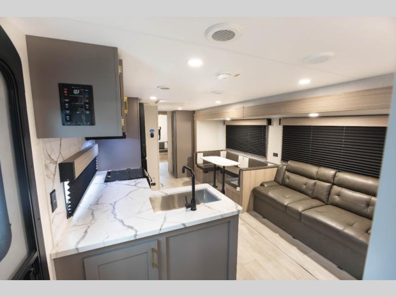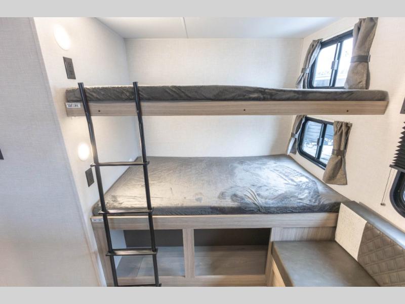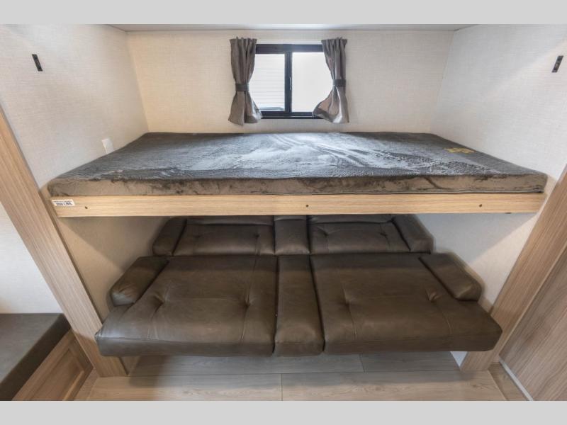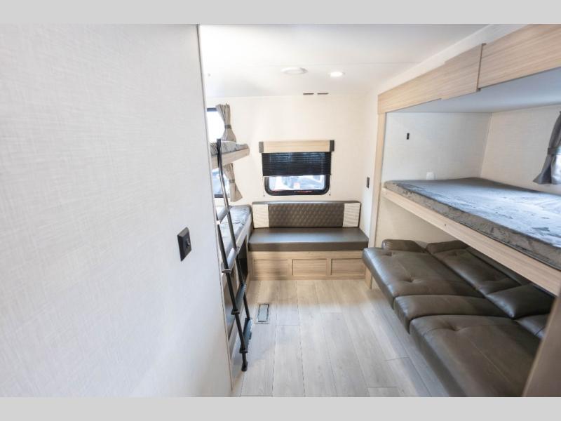 If you've been looking for a travel trailer with plenty of space for your family or group of friends, look no further than this one! The private bunkhouse includes two bunks, plus a third bunk across the room and a jiffy sofa below. There is also a bench seat here, and the full bath is close by for convenience. Everyone can gather in the main living area at the 80" U-shaped dinette, and there is a 64" sofa here for more seating space. If the weather is nice, head outdoors to relax under the 20' power awning with LED lights as the cook prepares dinner on the outside griddle!