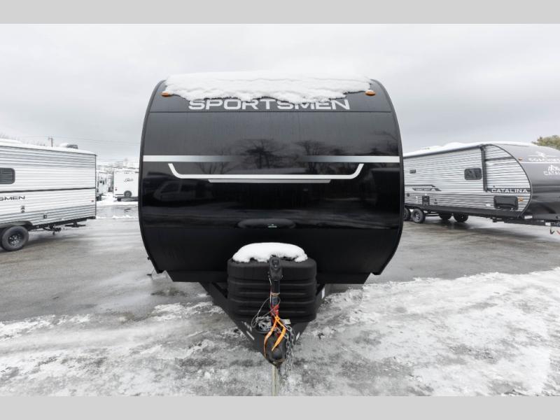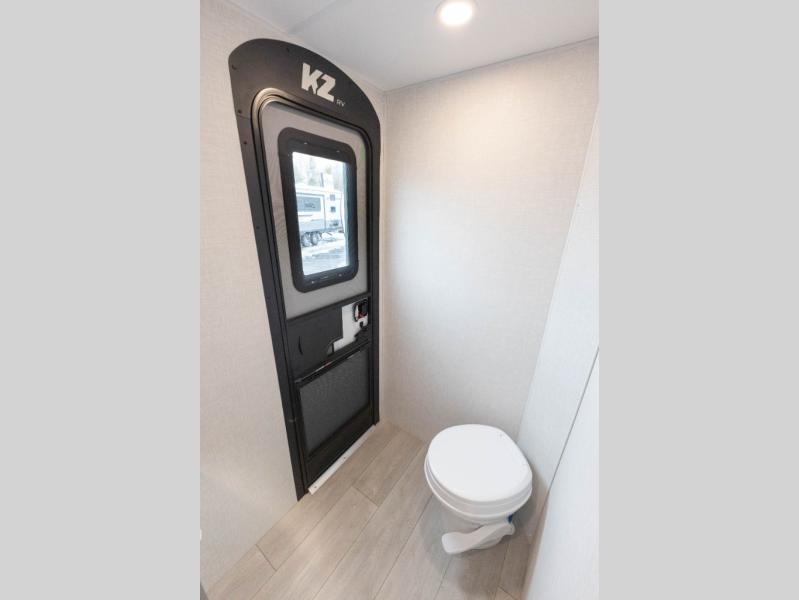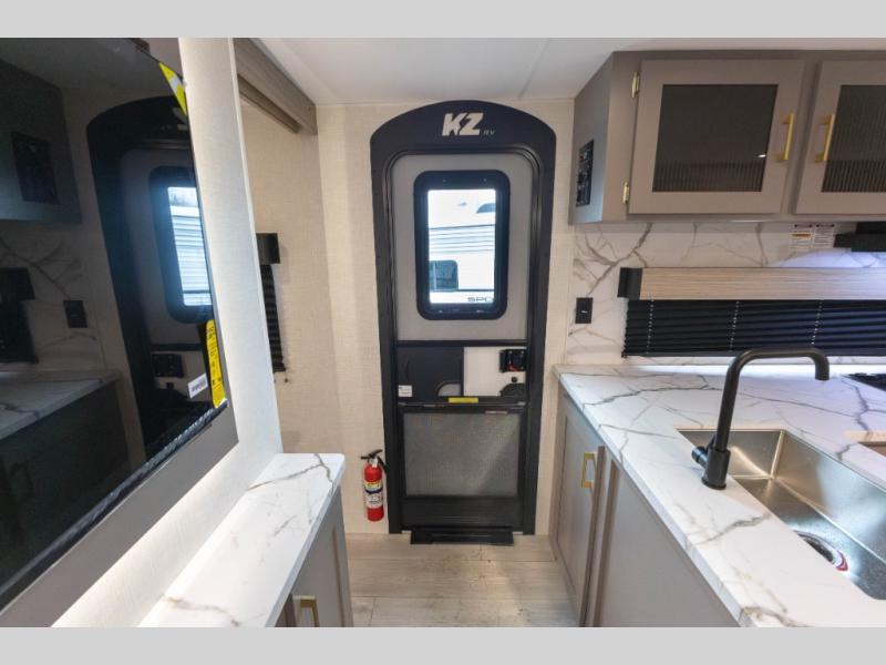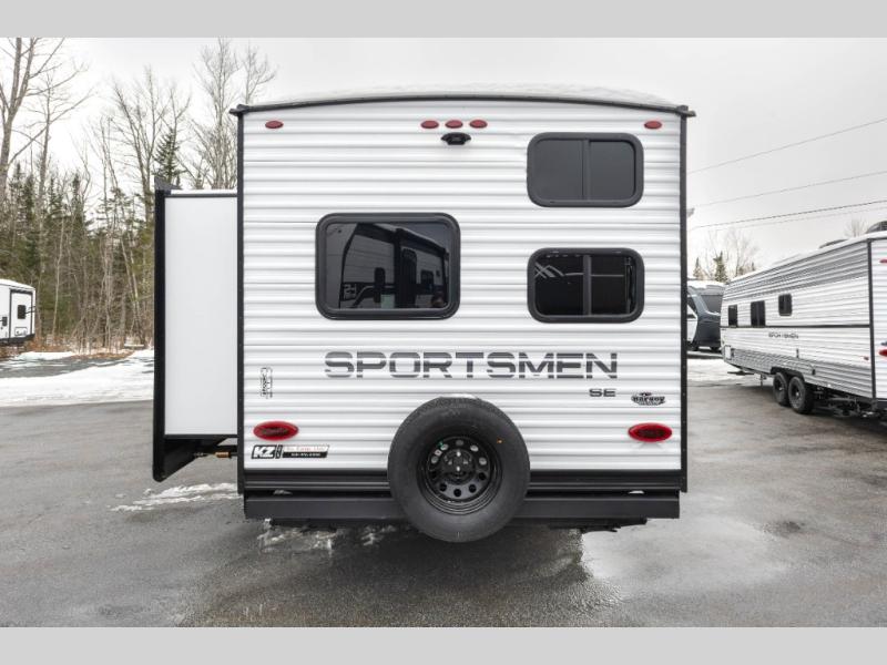 Each Sportsmen SE travel trailer and toy hauler by KZ is constructed with KZ exclusive tough shield exterior metal, a one-piece seamless walk-on Tufflex roofing material, and diamond plate rock guard to protect your unit from road debris. You will appreciate the extra large baggage doors for stowing away your gear when not in use, and tinted windows to help keep the harmful sun rays out plus keeping it cooler inside. Some of the exterior conveniences found in the mandatory Advantage Package are the solid folding steps with a large folding grab handle for easy entry and exit, a full glass friction hinged entry door, plus an exterior shower for your pets or to rinse off before you head inside. You'll also appreciate the nitrogen-filled tires, solar and backup camera prep, plus a Leash Latch with a bonus beverage opener. You'll feel right at home inside with linoleum flooring throughout, a 13,500 BTU air conditioner, large overhead cabinets, a shower surround, and much more!
