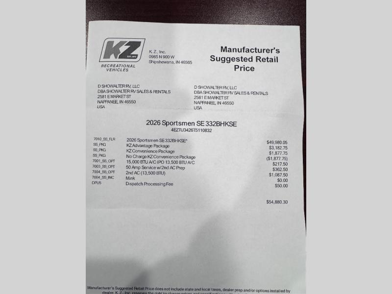 New 2026 KZ Sportsmen SE 332BHKSE Travel Trailer