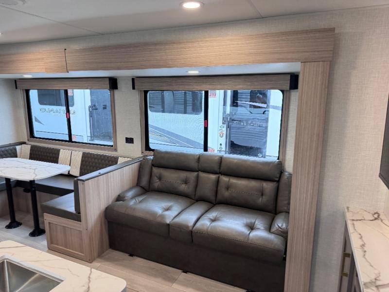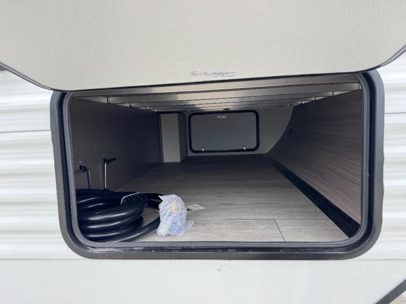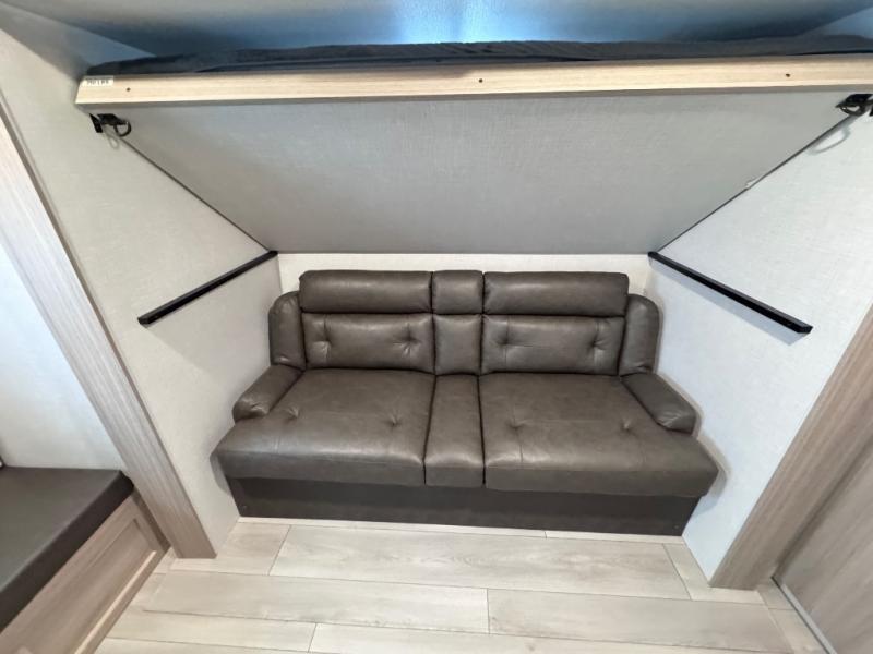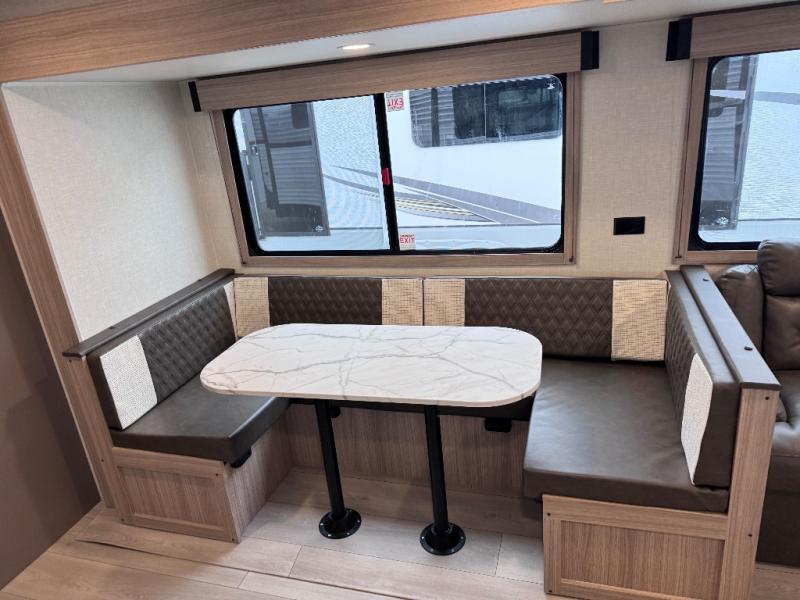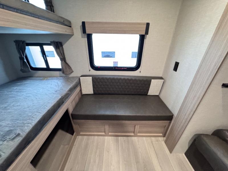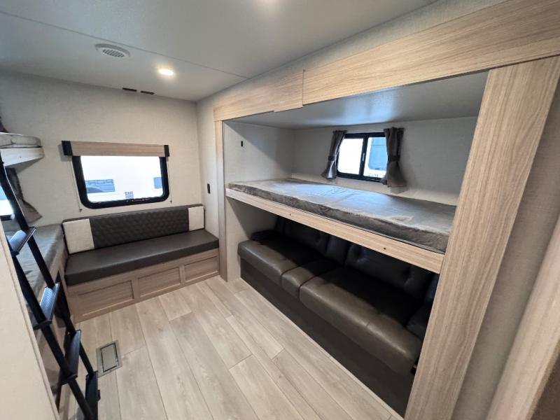 If you've been looking for a travel trailer with plenty of space for your family or group of friends, look no further than this one! The private bunkhouse includes two bunks, plus a third bunk across the room and a jiffy sofa below. There is also a bench seat here, and the full bath is close by for convenience. Everyone can gather in the main living area at the 80" U-shaped dinette, and there is a 64" sofa here for more seating space. If the weather is nice, head outdoors to relax under the 20' power awning with LED lights as the cook prepares dinner on the outside griddle!