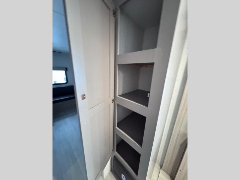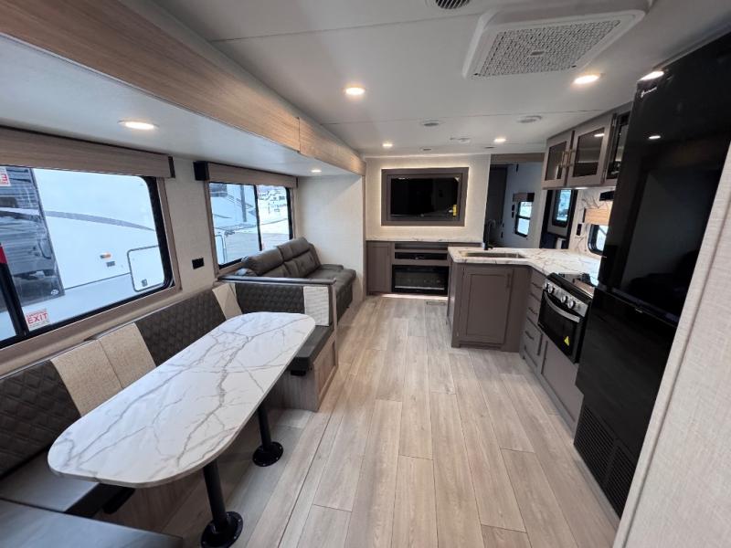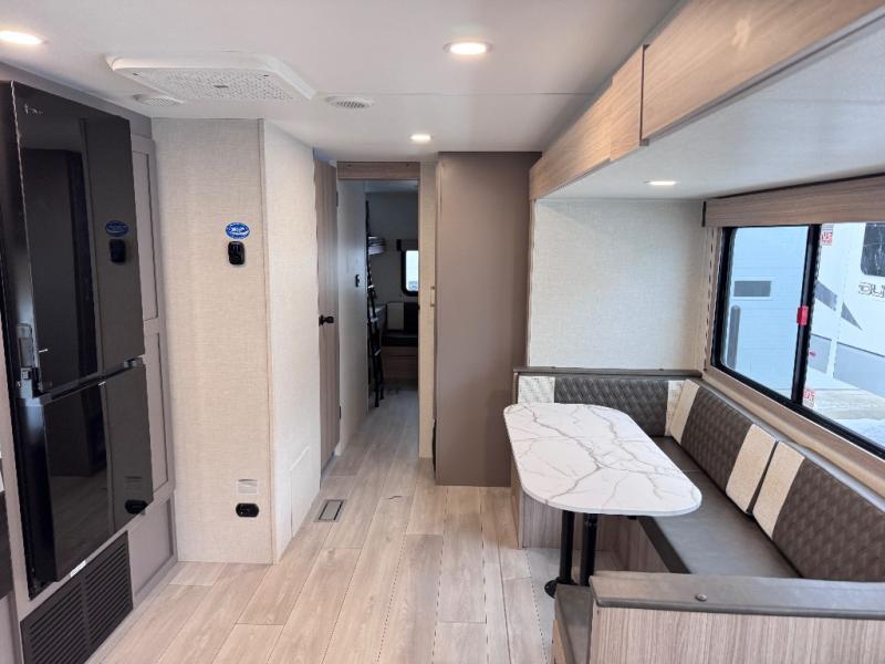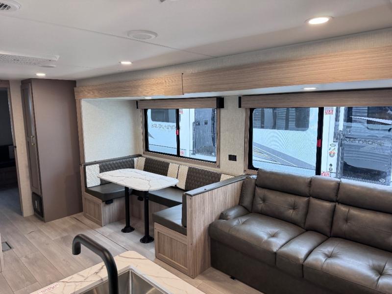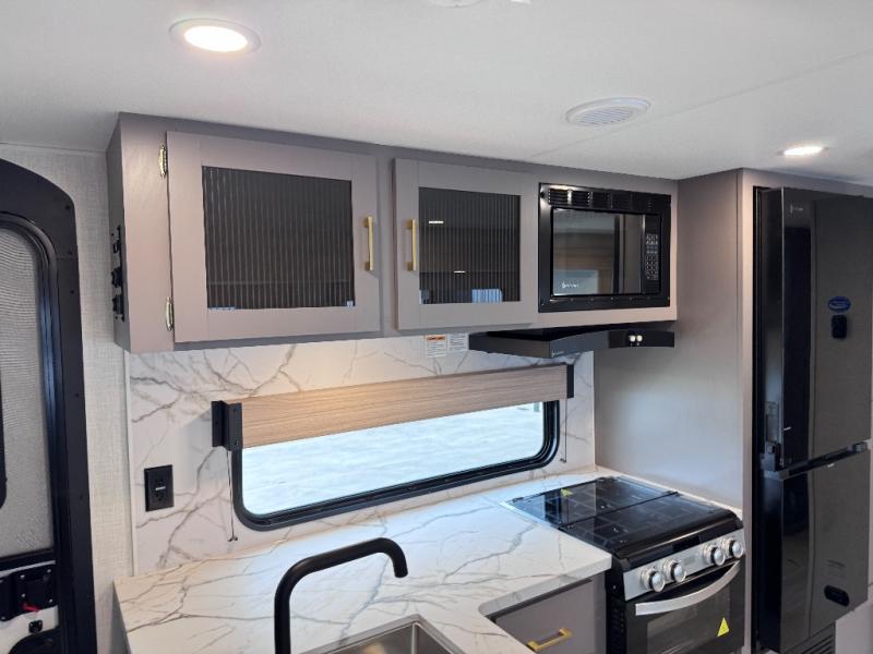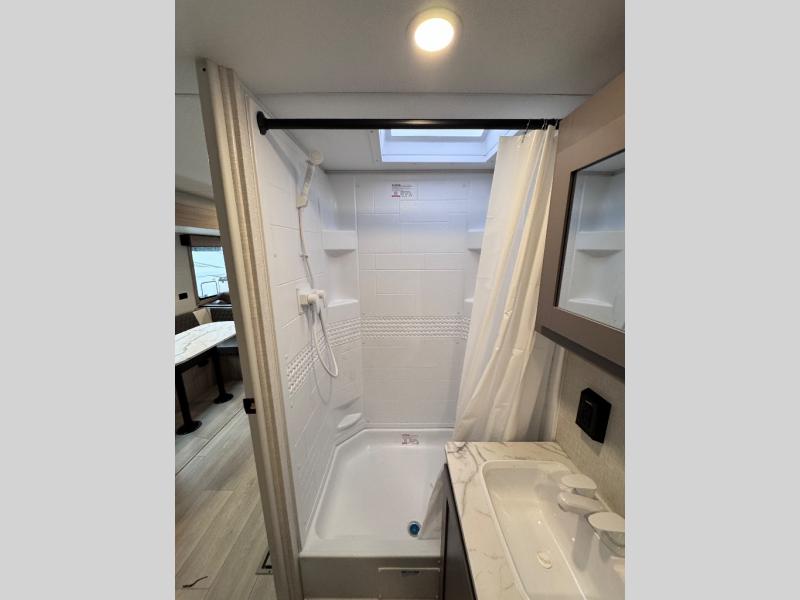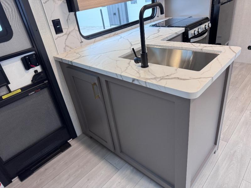 If you've been looking for a travel trailer with plenty of space for your family or group of friends, look no further than this one! The private bunkhouse includes two bunks, plus a third bunk across the room and a jiffy sofa below. There is also a bench seat here, and the full bath is close by for convenience. Everyone can gather in the main living area at the 80" U-shaped dinette, and there is a 64" sofa here for more seating space. If the weather is nice, head outdoors to relax under the 20' power awning with LED lights as the cook prepares dinner on the outside griddle!