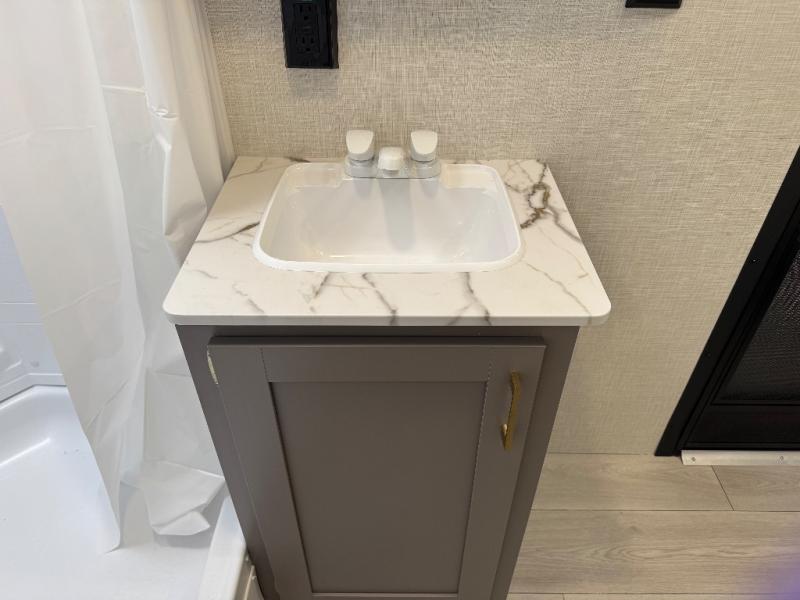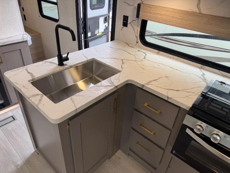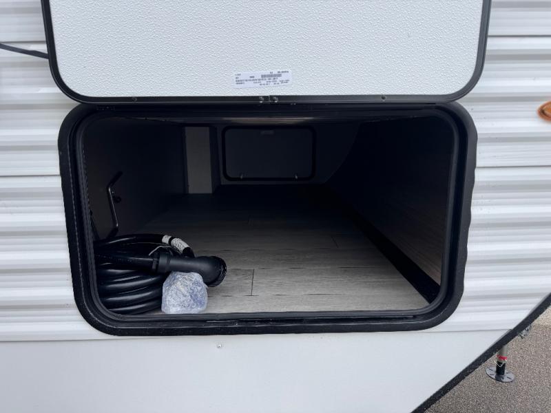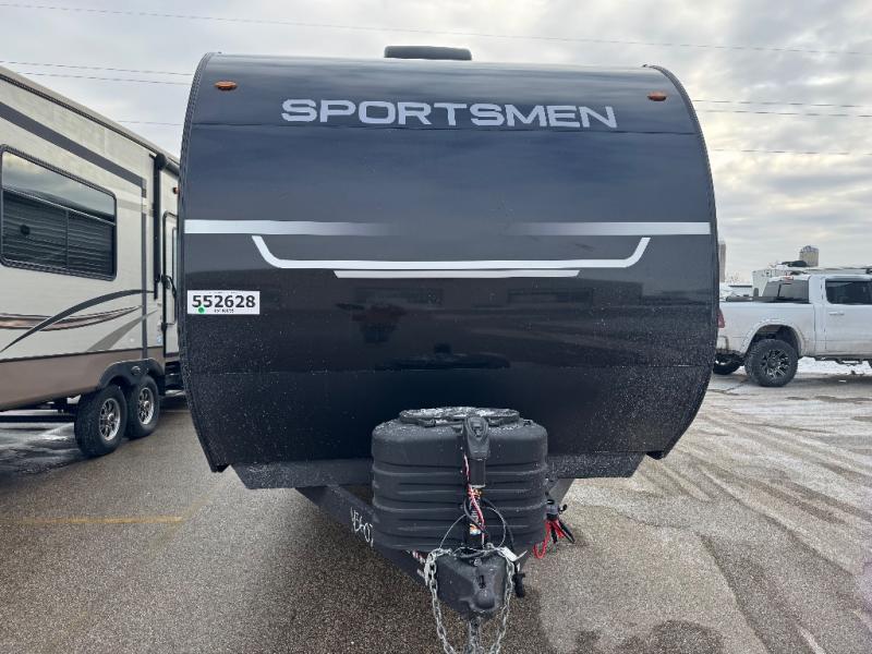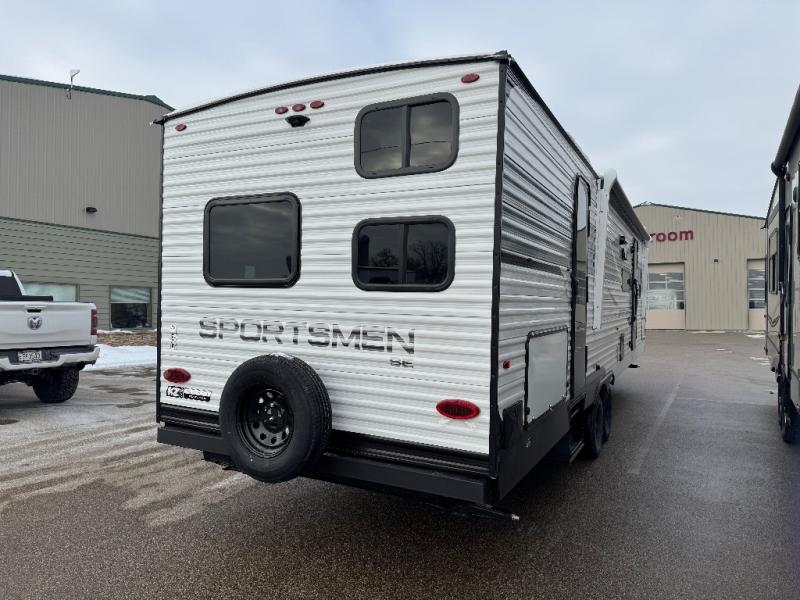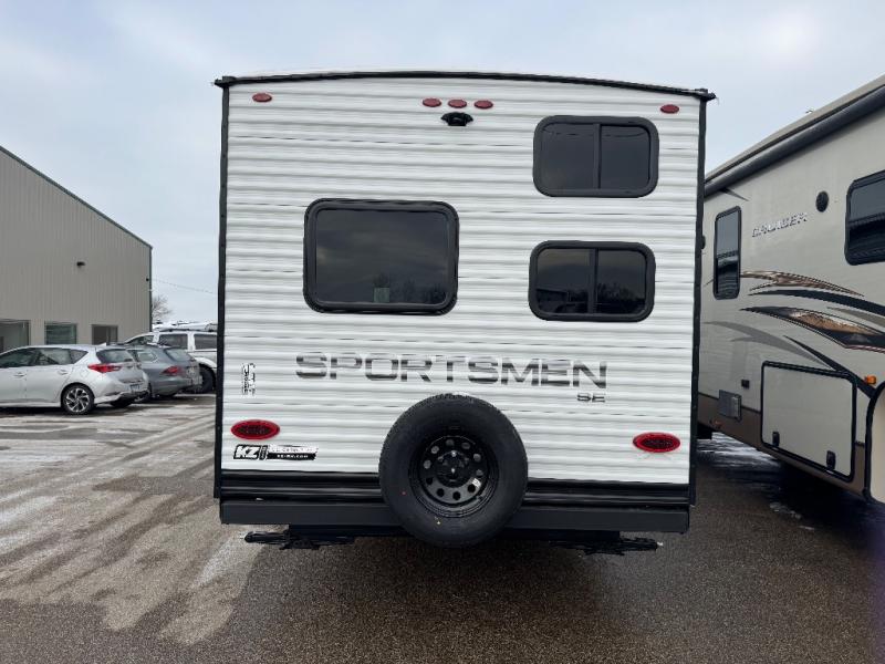 Each Sportsmen SE travel trailer and toy hauler by KZ is constructed with KZ exclusive tough shield exterior metal, a one-piece seamless walk-on Tufflex roofing material, and diamond plate rock guard to protect your unit from road debris. You will appreciate the extra large baggage doors for stowing away your gear when not in use, and tinted windows to help keep the harmful sun rays out plus keeping it cooler inside. Some of the exterior conveniences found in the mandatory Advantage Package are the solid folding steps with a large folding grab handle for easy entry and exit, a full glass friction hinged entry door, plus an exterior shower for your pets or to rinse off before you head inside. You'll also appreciate the nitrogen-filled tires, solar and backup camera prep, plus a Leash Latch with a bonus beverage opener. You'll feel right at home inside with linoleum flooring throughout, a 13,500 BTU air conditioner, large overhead cabinets, a shower surround, and much more!