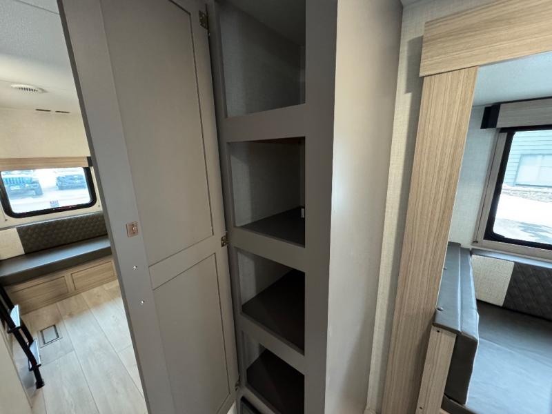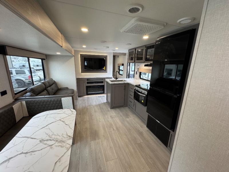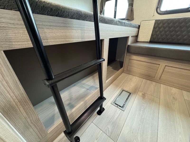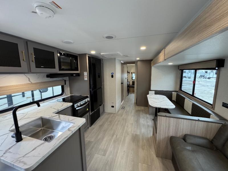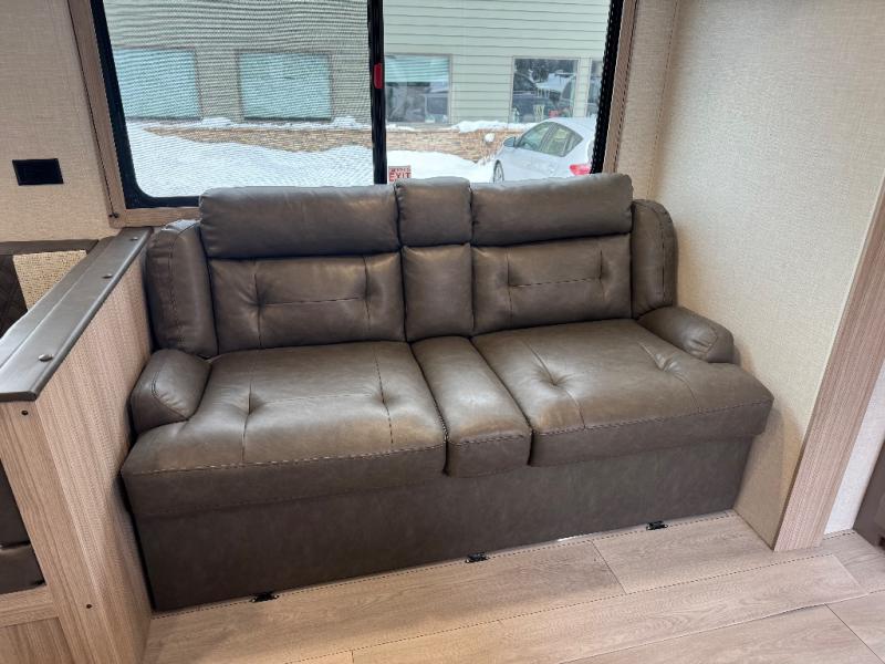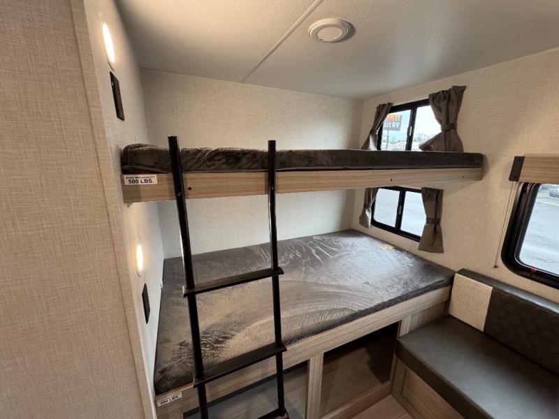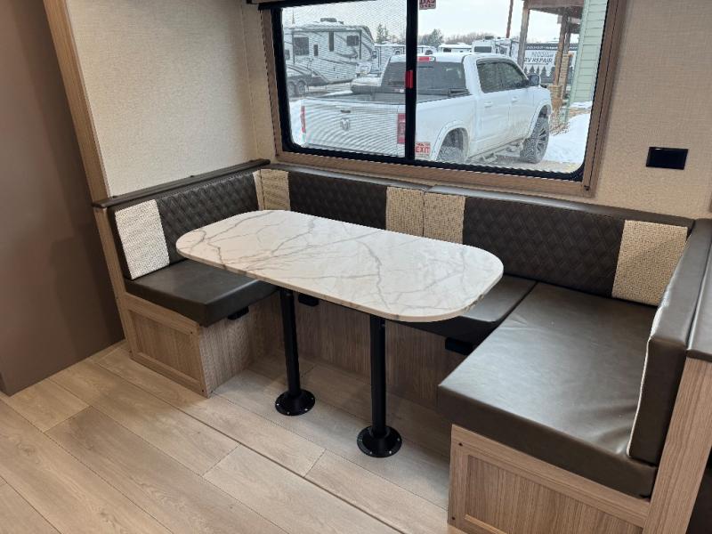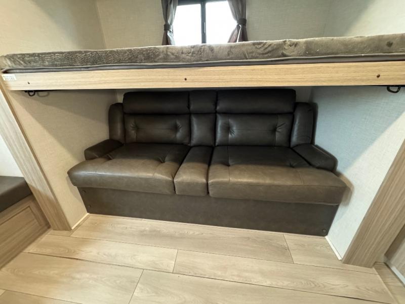 If you've been looking for a travel trailer with plenty of space for your family or group of friends, look no further than this one! The private bunkhouse includes two bunks, plus a third bunk across the room and a jiffy sofa below. There is also a bench seat here, and the full bath is close by for convenience. Everyone can gather in the main living area at the 80" U-shaped dinette, and there is a 64" sofa here for more seating space. If the weather is nice, head outdoors to relax under the 20' power awning with LED lights as the cook prepares dinner on the outside griddle!