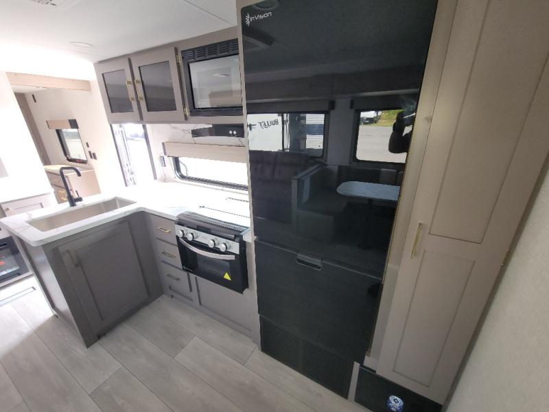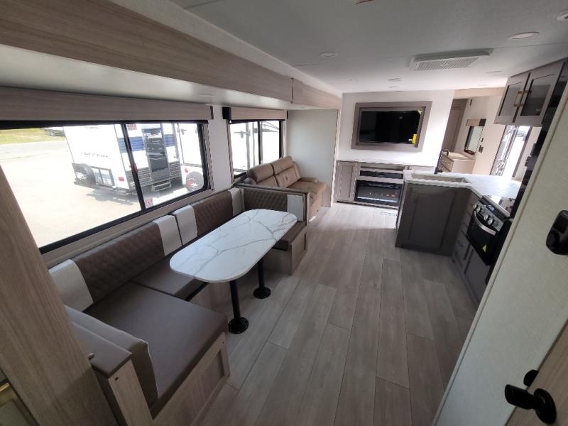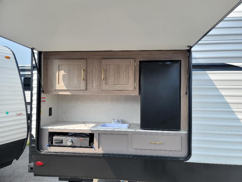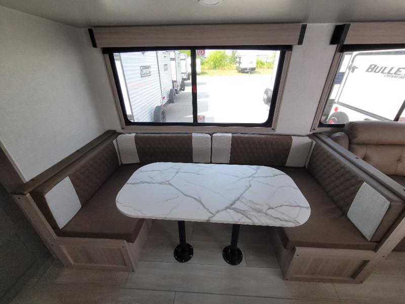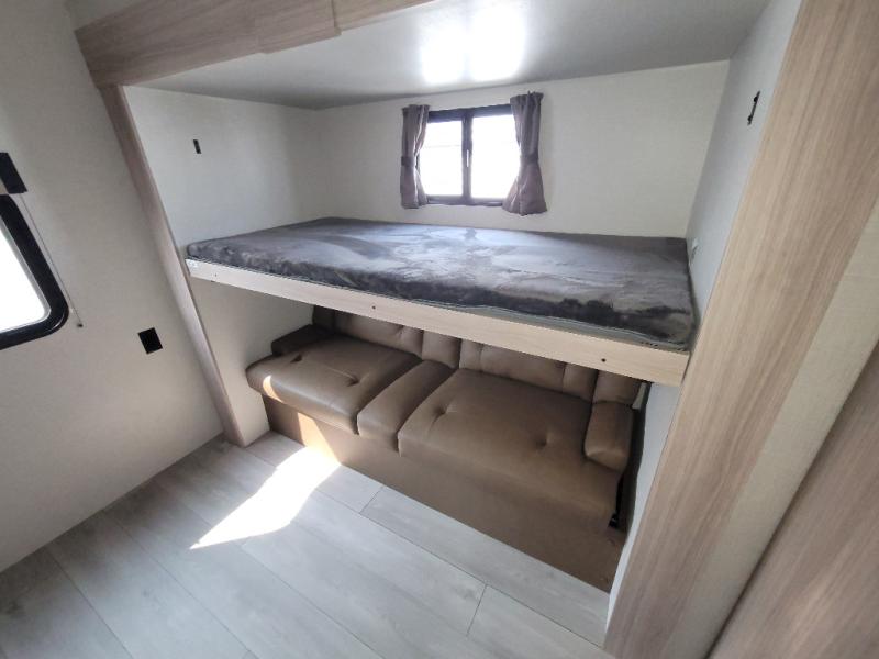 If you've been looking for a travel trailer with plenty of space for your family or group of friends, look no further than this one! The private bunkhouse includes a bunk/closet plus a jackknife sofa with a hinge bunk above. And the full bath is close by for convenience. Everyone can gather in the main living area at the U-shaped dinette, and there is a sofa here for more seating space. If the weather is nice, head outdoors to relax under the 20' power awning with LED lights as the cook prepares dinner on the outside griddle!