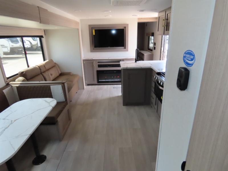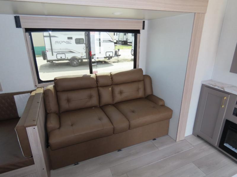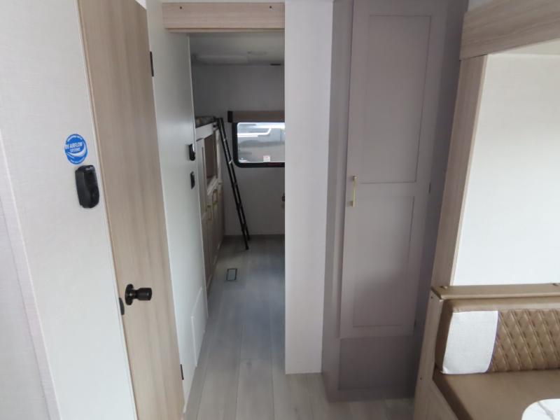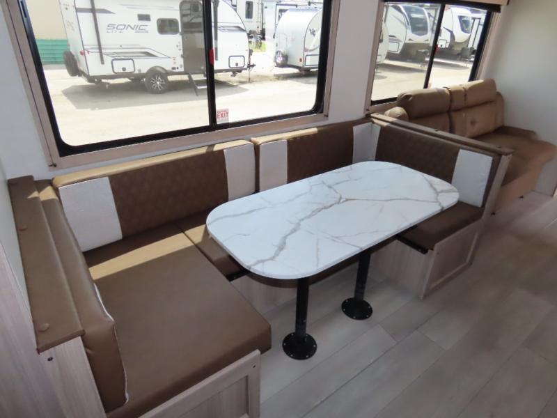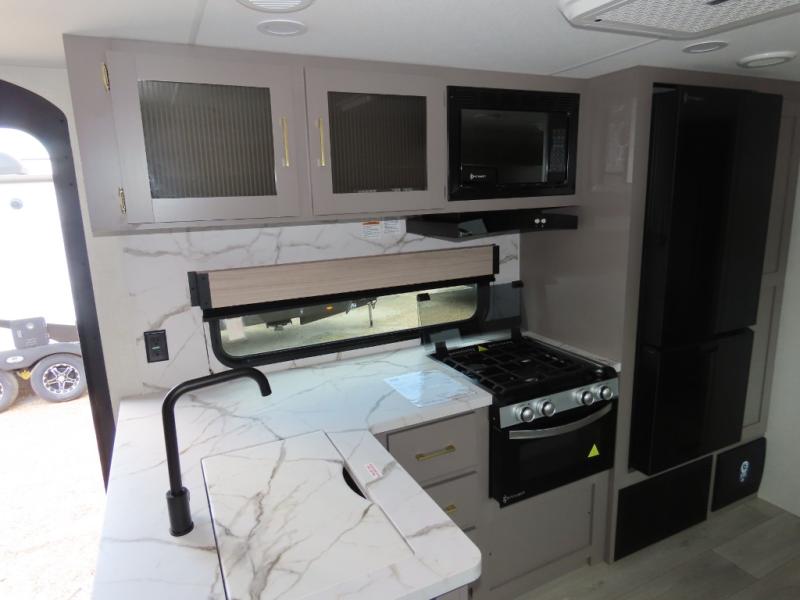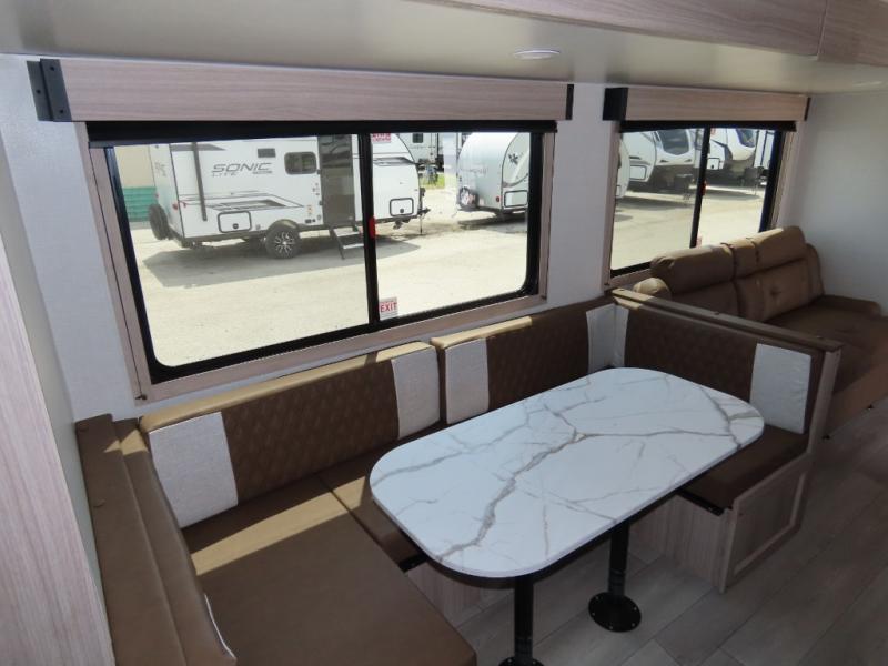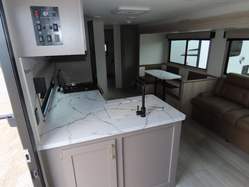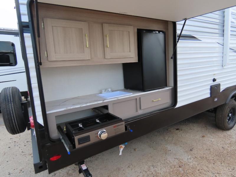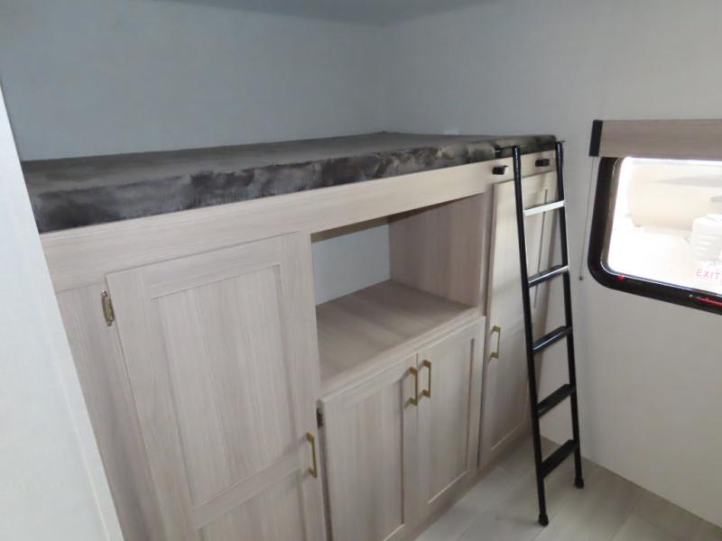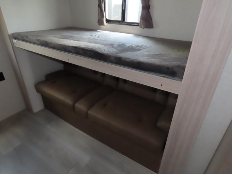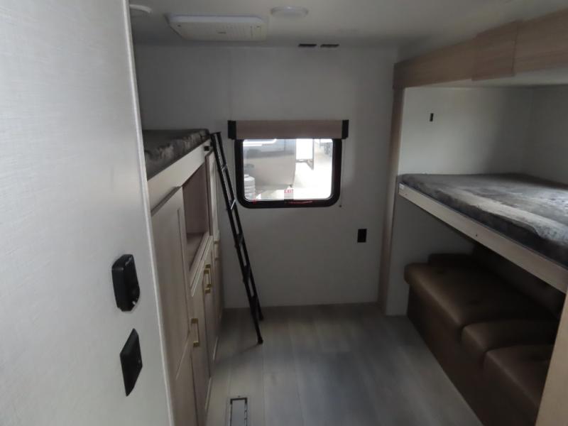 If you've been looking for a travel trailer with plenty of space for your family or group of friends, look no further than this one! The private bunkhouse includes a bunk/closet plus a jackknife sofa with a hinge bunk above. And the full bath is close by for convenience. Everyone can gather in the main living area at the U-shaped dinette, and there is a sofa here for more seating space. If the weather is nice, head outdoors to relax under the 20' power awning with LED lights as the cook prepares dinner on the outside griddle!